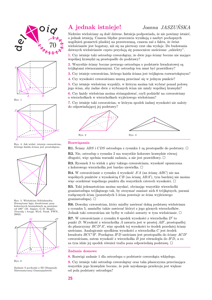 Joanna JASZUŃSKA A jednak istnieje! 70 Niektóre wielościany są dość dziwne. Intuicja podpowiada, że nie powinny istnieć, a jednak istnieją. Czasem błędne przeczucia wynikają z nazbyt pochopnych uogólnień geometrii płaskiej na przestrzenną, czasem zaś z faktu, że świat wielościanów jest bogatszy, niż się na pierwszy rzut oka wydaje. Do budowania dziwnych wielościanów często przydają się pomocnicze sześcienne „szkielety”. 1. Czy istnieje taki ostrosłup czworokątny, że dwie jego ściany boczne nie mające wspólnej krawędzi są prostopadłe do podstawy? 2. Wszystkie ściany boczne pewnego ostrosłupa o podstawie kwadratowej są trójkątami równoramiennymi. Czy ostrosłup ten musi być prawidłowy? 3. Czy istnieje czworościan, którego każda ściana jest trójkątem rozwartokątnym? 4. Czy wysokości czworościanu muszą przecinać się w jednym punkcie? 5. Czy istnieje wielościan wypukły, w którym można tak wybrać ponad połowę jego ścian, aby żadne dwie z wybranych ścian nie miały wspólnej krawędzi? Rys. 1 6. Czy każdy wielościan można striangulować, czyli podzielić na czworościany o wierzchołkach w wierzchołkach wyjściowego wielościanu? 7. Czy istnieje taki czworościan, w którym spodek żadnej wysokości nie należy do odpowiadającej jej podstawy? Rys. 2 Rys. 4. Jak widać, istnieje czworościan, którego każda ściana jest prostokątna. Rys. 3 Rozwiązania R1. Ściany ABS i CDS ostrosłupa z rysunku 1 są prostopadłe do podstawy. R2. Nie, ostrosłup z rysunku 2 ma wszystkie kolorowe krawędzie równej długości, więc spełnia warunki zadania, a nie jest prawidłowy. R3. Rysunek 3 to widok z góry takiego czworościanu, wysokość opuszczona z kolorowego wierzchołka jest bardzo niewielka. R4. W czworościanie z rysunku 4 wysokość A′ A (na ścianę ABC) nie ma wspólnych punktów z wysokością CB (na ścianę ABA′ ), tym bardziej nie można więc oczekiwać wspólnego punktu dla wszystkich czterech wysokości. Rys. 5. Wielościan Schönhardta. Zewnętrzne kąty dwuścienne przy kolorowych krawędziach są mniejsze od 180◦ (M. Aigner, G.M. Ziegler, Dowody z księgi, Wyd. Nauk. PWN, 2002). R5. Taki jedenastościan można uzyskać, obcinając wszystkie wierzchołki graniastosłupa trójkątnego tak, by otrzymać zamiast nich 6 trójkątnych, parami rozłącznych ścian (pozostałych 5 ścian powstaje ze ścian wyjściowego graniastosłupa). R6. Dowolny czworościan, który miałby zawierać dolną podstawę wielościanu z rysunku 5, musiałby także zawierać któryś z jego górnych wierzchołków. Jednak taki czworościan nie byłby w całości zawarty w tym wielościanie. R7. W czworościanie z rysunku 6 spodek wysokości z wierzchołka D′ to punkt D. Wysokość z wierzchołka A zawarta jest w prostej AB ′ , prostopadłej do płaszczyzny BCD′ A′ , więc spodek tej wysokości to środek przedniej ściany sześcianu. Analogicznie spodkiem wysokości z wierzchołka C jest środek kwadratu BCC ′ B ′ . Przekątna B ′ D sześcianu jest prostopadła do ściany ACD′ czworościanu, zatem wysokość z wierzchołka B jest równoległa do B ′ D, a co za tym idzie jej spodek również trafia poza odpowiednią podstawę. Zadania domowe 8. Rozwiąż zadanie 1 dla ostrosłupa o podstawie czworokąta wklęsłego. Rys. 6 Zadanie 9 pochodzi z III Olimpiady Matematycznej Gimnazjalistów. 9. Czy istnieje taki ostrosłup czworokątny oraz taka płaszczyzna przecinająca wszystkie jego krawędzie boczne, że pole uzyskanego przekroju jest większe od pola podstawy ostrosłupa? 25