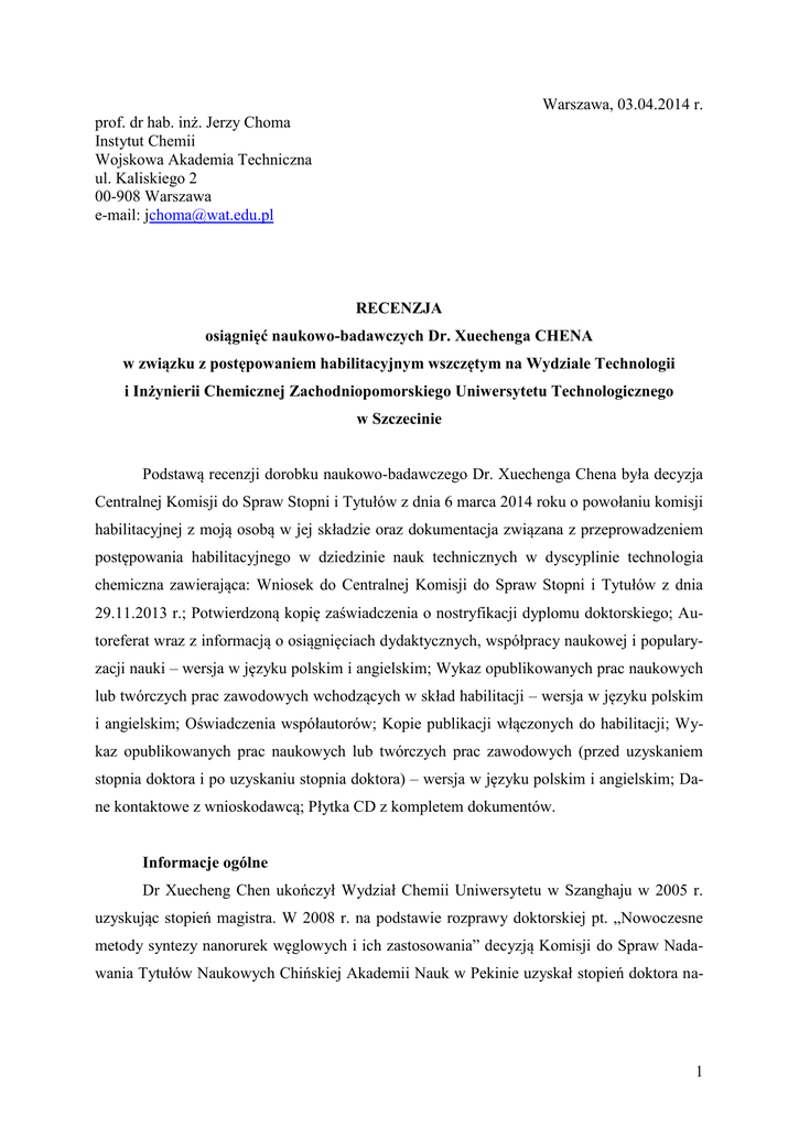 Warszawa, 03.04.2014 r. prof. dr hab. inż. Jerzy Choma Instytut Chemii Wojskowa Akademia Techniczna ul. Kaliskiego 2 00-908 Warszawa e-mail: [email protected] RECENZJA osiągnięć naukowo-badawczych Dr. Xuechenga CHENA w związku z postępowaniem habilitacyjnym wszczętym na Wydziale Technologii i Inżynierii Chemicznej Zachodniopomorskiego Uniwersytetu Technologicznego w Szczecinie Podstawą recenzji dorobku naukowo-badawczego Dr. Xuechenga Chena była decyzja Centralnej Komisji do Spraw Stopni i Tytułów z dnia 6 marca 2014 roku o powołaniu komisji habilitacyjnej z moją osobą w jej składzie oraz dokumentacja związana z przeprowadzeniem postępowania habilitacyjnego w dziedzinie nauk technicznych w dyscyplinie technologia chemiczna zawierająca: Wniosek do Centralnej Komisji do Spraw Stopni i Tytułów z dnia 29.11.2013 r.; Potwierdzoną kopię zaświadczenia o nostryfikacji dyplomu doktorskiego; Autoreferat wraz z informacją o osiągnięciach dydaktycznych, współpracy naukowej i popularyzacji nauki – wersja w języku polskim i angielskim; Wykaz opublikowanych prac naukowych lub twórczych prac zawodowych wchodzących w skład habilitacji – wersja w języku polskim i angielskim; Oświadczenia współautorów; Kopie publikacji włączonych do habilitacji; Wykaz opublikowanych prac naukowych lub twórczych prac zawodowych (przed uzyskaniem stopnia doktora i po uzyskaniu stopnia doktora) – wersja w języku polskim i angielskim; Dane kontaktowe z wnioskodawcą; Płytka CD z kompletem dokumentów. Informacje ogólne Dr Xuecheng Chen ukończył Wydział Chemii Uniwersytetu w Szanghaju w 2005 r. uzyskując stopień magistra. W 2008 r. na podstawie rozprawy doktorskiej pt. „Nowoczesne metody syntezy nanorurek węglowych i ich zastosowania” decyzją Komisji do Spraw Nadawania Tytułów Naukowych Chińskiej Akademii Nauk w Pekinie uzyskał stopień doktora na- 1 uk przyrodniczych w dyscyplinie chemia fizyczna. Promotorem przewodu doktorskiego był prof. Junhui He. Praca doktorska obroniona została z wyróżnieniem. W lipcu 2008 r. Dr X. Chen został zatrudniony na stanowisku adiunkta naukowobadawczego w Wydziale Technologii i Inżynierii Chemicznej Zachodniopomorskiego Uniwersytetu Technologicznego w Szczecinie, a następnie został przeniesiony na etat adiunkta naukowo-dydaktycznego w tym samym wydziale i w tej samej uczelni. Na tym stanowisku jest zatrudniony do dnia dzisiejszego. Ocena cyklu publikacji Najważniejszym osiągnięciem naukowo-badawczym Dr. Xuechenga Chena stanowiącym podstawę do wszczęcia postępowania habilitacyjnego był cykl dwunastu artykułów naukowych i jednego komunikatu naukowego. Autor zatytułował je jako "Badania możliwości zastosowania nowych nanomateriałów opartych na węglu do przyszłych istotnych społecznie aplikacji". Można mieć uwagi do samego sformułowania tego tytułu, lecz nie brzmienie tytułu jest przedmiotem oceny. Wszystkie artykuły zostały opublikowane w czasopismach znajdujących się w bazie Journal Citation Reports o wskaźniku oddziaływania (Impact Factor) zmieniającym się w przedziale od 1.469 (Physica Status Solidi A) do 5.831 (Chemistry - A European Journal). Całkowita liczba cytowań omawianych prac według bazy Web of Science Core Collection w dn. 03.04.2014 r. zmieniała się od 17 (Journal of Physical Chemistry C) do 0 (dla sześciu prac opublikowanych między innymi np. w czasopiśmie ACS Applied Materials & Interfaces, Chemistry - An Asian Journal czy Colloids and Surfaces A). Łączna liczba cytowań prac, które stanowiły podstawę wszczęcia postępowania habilitacyjnego wynosiła zaledwie 42, co daje średnią 3.2 cytowań na pracę, co jest wartością małą. Na korzyść Habilitanta warto podkreślić, że spośród 13. przedłożonych prac w 11. pracach jest on pierwszym autorem, a w 1. jedynym autorem. Z przedłożonych oświadczeń innych współautorów wynika, że Dr X. Chen miał pierwszoplanowy udział w powstaniu tych prac. Tak więc nie mam najmniejszej wątpliwości, że cykl publikacji jaki przedkłada Kandydat powstał przy jego głównym udziale. Zainteresowania naukowo-badawcze Dr. X. Chena dotyczą otrzymywania, badania właściwości i zastosowania nanomateriałów węglowych i krzemionkowych. Do najważniejszych osiągnięć Dr. X. Chena zaliczam: 1) Opracowanie prostej metody otrzymywania mezoporowatych sfer węglowych z uporządkowanymi mezoporami z wykorzystaniem kulistych matryc krzemionkowych SiO2/mSiO2 o budowie rdzeń-otoczka (core-shell) oraz etylenu jako prekursora węglowego. 2 2) Zastosowanie tych mezoporowatych sfer węglowych jako materiału anodowego w bateriach litowo-jonowych oraz jako elektrody w superkondensatorach. 3) Otrzymanie nanostruktur złożonych z nanoporowatego rdzenia węglowego (z dodatkiem ditlenku cyny) pokrytego otoczką z nieporowatego węgla i próby wykorzystania tych nanostruktur w bateriach litowo-jonowych. 4) Otrzymanie sfer krzemionkowych z dużymi nanootworami (o średnicy ok. 10 nm) do magazynowania dużych cząsteczek organicznych, które mogą być uwalniane z wnętrza tych sfer. 5) Opracowanie układu złożonego z nanorurek węglowych zamykanych kulistymi korkami krzemionkowymi do kontrolowanego dozowania leków. Moim zdaniem uzyskane i opublikowane wyniki są ważne również dlatego, że mają znaczenie praktyczne. Część z tych wyników została zgłoszona do opatentowania łącznie w formie czterech patentów. W mojej ocenie dorobek naukowy zaprezentowany w postaci 13. oryginalnych prac jest dobry i dlatego z całą odpowiedzialnością stwierdzam, że jest wystarczający na to, aby ubiegać się o stopień doktora habilitowanego nauk technicznych. Pewnym niedostatkiem tego dorobku jest moim zdaniem zbyt mała liczba cytowań prac, szczególnie tych opublikowanych w latach 2010-2012. Dlaczego tak się dzieje i jak to zmienić? Na tak postawione pytanie odpowiedzi musi poszukać sam Dr X. Chen i jego współpracownicy. Natomi