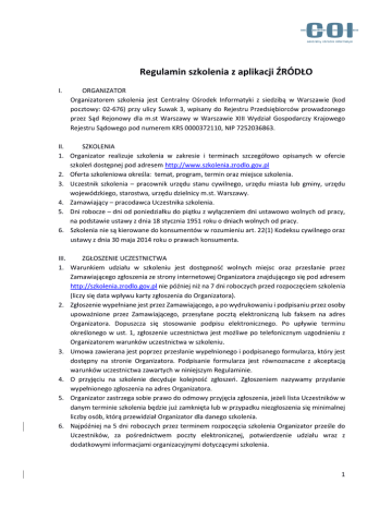 Regulamin szkolenia z aplikacji ŹRÓDŁO I. ORGANIZATOR Organizatorem szkolenia jest Centralny Ośrodek Informatyki z siedzibą w Warszawie (kod pocztowy: 02-676) przy ulicy Suwak 3, wpisany do Rejestru Przedsiębiorców prowadzonego przez Sąd Rejonowy dla m.st Warszawy w Warszawie XIII Wydział Gospodarczy Krajowego Rejestru Sądowego pod numerem KRS 0000372110, NIP 7252036863. II. SZKOLENIA 1. Organizator realizuje szkolenia w zakresie i terminach szczegółowo opisanych w ofercie szkoleń dostępnej pod adresem http://www.szkolenia.zrodlo.gov.pl 2. Oferta szkoleniowa określa: temat, program, termin oraz miejsce szkolenia. 3. Uczestnik szkolenia – pracownik urzędu stanu cywilnego, urzędu miasta lub gminy, urzędu wojewódzkiego, starostwa, urzędu dzielnicy m.st. Warszawy. 4. Zamawiający – pracodawca Uczestnika szkolenia. 5. Dni robocze – dni od poniedziałku do piątku z wyłączeniem dni ustawowo wolnych od pracy, na podstawie ustawy z dnia 18 stycznia 1951 roku o dniach wolnych od pracy. 6. Szkolenia nie są kierowane do konsumentów w rozumieniu art. 22(1) Kodeksu cywilnego oraz ustawy z dnia 30 maja 2014 roku o prawach konsumenta. III. ZGŁOSZENIE UCZESTNICTWA 1. Warunkiem udziału w szkoleniu jest dostępność wolnych miejsc oraz przesłanie przez Zamawiającego zgłoszenia ze strony internetowej Organizatora znajdującego się pod adresem http://szkolenia.zrodlo.gov.pl nie później niż na 7 dni roboczych przed rozpoczęciem szkolenia (liczy się data wpływu karty zgłoszenia do Organizatora). 2. Zgłoszenie wypełniane jest przez Zamawiającego, a po wydrukowaniu i podpisaniu przez osoby upoważnione przez Zamawiającego, przesyłane pocztą elektroniczną lub faksem na adres Organizatora. Dopuszcza się stosowanie podpisu elektronicznego. Po upływie terminu określonego w ust. 1, zgłoszenie uczestnictwa jest możliwe po telefonicznym uzgodnieniu z Organizatorem warunków uczestnictwa w szkoleniu. 3. Umowa zawierana jest poprzez przesłanie wypełnionego i podpisanego formularza, który jest dostępny na stronie Organizatora. Podpisanie formularza jest równoznaczne z akceptacją warunków uczestnictwa zawartych w niniejszym Regulaminie. 4. O przyjęciu na szkolenie decyduje kolejność zgłoszeń. Zgłoszeniem nazywamy przysłanie wypełnionego zgłoszenia na adres Organizatora. 5. Organizator zastrzega sobie prawo do odmowy przyjęcia zgłoszenia, jeżeli lista Uczestników w danym terminie szkolenia będzie już zamknięta lub w przypadku niezgłoszenia się minimalnej liczby osób, którą przewidział Organizator dla danego szkolenia. 6. Najpóźniej na 5 dni roboczych przez terminem rozpoczęcia szkolenia Organizator prześle do Uczestników, za pośrednictwem poczty elektronicznej, potwierdzenie udziału wraz z dodatkowymi informacjami organizacyjnymi dotyczącymi szkolenia. 1 IV. CENY SZKOLEŃ I WARUNKI PŁATNOŚCI 1. Szkolenia odbywają się nieodpłatnie. 2. Organizator nie zapewnia dojazdu ani zakwaterowania. V. REZYGNACJA Z UCZESTNICTWA – ODSTĄPIENIE OD UMOWY 1. Odstąpienie od Umowy powinno być przesłane w formie faksu lub poczty elektronicznej do Organizatora na adres: Centralny Ośrodek Informatyki, Warszawa 02-676, ul. Suwak 3 oraz podpisane przez upoważnioną osobę ze strony Zamawiającego. VI. ZMIANY TERMINU SZKOLENIA 1. Organizator zastrzega sobie prawo do zmiany terminu szkolenia. 2. Zamawiający zgłaszający Uczestników szkolenia ma prawo zmieniać osoby delegowane na szkolenie, aż do chwili jego rozpoczęcia. Zmiana powinna nastąpić w takiej samej formie, jak zgłoszenie. VII. REKLAMACJE Zamawiający może dokonać reklamacji składając Organizatorowi oświadczenie w formie listu poleconego, faksu lub poczty elektronicznej, w okresie do 30 dni od daty zakończenia szkolenia. VIII. OCHRONA DANYCH OSOBOWYCH 1. Administratorem bazy danych osobowych Uczestników przekazywanych przez Zamawiającego jest Organizator. 2. Zgodnie z Ustawą o ochronie danych osobowych z dnia 29 sierpnia 1997 roku, Organizator nie przekazuje, nie sprzedaje i nie użycza zgromadzonych danych osobowych Uczestników innym podmiotom. Dane osobowe Uczestników podane przez Zamawiającego (imię i nazwisko, adres Zamawiającego, numer telefonu służbowego Uczestnika, adres e-mailowy Uczestnika) służą wyłącznie do celów komunikacji pomiędzy Uczestnikiem a Organizatorem. 3. W przypadku wyrażenia przez Uczestnika dodatkowej zgody, dane osobowe będą przetwarzane przez Organizatora w celu informowania go o nowych promocjach i usługach. 4. Uczestnik ma prawo wglądu do swoich danych osobowych, poprawiania ich oraz żądania ich usunięcia. IX. OBOWIĄZYWANIE I ZMIANY REGULAMINU 1. Niniejszy Regulamin obowiązuje od dnia 2 września 2016 roku. 2. Zmiany Regulaminu wchodzą w życie w terminie wskazanym przez Organizatora szkolenia, nie wcześniej jednak, niż od daty udostępnienia ich na stronie http://szkolenia.zrodlo.gov.pl 3. Zmiana Regulaminu nie ma wpływu na warunki sprzedaży oferowanych usług oraz warunki akcji promocyjnych dotyczących zgłoszeń przesłanych przed datą wejścia w życie takiej zmiany. 2