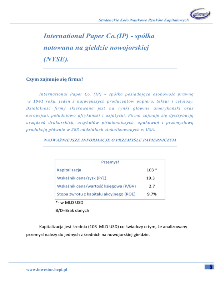 Studenckie Koło Naukowe Rynków Kapitałowych International Paper Co.(IP) - spółka notowana na giełdzie nowojorskiej (NYSE). Czym zajmuje się firma? International Paper Co. (IP) – spółka posiadająca osobowość prawną w 1941 roku. Jeden z największych producentów papieru, tektur i celulozy. Działalność firmy skierowana jest na rynki głównie amerykański oraz europejski, południowo afrykański i azjatycki. Firma zajmuje się dystrybucją urządzeń drukarskich, artykułów piśmienniczych, opakowań i przemysłową produkcją głównie w 283 oddziałach zlokalizowanych w USA. NAJWAśNIEJSZE INFORMACJE O PRZEMYŚLE PAPIERNICZYM Przemysł Kapitalizacja 103 * Wskaźnik cena/zysk (P/E) 19.3 Wskaźnik cena/wartość księgowa (P/BV) 2.7 Stopa zwrotu z kapitału akcyjnego (ROE) 9.7% *- w MLD USD B/D=Brak danych Kapitalizacja jest średnia (103 MLD USD) co świadczy o tym, że analizowany przemysł należy do jednych z średnich na nowojorskiej giełdzie. www.inwestor.hepi.pl 1 Studenckie Koło Naukowe Rynków Kapitałowych NAJWAśNIEJSZE INFORMACJE O SPÓŁCE Okres 2007 2006 2005 Przychody* 21,995.0 21,700.0 20,721.0 Zysk brutto* 5,747.0 5,366.0 5,517.0 Zysk netto* 1,050.0 1,100.0 -35.0** Zysk na akcję EPS 2.15 2.25 -0.07 Stopa dywidendy 1.0 1.0 1.0 2007 rok Kapitalizacja* 17.05 Wskaźnik cena/zysk (P/E) 3.15 Stopa zwrotu z aktywów (ROA) 3.69% Stopa zwrotu z kapitału akcyjnego (ROE) -42.98% Dochód na akcje 46.198 Kwartalny wzrost przychodów (YOY) -4.00% EBIDA 2.72 Kwartalny wzrost zysku (YOY) B/D Wskaźnik Beta 0.93 Roczna stopa zwrotu Data wypłaty dywidendy 3.66% 15.03.2007 W czwartek na giełdzie nowojorskiej akcje International Paper zarobiły 1.39% do 37.68 USD, dzięki czemu ich łączna wartość wzrosła do 17.05 mld USD. Spółka International Paper jest w dobrej kondycji finansowej, co potwierdza wypracowany przez spółkę zysk netto w wysokości 1.05 MLD USD. Wzrost zysku netto spółki wykazuje tendencje wzrostową co jest informacją korzystną dla inwestorów. www.inwestor.hepi.pl 2 Studenckie Koło ło Naukowe Rynków Kapitałowych Wskaźnik cena/zysk Spółka Przemysł 3,15 19,3 Następną ważną informacją na którą trzeba zwrócić uwagę jest wartość wskaźnika Beta (0.93), ), którego akcje wykazują dużo większą zmienność w porównaniu z indeksem S&P 100 co oznacza, że International Paper jest walorem defensywnym dla la inwestorów długoterminowych. Jeżeli indeks S&P 100 wzrośnie o 1% to analizowana alizowana spółka wzrośnie o 0.93%. %. Natomiast w sytuacji, sytuacj gdy indeks S&P 100 spadnie o 1% to International Paper spadnie o 0.93%. Wartość wskaźnika ROE dla International Paper (-42.98%) jest niższa niż średnia wartość dla analizowanego przemysłu (9.7%) ( co oznacza, że spółka osiągnęła niższą stopę zwrotu z kapitału własnego niż średnia dla całego przemysłu co jest informacją negatywną. Wskaźnik cena/zysk jaki odnotowała spółka (3.15) jest bardzo niski w porównaniu z średnią dla pozostałych spółek (19.3) ( ) co jest informacją bardzo negatywną. Wnioski: Analizowana spółka charakteryzuje się słabymi mi wskaźnikami co wpływa negatywnie tywnie dla potencjalnych inwestorów długoterminowych. Jedynie wypracowany przez spółkę półkę zysk netto wpływa korzystnie dla potencjalnych inwestorów. Natomiast niski poziom wskaźnika ROE oraz niski ki poziom wskaźnika cena/zysk wpływają negatywnie. Analizując powyższe dane można stwierdzić, że spółka wpływa negatywnie tywnie dla inwestora długoterminowego. www.inwestor.hepi.pl 3 Studenckie Koło Naukowe Rynków Kapitałowych Zestawienie porównawcze Nazwa spółki IP MWV WY International Paper Company MeadWestvaco Corp. Weyerhaeuser Company Akcja której firmy będzie miała szacunkowo największy wzrost ceny? Cena obecna 37.68 33.04 81.35 26.06 81.27 126.54 -30.84% 145.97% 55.55% 30.23 95.46 189.26 -19.78% 188.92% 132.64% Cena na koniec roku finansowego Zmiana ceny w % Cena na przyszły rok finansowy Zmiana ceny w % Jaki poziom przychodów i zysku netto odnotowała spółka w ciągu ostatnich 12-miesięcy? Przychody* 22.00 6.53 21.90 Zysk netto* 1.28 93.00** 355.00** Jaki wzrost przychodów i zysku netto odnotowała spółka? Wzrost przychodów B/D 5.80% -0.70% Wzrost zysku netto B/D -21.80% -37.60% Jaki jest stosunek ceny akcji do zysku? Wskaźnik cena/zysk (P/E) 11.90 64.50 55.50 Jak kształtowała się cena akcji w ciągu ostatnich 12-miesięcy? Zmiana ceny w ciągu ostatnich 3- miesięcy 14.7% 11.0% 8.3% 11.6% 21.4% 27.9% 3.7% 15.9% 15.4% 2.71 730.00 3.10 Zmiana ceny w ciągu ostatnich 6- miesięcy Zmiana ceny w ciągu ostatnich 12- miesięcy EBIDA * www.inwestor.hepi.pl 4 Studenckie Koło Naukowe Rynków Kapitałowych 2.149 0.513 -1.078 B/D B/D 49,887 -13.20% 9.10% -1.90% 17.05 6.03 19.42 Zysk na akcję (EPS) Pracownicy Kwartalna stopa wzrostu (YOY) Kapitalizacja * *= w MLD USD Łączna wartość akcji International Paper wynosi 17.05 mld USD. Spółka ma przewagę nad pozostałymi spółkami, w skład której wchodzą: firma w zakresie produkcji i wprowadzania na rynek systemów zbiorczego pakowania wtórnego MeadWestvaco Corp. oraz wielka korporacja z przemysłu drzewnego Weyerhaeuser. International Paper wyprzedza MeadWestvaco i Weyerhaeuser pod względem poziomu przychodów i zysków. W 2007 roku firma International Paper zarobiła netto 1.28 mld USD. Przychody International Paper wyniosły 22 mld dolarów i były gorsze od wyniku pozostałych konkurentów MeadWestvaco, która osiągnęła sprzedaż na poziomie 6,53 mld USD, a Weyerhaeuser 21.90 mld USD. International Paper sukcesywnie poprawia wyniki i konsekwentnie zwiększa swoje zyski. Miniony rok był trzecim z rzędu, w którym firma zwiększyła przychody jak i zysk netto. Wartość wskaźnika informująca inwestorów o wielkości zysku jaki przypada na jedną akcję (EPS) jest najwyższą wartością w powyższym zestawieniu, co jest informacją bardzo pozytywną