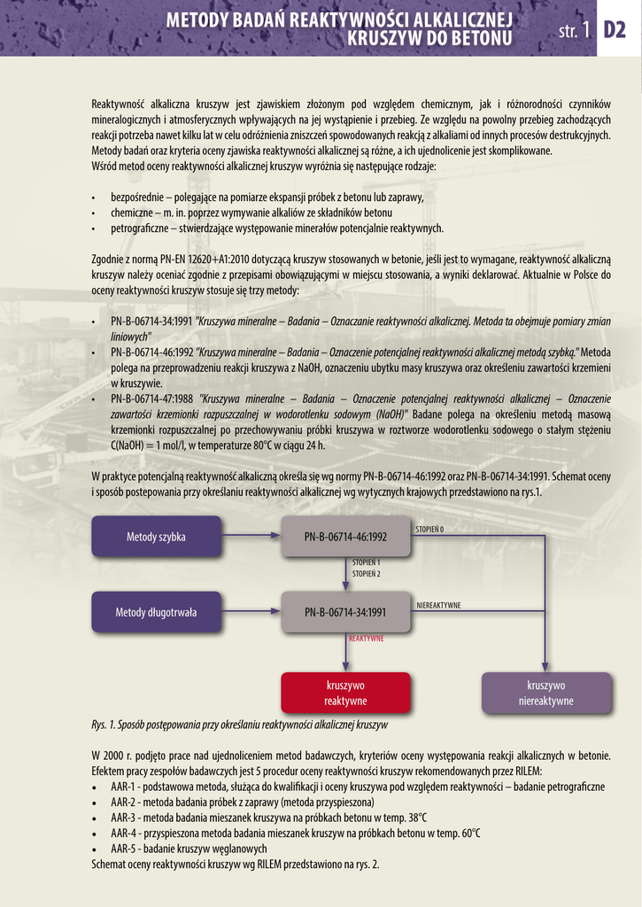 Metody badań reaktywności alkalicznej kruszyw do betonu str. 1 d2 Reaktywność alkaliczna kruszyw jest zjawiskiem złożonym pod względem chemicznym, jak i różnorodności czynników mineralogicznych i atmosferycznych wpływających na jej wystąpienie i przebieg. Ze względu na powolny przebieg zachodzących reakcji potrzeba nawet kilku lat w celu odróżnienia zniszczeń spowodowanych reakcją z alkaliami od innych procesów destrukcyjnych. Metody badań oraz kryteria oceny zjawiska reaktywności alkalicznej są różne, a ich ujednolicenie jest skomplikowane. Wśród metod oceny reaktywności alkalicznej kruszyw wyróżnia się następujące rodzaje: • • • bezpośrednie – polegające na pomiarze ekspansji próbek z betonu lub zaprawy, chemiczne – m. in. poprzez wymywanie alkaliów ze składników betonu petrograficzne – stwierdzające występowanie minerałów potencjalnie reaktywnych. Zgodnie z normą PN-EN 12620+A1:2010 dotyczącą kruszyw stosowanych w betonie, jeśli jest to wymagane, reaktywność alkaliczną kruszyw należy oceniać zgodnie z przepisami obowiązującymi w miejscu stosowania, a wyniki deklarować. Aktualnie w Polsce do oceny reaktywności kruszyw stosuje się trzy metody: • • • PN-B-06714-34:1991 "Kruszywa mineralne – Badania – Oznaczanie reaktywności alkalicznej. Metoda ta obejmuje pomiary zmian liniowych" PN-B-06714-46:1992 "Kruszywa mineralne – Badania – Oznaczenie potencjalnej reaktywności alkalicznej metodą szybką." Metoda polega na przeprowadzeniu reakcji kruszywa z NaOH, oznaczeniu ubytku masy kruszywa oraz określeniu zawartości krzemieni w kruszywie. PN-B-06714-47:1988 "Kruszywa mineralne – Badania – Oznaczenie potencjalnej reaktywności alkalicznej – Oznaczenie zawartości krzemionki rozpuszczalnej w wodorotlenku sodowym (NaOH)" Badane polega na określeniu metodą masową krzemionki rozpuszczalnej po przechowywaniu próbki kruszywa w roztworze wodorotlenku sodowego o stałym stężeniu C(NaOH) = 1 mol/l, w temperaturze 80°C w ciągu 24 h. W praktyce potencjalną reaktywność alkaliczną określa się wg normy PN-B-06714-46:1992 oraz PN-B-06714-34:1991. Schemat oceny i sposób postepowania przy określaniu reaktywności alkalicznej wg wytycznych krajowych przedstawiono na rys.1. Metody szybka PN-B-06714-46:1992 stopień 0 stopień 1 stopień 2 Metody długotrwała PN-B-06714-34:1991 niereaktywne reaktywne kruszywo reaktywne kruszywo niereaktywne Rys. 1. Sposób postępowania przy określaniu reaktywności alkalicznej kruszyw W 2000 r. podjęto prace nad ujednoliceniem metod badawczych, kryteriów oceny występowania reakcji alkalicznych w betonie. Efektem pracy zespołów badawczych jest 5 procedur oceny reaktywności kruszyw rekomendowanych przez RILEM: • AAR-1 - podstawowa metoda, służąca do kwalifikacji i oceny kruszywa pod względem reaktywności – badanie petrograficzne • AAR-2 - metoda badania próbek z zaprawy (metoda przyspieszona) • AAR-3 - metoda badania mieszanek kruszywa na próbkach betonu w temp. 38°C • AAR-4 - przyspieszona metoda badania mieszanek kruszyw na próbkach betonu w temp. 60°C • AAR-5 - badanie kruszyw węglanowych Schemat oceny reaktywności kruszyw wg RILEM przedstawiono na rys. 2. str. 2 AAR-1 Przeprowadzone badanie petrograficzne? TAK nie petrografia klasa I klasa II lub III krzemionka IIS (III S) krzemionka i węglan IISC (III SC) szybkie badanie składu ziarnowego szybkie badanie składu ziarnowego nie AAR-2 przyspieszone badanie beleczek z zaprawy niereaktywne TAK nie AAR-2 badanie AAR-5 mikrobeleczek reaktywne lub potencjalnie reaktywne niereaktywne reaktywne lub potencjalnie reaktywne Dalsze badania niewymagane AAR-4 60°C ASR i / lub reaktywność węglanowa i / lub Przyspieszone badania beleczek betonowych Rys. 2. Schemat oceny reaktywności kruszyw według procedury RILEM AAR-3 38°C Badania beleczek betonowych badanie rozszerzalności betonu Tylko ASR również szybkie badania składu ziarnowego TAK węglan IIC (III C) str. 3 Wobec braku ogólnoeuropejskich norm badań reaktywności alkalicznej kruszyw, stosowane są także procedury wg norm amerykańskich ASTM. Większość norm opisujących badania i stosowanych w różnych krajach powstało na bazie norm ASTM. Najczęściej stosowanymi metodami badań są: • ASTM C295 – badanie petrograficzne kruszyw do betonu • ASTM C289 – ocena potencjalnej reaktywności kruszywa (metoda chemiczna) • ASTM C1260 – badanie ekspansji alkalicznej próbek z zapraw metodą przyspieszoną • ASTM C227 – badanie ekspansji próbek z zapraw metodą długoterminową • ASTM C1293 – badanie ekspansji beleczek z betonu metodą długoterminową Metody petrograficzne Metody petrograficzne są pierwszym etapem do oceny potencjalnej reaktywności kruszyw. Chociaż badania petrograficzne są bardzo przydatne do identyfikacji składników, nie wykazują czy badany materiał spowoduje ekspansję. Stąd konieczne jest wykonanie dalszych badań celem potwierdzenia, czy badane kruszywo jest reaktywne. Rozpoznanie składników opiera się na określeniu typów mineralogicznych i petrograficznych kruszyw. Metodyka zawarta w procedurze AAR-1 jest stosowana do wszystkich kruszyw jako badanie rozpoznawcze. Poza metodą mikroskopową, w przypadku kruszyw węglanowych, stosuje się jeszcze metody fluorescencyjnej analizy rentgenowskiej (XRF) oraz elektronowej mikroskopii skaningowej (SEM). Na tej podstawie, z uwzględnieniem dominującego charakteru chemicznego kruszywa (krzemionkowe S, węglanowe C, krzemionkowo-węglanowe SC), wyróżnia się 3 klasy: • klasa I: kruszywo najprawdopodobniej niereaktywne; • klasa II: kruszywo wątpliwie reaktywne; • klasa III: kruszywo bardzo prawdopodobnie reaktywne. Dla kruszyw z klas II i III zalecane jest wykonanie dalszych badań z wykorzystaniem pozostałych metod. Metodykę zawartą w normie ASTM C295 można stosować zarówno do oceny reaktywności alkalia-krzemiany, jak i alkalia