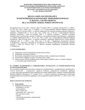 KONKURSY PRZEDMIOTOWE ORGANIZOWANE PRZEZ KUJAWSKO-POMORSKIEGO KURATORA OŚWIATY W WOJEWÓDZTWIE KUJAWSKO-POMORSKIM dla uczniów szkół podstawowych i gimnazjów w roku szkolnym 2014/2015 REGULAMIN SZCZEGÓŁOWY WOJEWÓDZKIEGO KONKURSU PRZEDMIOTOWEGO Z JĘZYKA ANGIELSKIEGO DLA UCZNIÓW SZKÓŁ PODSTAWOWYCH Na podstawie art. 31 ust 1 pkt. 7 ustawy z dnia 7 września 1991 r. o systemie oświaty (Dz. U. z 2004 r. Nr 256, poz. 2572 z późn. zm.), w związku z § 1-5 rozporządzenia Ministra Edukacji Narodowej i Sportu z dnia 29 stycznia 2002 r. w sprawie organizacji oraz sposobu przeprowadzania konkursów, turniejów i olimpiad (Dz. U. Nr 13, poz. 125, z późn. zm.), § 20 ust. 7 rozporządzenia Ministra Edukacji Narodowej z dnia 30 kwietnia 2007 r. w sprawie warunków i sposobu oceniania, klasyfikowania i promowania uczniów i słuchaczy oraz przeprowadzania sprawdzianów i egzaminów w szkołach publicznych (Dz. U. Nr 83, poz. 562, z późn. zm.), rozporządzenia Ministra Edukacji Narodowej z dnia 28 maja 2010 r. w sprawie świadectw, dyplomów państwowych i innych druków szkolnych (Dz. U. z 2014 r. poz. 893) oraz § 30 pkt. 1 Regulaminu Kuratorium Oświaty w Bydgoszczy, stanowiący załącznik do Zarządzenia Nr 40/2013 Kujawsko-Pomorskiego Kuratora Oświaty z dnia 28 czerwca 2013 r. w sprawie ustalenia Regulaminu Kuratorium Oświaty w Bydgoszczy. I. CELE KONKURSU: 1. 2. 3. 4. 5. Wspieranie rozwoju umiejętności językowych uczniów. Pobudzanie twórczego myślenia. Rozwijanie umiejętności stosowania zdobytej wiedzy w praktycznym działaniu. Promowanie osiągnięć uczniów, ich nauczycieli i szkół. Motywowanie szkół do podejmowania różnorodnych działań w pracy z uczniem zdolnym w rozwijaniu jego zainteresowań. II. ZAKRES WIADOMOŚCI I UMIEJĘTNOŚCI WYMAGANY NA POSZCZEGÓLNYCH ETAPACH KONKURSU Na wszystkich etapach uczeń powinien wykazać się wiadomościami i umiejętnościami określonymi w Celach kształcenia – wymaganiach ogólnych Podstawy programowej kształcenia ogólnego, w części dotyczącej przedmiotu język angielski na II etapie edukacyjnym, zgodnie z Rozporządzeniem Ministra Edukacji Narodowej z 27 sierpnia 2012 r. w sprawie podstawy programowej wychowania przedszkolnego oraz kształcenia ogólnego w poszczególnych typach szkół (Dz. U. z 2012 r. poz. 977), a także: Zakres merytoryczny konkursu: I. Etap szkolny 1. Zagadnienia gramatyczne: - przedimek a, an, the, - saxon genitive, - there is, there are, - czasowniki „be,” „have got,” - this, that, these, those, - zaimki, - rzeczowniki policzalne i niepoliczalne, - przymiotnik, - przysłówek, - przyimek, - czasowniki modalne, - pierwszy okres warunkowy, - tryb rozkazujący, - have to, - going to, - określniki ilości, - pytania ogólne i szczegółowe. 2. Czasy gramatyczne: - Present Simple, - Present Continuous, - Past Simple, - Future Simple. 3. Słownictwo: - szkoła, - zwierzęta, - dom, - jedzenie, - opis osoby, - dolegliwości, - pogoda, - natura / elementy krajobrazu, - nazwy budynków użyteczności publicznej/sklepy. 4. Rozumienie tekstu czytanego. 5. Pisanie. 6. Umiejętność reagowania na zwroty. II. Etap rejonowy 1. Wszystkie zagadnienia z etapu szkolnego. 2. Zagadnienia gramatyczne: - strona bierna wymienionych w etapie szkolnym i rejonowym czasów i form gramatycznych, - one, ones, - too, enough. 3. Czasy gramatyczne: - Present Perfect, - Past Continuous. 4. Słownictwo: - kraje i narodowości, - instrumenty muzyczne, - sporty i miejsca ich uprawiania, - sprzęt sportowy, - media. III. Etap wojewódzki 1. Wszystkie zagadnienia z etapu szkolnego oraz rejonowego. 2. Rozumienie tekstu słuchanego. 3. Umiejętność wypowiadania się w języku angielskim. III. LITERATURA DLA UCZNIA i inne źródła informacji: Podręczniki i zeszyty ćwiczeń do przedmiotu język angielski dla klas IV-VI szkoły podstawowej, zatwierdzone do użytku szkolnego przez MEN. IV.UCZESTNICY KAŻDEGO ETAPU KONKURSU POWINNI DYSPONOWAĆ przyborami do pisania: pióro lub długopis. Na konkurs nie wolno przynosić żadnych urządzeń telekomunikacyjnych. Organizatorzy poszczególnych etapów nie ponoszą odpowiedzialność za przyniesiony i zostawiony w szatni sprzęt telekomunikacyjny. Wszelkich informacji dotyczących organizacji i przebiegu konkursu udzielają: Przewodnicząca Komisji Wojewódzkiej z Języka Angielskiego: Adam Wnorowski, [email protected], [email protected], tel. 52 3497603 Wiceprzewodnicząca Komisji Wojewódzkiej z Języka Angielskiego: Wanda Wakuła, tel. 56 660 03 80 Wszystkie załączniki do regulaminu do pobrania na stronie www.kuratorium.bydgoszcz.uw.gov.pl Załącznik nr 1 do Regulaminu szczegółowego Wojewódzkiego Konkursu Przedmiotowego z Języka Angielskiego dla uczniów szkół podstawowych Obszary działania rejonowych komisji Konkursu Przedmiotowego z Języka Angielskiego dla uczniów szkół podstawowych. Nazwa komisji i zasięg terytorialny Komisja rejonowa nr 1: miasto Toruń, powiaty: chełmiński, golubskodobrzyński, toruński: Komisja rejonowa nr 2: miasto Bydgoszcz Komisja rejonowa nr 3 powiaty: bydgoski, nakielski, część świeckiego (gminy: Pruszcz, Świecie, Drzycim, Bukowiec, Świekatowo Komisja rejonowa nr 4 miasto Włocławek, powiaty: aleksandrowski, lipnowski, włocławski Siedziba komisji rejonowej Imię i nazwisko (miejsce przeprowadzenia przewodniczącego etapu rejonowego) Szkoła Podstawowa nr 3 im. mgr Joanna Tosik kpt. Jana Drzewieckiego w Toruniu, ul. Legionów 210 Szkoła Podstawowa Bydgoszczy, ul. Goszczyńskiego 3 Szkoła Podstawowa Bydgoszczy, ul. Zygmunta Berlinga 3 nr 63 w mgr Magdalena Sulkowska Seweryna nr 66 w mgr Aleksandra Brzykcy Generała Szkoła Podstawowa nr 23 we mgr Karina Caban Włocławku, ul. Stanisława Wyspiańskiego 3 Komisja rejonowa nr 5 powiaty: inowrocławski, mogileński, żniński, radziejowski Szkoła Podstawowa nr 2 w mgr Anna Ćwikła - Gerc Inowrocławiu, ul. Najświętszej Marii Panny 22 Komisja rejonowa nr 6 miasto G