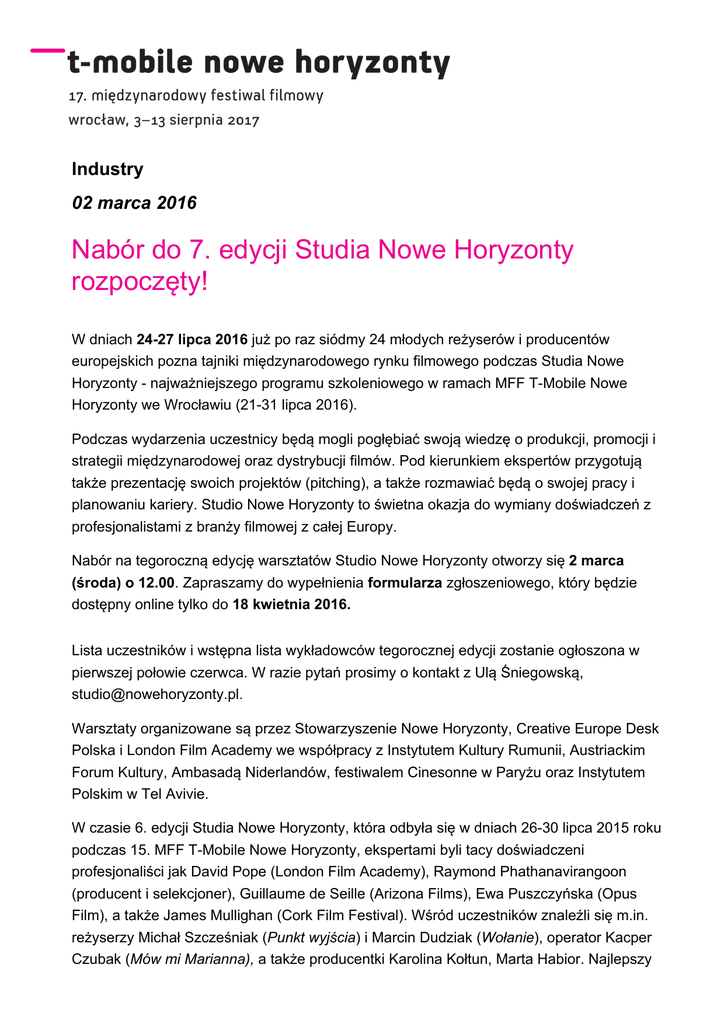 Industry 02 marca 2016 Nabór do 7. edycji Studia Nowe Horyzonty rozpoczęty! W dniach 24-27 lipca 2016 już po raz siódmy 24 młodych reżyserów i producentów europejskich pozna tajniki międzynarodowego rynku filmowego podczas Studia Nowe Horyzonty - najważniejszego programu szkoleniowego w ramach MFF T-Mobile Nowe Horyzonty we Wrocławiu (21-31 lipca 2016). Podczas wydarzenia uczestnicy będą mogli pogłębiać swoją wiedzę o produkcji, promocji i strategii międzynarodowej oraz dystrybucji filmów. Pod kierunkiem ekspertów przygotują także prezentację swoich projektów (pitching), a także rozmawiać będą o swojej pracy i planowaniu kariery. Studio Nowe Horyzonty to świetna okazja do wymiany doświadczeń z profesjonalistami z branży filmowej z całej Europy. Nabór na tegoroczną edycję warsztatów Studio Nowe Horyzonty otworzy się 2 marca (środa) o 12.00. Zapraszamy do wypełnienia formularza zgłoszeniowego, który będzie dostępny online tylko do 18 kwietnia 2016. Lista uczestników i wstępna lista wykładowców tegorocznej edycji zostanie ogłoszona w pierwszej połowie czerwca. W razie pytań prosimy o kontakt z Ulą Śniegowską, [email protected]. Warsztaty organizowane są przez Stowarzyszenie Nowe Horyzonty, Creative Europe Desk Polska i London Film Academy we współpracy z Instytutem Kultury Rumunii, Austriackim Forum Kultury, Ambasadą Niderlandów, festiwalem Cinesonne w Paryżu oraz Instytutem Polskim w Tel Avivie. W czasie 6. edycji Studia Nowe Horyzonty, która odbyła się w dniach 26-30 lipca 2015 roku podczas 15. MFF T-Mobile Nowe Horyzonty, ekspertami byli tacy doświadczeni profesjonaliści jak David Pope (London Film Academy), Raymond Phathanavirangoon (producent i selekcjoner), Guillaume de Seille (Arizona Films), Ewa Puszczyńska (Opus Film), a także James Mullighan (Cork Film Festival). Wśród uczestników znaleźli się m.in. reżyserzy Michał Szcześniak (Punkt wyjścia) i Marcin Dudziak (Wołanie), operator Kacper Czubak (Mów mi Marianna), a także producentki Karolina Kołtun, Marta Habior. Najlepszy pitch teamu Bena Branda, Wojtka Stuchlika i Beaty Rzeźniczek nagrodzono sesją tutoringu w LFA oraz ofertą postprodukcji we Wrocławskim CeTA. Jeden z zeszłorocznych ekspertów tak poleca Studio Nowe Horyzonty: 'Studio to jedno z lepiej zorganizowanych i przynoszących najlepsze efekty spotkań rozwijających umiejętności filmowe, w jakich miałem przyjemność uczestniczyć. Wydarzenie gromadzi najważniejsze talenty z Polski i z zagranicy, i zapewnia im warunki do rozwoju projektu oraz jego prezentacji międzynarodowemu środowisku. A do tego odbywa się w czasie jednego z najważniejszych festiwali filmowych w Europie! Gratuluję wszystkim zaangażowanym.' Zapraszamy!