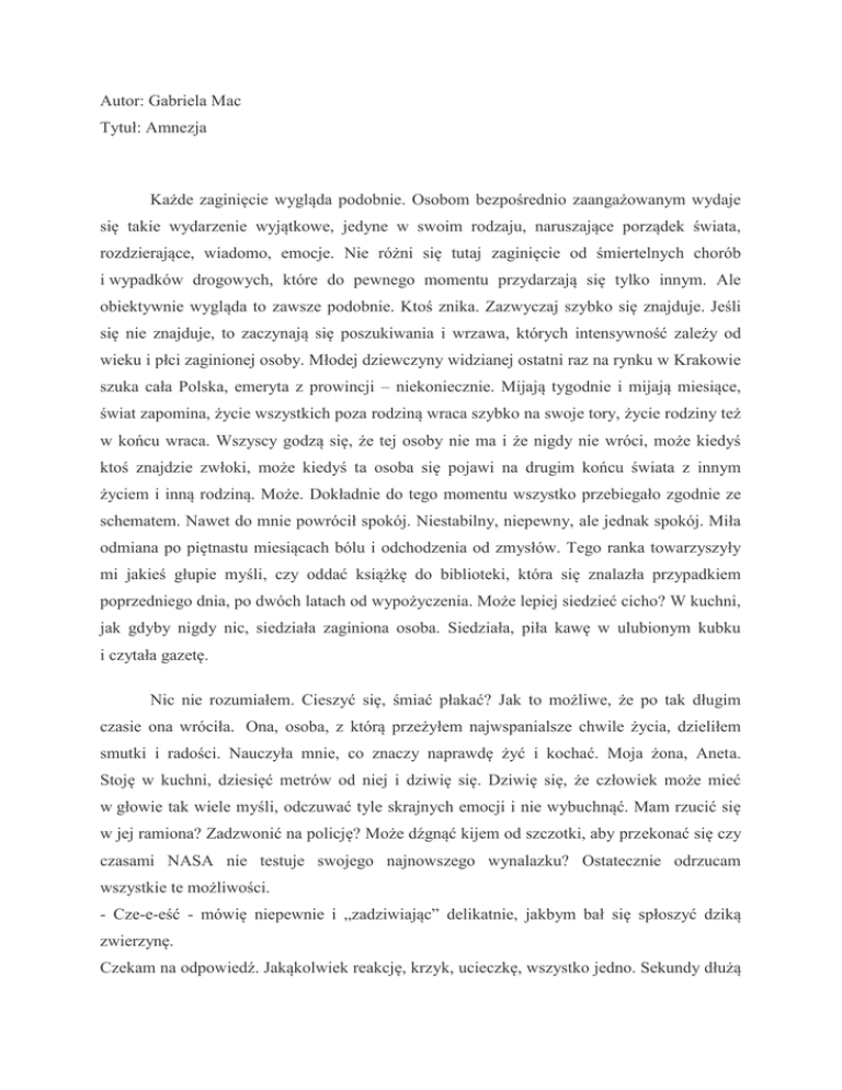Autor: Gabriela Mac Tytuł: Amnezja Każde zaginięcie wygląda podobnie. Osobom bezpośrednio zaangażowanym wydaje się takie wydarzenie wyjątkowe, jedyne w swoim rodzaju, naruszające porządek świata, rozdzierające, wiadomo, emocje. Nie różni się tutaj zaginięcie od śmiertelnych chorób i wypadków drogowych, które do pewnego momentu przydarzają się tylko innym. Ale obiektywnie wygląda to zawsze podobnie. Ktoś znika. Zazwyczaj szybko się znajduje. Jeśli się nie znajduje, to zaczynają się poszukiwania i wrzawa, których intensywność zależy od wieku i płci zaginionej osoby. Młodej dziewczyny widzianej ostatni raz na rynku w Krakowie szuka cała Polska, emeryta z prowincji – niekoniecznie. Mijają tygodnie i mijają miesiące, świat zapomina, życie wszystkich poza rodziną wraca szybko na swoje tory, życie rodziny też w końcu wraca. Wszyscy godzą się, że tej osoby nie ma i że nigdy nie wróci, może kiedyś ktoś znajdzie zwłoki, może kiedyś ta osoba się pojawi na drugim końcu świata z innym życiem i inną rodziną. Może. Dokładnie do tego momentu wszystko przebiegało zgodnie ze schematem. Nawet do mnie powrócił spokój. Niestabilny, niepewny, ale jednak spokój. Miła odmiana po piętnastu miesiącach bólu i odchodzenia od zmysłów. Tego ranka towarzyszyły mi jakieś głupie myśli, czy oddać książkę do biblioteki, która się znalazła przypadkiem poprzedniego dnia, po dwóch latach od wypożyczenia. Może lepiej siedzieć cicho? W kuchni, jak gdyby nigdy nic, siedziała zaginiona osoba. Siedziała, piła kawę w ulubionym kubku i czytała gazetę. Nic nie rozumiałem. Cieszyć się, śmiać płakać? Jak to możliwe, że po tak długim czasie ona wróciła. Ona, osoba, z którą przeżyłem najwspanialsze chwile życia, dzieliłem smutki i radości. Nauczyła mnie, co znaczy naprawdę żyć i kochać. Moja żona, Aneta. Stoję w kuchni, dziesięć metrów od niej i dziwię się. Dziwię się, że człowiek może mieć w głowie tak wiele myśli, odczuwać tyle skrajnych emocji i nie wybuchnąć. Mam rzucić się w jej ramiona? Zadzwonić na policję? Może dźgnąć kijem od szczotki, aby przekonać się czy czasami NASA nie testuje swojego najnowszego wynalazku? Ostatecznie odrzucam wszystkie te możliwości. - Cze-e-eść - mówię niepewnie i „zadziwiając” delikatnie, jakbym bał się spłoszyć dziką zwierzynę. Czekam na odpowiedź. Jakąkolwiek reakcję, krzyk, ucieczkę, wszystko jedno. Sekundy dłużą się niemiłosiernie. Może rzeczywiście lepiej przejść się po tę szczotkę... - Dzień dobry - odpowiada beztroskim tonem, jednocześnie patrząc na mnie tymi swoimi wielkimi, zielonymi oczami. Nie jest to jednak ten sam wzrok, który tak dobrze zapamiętałem. Jest nieobecny, rozkojarzony, pusty. Coś tu jest nie tak. - Gdzie byłaś?... – zapytałem, kładąc szczególny nacisk na ostatnie dwa słowa. - Wyszłam po mleko. - Gdzie jest ta cholerna ukryta kamera?! - wykrzyczałem bardziej do siebie niż do niej. - Nie pamiętam niczego - rzekła. Usiadłem. Zacząłem chaotycznie rozglądać się po całym mieszkaniu, sam nie wiem po co. Chyba miałem nadzieję, że ktoś nagle wyskoczy zza kanapy, krzycząc „Prima Aprilis!". Nic takiego się jednak nie wydarzyło. Powoli zacząłem łączyć wszystko w jedną, spójną całość. Ma amnezję. Pamięta tylko to, co działo się piętnaście miesięcy temu. Czas nagle się zatrzymał. Radość z powrotu Anety mieszała się z ogromnym smutkiem spowodowanym jej stanem. Tylko jak to się stało? Co działo się z nią przez ten czas? Jak wróciła? Nie miałem pojęcia. Wiedziałem jednak jedną rzecz, muszę się tego dowiedzieć. Zrobię wszystko co w mojej mocy, byleby tylko poznać prawdę. Nawet najgorsza, najokrutniejsza prawda będzie lepsza od tej okropnej bezsilności. Rozpocząłem walkę. Walczyłem o naszą wspólną przyszłość. Pierwszą, najrozsądniejszą rzeczą jaką mogłem zrobić było odnalezienie dobrego psychologa. Przez tydzień przeszukiwałem cały Internet, wszelkie fora, gazety, aby znaleźć kogoś odpowiedniego. Było to najgorszych siedem dni w moim życiu. Musiałem patrzeć jak osoba tak bliska mojemu sercu niezupełnie wie co się wokół niej dzieje. Prawie całe dnie przeszukiwała szafki. Ot, tak bez powodu, bezmyślnie. Przypuszczałem, że z powodu szoku jakiego doznała i tak nie całkiem zdaje sobie sprawę z tego, co robi. Znalazłem. Przypadkowo. W gazecie, która od tygodnia leżała na stole. Dużo czytałem, okazało się, że Hubert Cypor jest jednym z najlepszych. Decyzja podjęta. Zadzwoniłem pod podany numer. Odebrał mężczyzna o grubym, dość mrocznym głosie. Szybko przedstawiłem ogólny zarys sytuacji. Rozmówca nie był zbyta wylewny. Jego odpowiedzi były lakoniczne. Po kilkuminutowej rozmowie umówiliśmy się na wtorek. Nie powiadomiłem o tym nawet żony, bałem się. Bałem się tego, że wyjdzie i tym razem już nie wróci. Przyszedł sądny dzień. Pełen niepokoju, z głową pełną wątpliwości i myśli typu „może jednak to jest zbędne i lepiej będzie próbować po prostu prowadzić w miarę normalne życie...". Nie było jednak czasu na dalsze rozmyślania, bo nim się obejrzałem już siedziałam w autobusie zmierzającym w stronę domu pana Huberta. Przez moje zamyślenie nie zauważyłem nawet starszej pani, która uciążliwie wbijała wzrok w mój kark, jakby chciała magicznie zmusić mnie do ustąpienia miejsca. Zwlokłem się wiec leniwie z siedzenia, jednak nie z powodu owej osoby. Zbliżał się nasz przystanek. Z bijącym od nerwów sercem i ręką zaciśniętą kurczowo na przegubie Anety, ruszyłem. Moim oczom okazał się wielki dom otoczony majestatycznym żywopłotem z mnóstwem basenów i jeszcze większą ilością rzeźb przedstawiających dosłownie wszystko od małych zwierząt domowych po ludzi z członami powykręcanymi w wszystkie możliwe strony. Myślami wróci