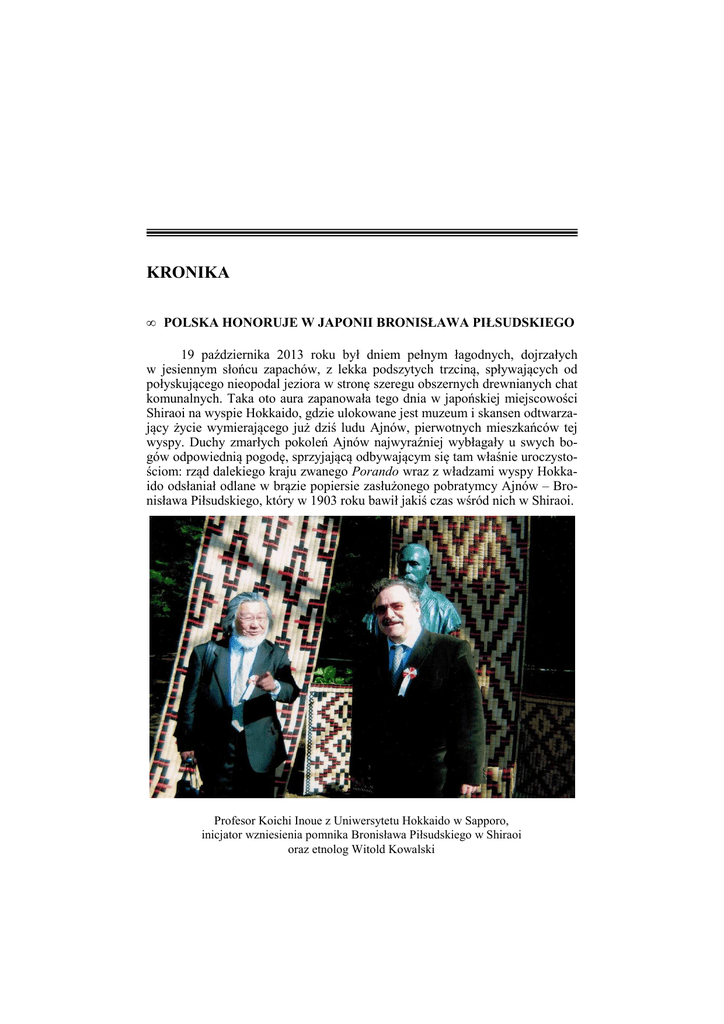 KRONIKA • POLSKA HONORUJE W JAPONII BRONISŁAWA PIŁSUDSKIEGO 19 października 2013 roku był dniem pełnym łagodnych, dojrzałych w jesiennym słońcu zapachów, z lekka podszytych trzciną, spływających od połyskującego nieopodal jeziora w stronę szeregu obszernych drewnianych chat komunalnych. Taka oto aura zapanowała tego dnia w japońskiej miejscowości Shiraoi na wyspie Hokkaido, gdzie ulokowane jest muzeum i skansen odtwarzający życie wymierającego już dziś ludu Ajnów, pierwotnych mieszkańców tej wyspy. Duchy zmarłych pokoleń Ajnów najwyraźniej wybłagały u swych bogów odpowiednią pogodę, sprzyjającą odbywającym się tam właśnie uroczystościom: rząd dalekiego kraju zwanego Porando wraz z władzami wyspy Hokkaido odsłaniał odlane w brązie popiersie zasłużonego pobratymcy Ajnów – Bronisława Piłsudskiego, który w 1903 roku bawił jakiś czas wśród nich w Shiraoi. Profesor Koichi Inoue z Uniwersytetu Hokkaido w Sapporo, inicjator wzniesienia pomnika Bronisława Piłsudskiego w Shiraoi oraz etnolog Witold Kowalski 74 KRONIKA A kolej uroczystości była taka: najpierw w jednej z wielkich chat odbyły się modły zamieszkującej skansen starszyzny dzisiejszych, mocno zjaponizowanych, Ajnów, wśród których zasiadł w wianku ze świeżo nastruganej brzozowej kory minister Dziedzictwa Narodowego kraju Porando – Bohdan Zdrojewski. Następnie zaproszeni goście (dobrze ponad setka osób, gęsto dawał się słyszeć język polski) udała się pod zasłonięty dotąd ogromnymi kolorowymi tatami pomnik wielkiego Bronisława. Po serii okolicznościowych przemówień odsłonięcia dokonał Bohdan Zdrojewski w towarzystwie polskiego ambasadora, wicegubernatora wyspy Hokkaido i dalszych notabli, wśród których wyróżnić trzeba profesora Koichi Inoue, wieloletniego, niestrudzonego propagatora osiągnięć Bronisława wśród Japończyków, a także Rosjan, tych z wyspy Sachalin. Następnie goście udali się do innej z nadjeziornych chat, gdzie odbył się pokaz przeróżnych tańców i rytuałów ajnuskich. Niestety, bariera językowa nie do końca pozwalała obcokrajowcowi docenić kunszt występujących artystów… Po tańcach przyszedł czas na zasłużoną wyżerkę, na którą gości sprosił i powitał żyjący od urodzenia w Japonii wnuk Piłsudskiego – Kazuyasu Kimura. Szampan polał się strumieniami, braterstwo polsko-ajnusko-japońskie pieczętowane było częstym postukiwaniem kieliszków, przy akompaniamencie obowiązkowego pomlaskiwania i zachwytów nad ponętną urodą podawanego asortymentu glonów morskich czy zadziwiająco gładką przeżuwalnością świeżo skrojonego odnóża rzadko tylko (ponoć) trującej ośmiornicy… Piszący te słowa, świadom międzynarodowego wymiaru kulinarnej odpowiedzialności, jaka właśnie spadła na jego niewybredny przełyk, z pobladłym licem kosztował to gotowanego „brown seaweed” (wodorost „brązowy”), to znowu surowe algi (takoż wodorost). I gdy szlachetnym trunkiem zalewał tęsknotę za jakimkolwiek pożywieniem, które by nie trafiło na jego talerz wprost z głębin japońskich mórz, do piszącego te słowa Waszego sprawozdawcy podszedł minister Dziedzictwa Narodowego krainy Porando i zaproponował mu osobistą pomoc w przygotowaniu pełnej, nowej, polskiej edycji „Dziennika”, który młodociany Bronisław Piłsudski pisał w latach 1882-1885. Minister powiedział, iż czytał rosyjskie wydanie „Dziennika” w opracowaniu niżej podpisanego i chce przyczynić się do ich polskiego wydania. Z wrażenia piszący te słowa omal nie odrzucił wchłanianej właśnie porcji tzw. kelpu (morski wodorost). Gdy ochłonął, na znak zawartego paktu opiekun dziedzictwa narodowego kraju znanego jako Porando i Wasz skromny sprawozdawca stuknęli się wyleniałą resztką szampana. Spiżowy pomnik, hołd rządów Polski i Japonii, obietnica wydania „Dziennika” w języku oryginału – takie oto dary słoneczny i pachnący dzień 19 października 2013 roku ofiarował duchom Bronisława Piłsudskiego i jego partnerki – Ciuchsammy. A w gronie żywych towarzyszył im i świętował ten dzień wraz z nimi ich wnuk najrodzeńszy – Kazuyasu Kimura. I ja tam byłem; miód i… hola, hola! To jeszcze nie koniec. Następnego ranka, w mieście Sapporo – stolicy wyspy Hokkaido, na tamtejszym uniwersytecie odbyła się specjalna sesja naukowa poświęcona postaci Bronisława Piłsudskiego. Na wstępie była pompa z udziałem ambasadora RP w Japonii oraz wnuka Bronisława, Kazuyasu Kimury. Potem nastąpiła część seminaryjna: najpierw profesor Koichi Inoue odczytał list od profesora Antoniego Kuczyńskiego z Wrocławia, który, choć zapraszany, nie zdołał przybyć na seminarium. Następnie profesor Ewa Pałasz-Rutkowska z UW przybliżyła słuchaczom zarys stosunków japońsko-polskich w latach życia Bronisława Piłsudskiego. Niestety: KRONIKA 75 wykład był po japońsku, ale równie japońska aparatura audio-wizualna zawiodła na całej linii, tłumaczenie na inne języki nie docierało do słuchawek i taki laik, jak Wasz uważny sprawozdawca wiele (a prawdę powiedziawszy zupełnie nic) nie zrozumiał. Na koniec profesor Alfred Majewicz z Poznania, takoż zasłużony na Bronisławowej niwie, jak PT panowie Kuczyński i Inoue przypomniał drogę ku dzisiejszej chwale naszego bohatera, zawiłe ścieżki, którymi jego dzieła pisane oraz zbiory materialnych artefaktów przedostawały się do świadomości obecnych pokoleń, gdzie obrosły w siłę i przebiły się na poczesne miejsce w globalnej kulturze narodów Europy i Azji. Profesor Majewicz mówił po angielsku, ale – najwyraźniej zmęczony uprzednią utarczką z panią Ewą Pałasz-Rutkowską – japoński sprzęt audio-wizualny podporządkował mu się niemal bez walki i działał tak, jak powinien, czyli rzecz na potrzeby japońskich słuchaczy na ekranie wyświetlał, a w słuchawkach tłumaczył. Uczestnicy u