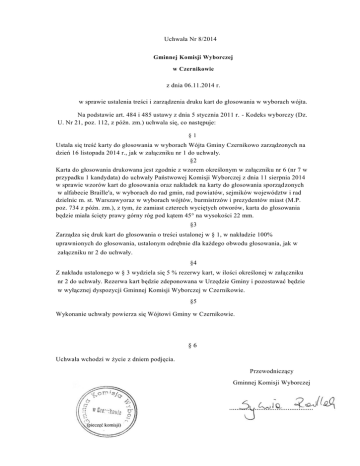 Uchwała Nr 8/2014 Gminnej Komisji Wyborczej w Czernikowie z dnia 06.11.2014 r. w sprawie ustalenia treści i zarządzenia druku kart do głosowania w wyborach wójta. Na podstawie art. 484 i 485 ustawy z dnia 5 stycznia 2011 r. - Kodeks wyborczy (Dz. U. Nr 21, poz. 112, z późn. zm.) uchwala się, co następuje: §1 Ustala się treść karty do głosowania w wyborach Wójta Gminy Czernikowo zarządzonych na dzień 16 listopada 2014 r., jak w załączniku nr 1 do uchwały. §2 Karta do głosowania drukowana jest zgodnie z wzorem określonym w załączniku nr 6 (nr 7 w przypadku 1 kandydata) do uchwały Państwowej Komisji Wyborczej z dnia 11 sierpnia 2014 w sprawie wzorów kart do głosowania oraz nakładek na karty do głosowania sporządzonych w alfabecie Braille'a, w wyborach do rad gmin, rad powiatów, sejmików województw i rad dzielnic m. st. Warszawyoraz w wyborach wójtów, burmistrzów i prezydentów miast (M.P. poz. 734 z późn. zm.), z tym, że zamiast czterech wyciętych otworów, karta do głosowania będzie miała ścięty prawy górny róg pod kątem 45° na wysokości 22 mm. §3 Zarządza się druk kart do głosowania o treści ustalonej w § 1, w nakładzie 100% uprawnionych do głosowania, ustalonym odrębnie dla każdego obwodu głosowania, jak w załączniku nr 2 do uchwały. §4 Z nakładu ustalonego w § 3 wydziela się 5 % rezerwy kart, w ilości określonej w załączniku nr 2 do uchwały. Rezerwa kart będzie zdeponowana w Urzędzie Gminy i pozostawać będzie w wyłącznej dyspozycji Gminnej Komisji Wyborczej w Czernikowie. §5 Wykonanie uchwały powierza się Wójtowi Gminy w Czernikowie. §6 Uchwała wchodzi w życie z dniem podjęcia. Przewodniczący Gminnej Komisji Wyborczej Załącznik Nr 2 do Uchwały Nr 8/2014 Gminnej Komisji Wyborczej w Czernikowie z dnia 06.11.2014 r. Nakład kart do głosowania ogółem Nakład kart do głosowania 95% Rezerwa kart do głosowania 5% 1 1356 1288 68 2 1119 1063 56 3 1036 984 52 4 1450 1377 73 5 1132 1075 57 6 848 806 42 Razem 6941 6593 348 Nr obwodu glosowania
