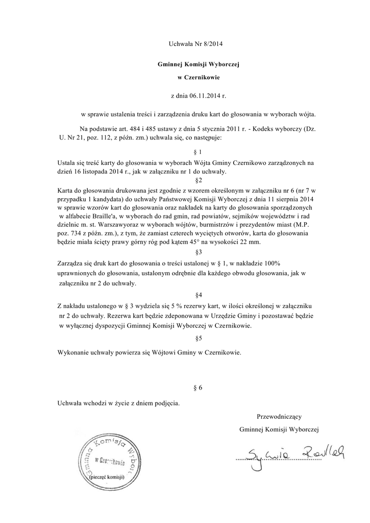 Uchwała Nr 8/2014 Gminnej Komisji Wyborczej w Czernikowie z