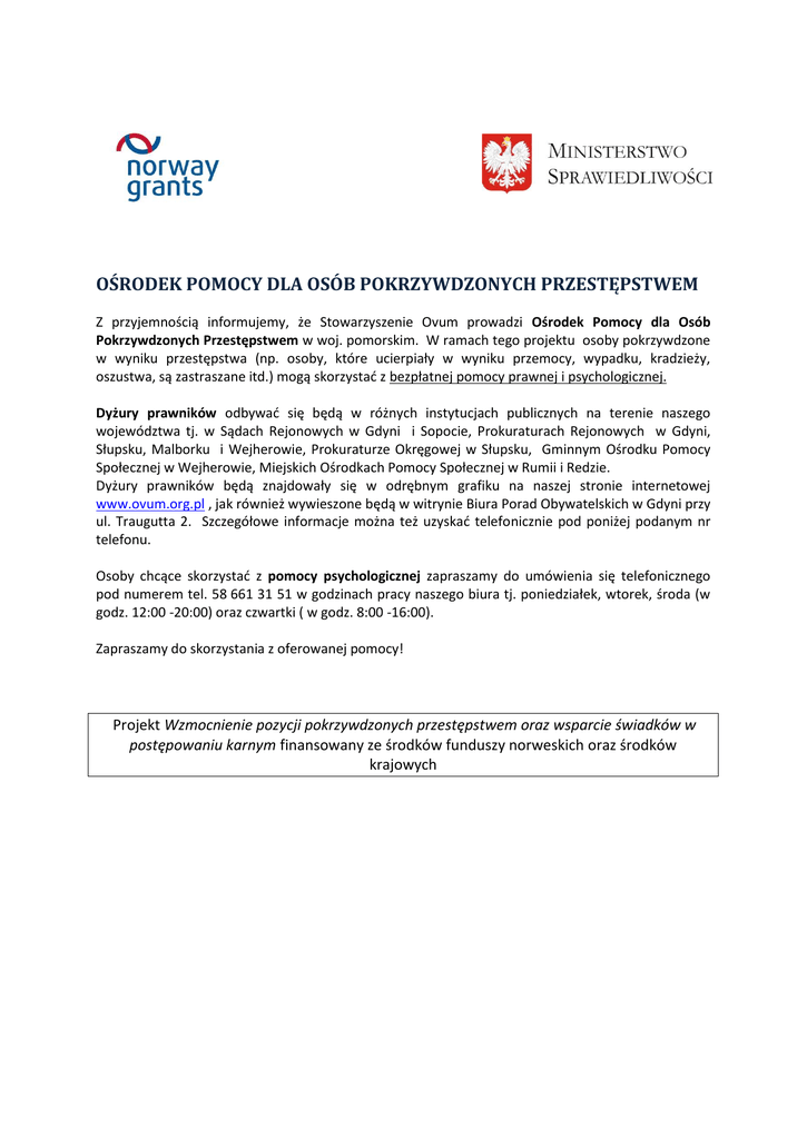 OŚRODEK POMOCY DLA OSÓB POKRZYWDZONYCH PRZESTĘPSTWEM Z przyjemnością informujemy, że Stowarzyszenie Ovum prowadzi Ośrodek Pomocy dla Osób Pokrzywdzonych Przestępstwem w woj. pomorskim. W ramach tego projektu osoby pokrzywdzone w wyniku przestępstwa (np. osoby, które ucierpiały w wyniku przemocy, wypadku, kradzieży, oszustwa, są zastraszane itd.) mogą skorzystać z bezpłatnej pomocy prawnej i psychologicznej. Dyżury prawników odbywać się będą w różnych instytucjach publicznych na terenie naszego województwa tj. w Sądach Rejonowych w Gdyni i Sopocie, Prokuraturach Rejonowych w Gdyni, Słupsku, Malborku i Wejherowie, Prokuraturze Okręgowej w Słupsku, Gminnym Ośrodku Pomocy Społecznej w Wejherowie, Miejskich Ośrodkach Pomocy Społecznej w Rumii i Redzie. Dyżury prawników będą znajdowały się w odrębnym grafiku na naszej stronie internetowej www.ovum.org.pl , jak również wywieszone będą w witrynie Biura Porad Obywatelskich w Gdyni przy ul. Traugutta 2. Szczegółowe informacje można też uzyskać telefonicznie pod poniżej podanym nr telefonu. Osoby chcące skorzystać z pomocy psychologicznej zapraszamy do umówienia się telefonicznego pod numerem tel. 58 661 31 51 w godzinach pracy naszego biura tj. poniedziałek, wtorek, środa (w godz. 12:00 -20:00) oraz czwartki ( w godz. 8:00 -16:00). Zapraszamy do skorzystania z oferowanej pomocy! Projekt Wzmocnienie pozycji pokrzywdzonych przestępstwem oraz wsparcie świadków w postępowaniu karnym finansowany ze środków funduszy norweskich oraz środków krajowych