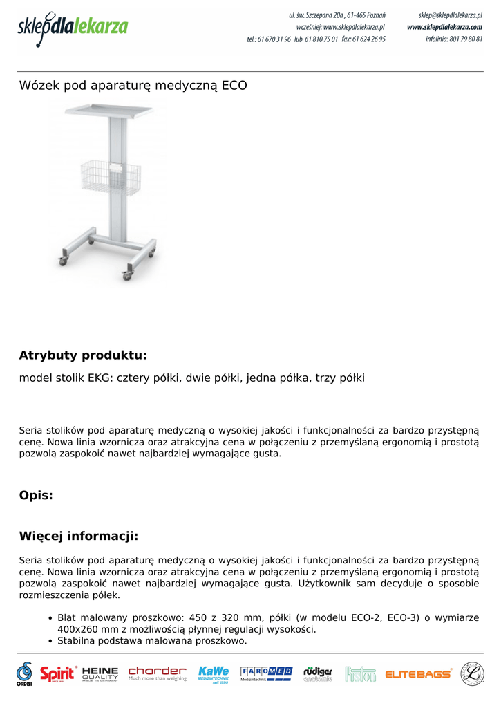 Wózek pod aparaturę medyczną ECO Atrybuty produktu: model stolik EKG: cztery półki, dwie półki, jedna półka, trzy półki Seria stolików pod aparaturę medyczną o wysokiej jakości i funkcjonalności za bardzo przystępną cenę. Nowa linia wzornicza oraz atrakcyjna cena w połączeniu z przemyślaną ergonomią i prostotą pozwolą zaspokoić nawet najbardziej wymagające gusta. Opis: Więcej informacji: Seria stolików pod aparaturę medyczną o wysokiej jakości i funkcjonalności za bardzo przystępną cenę. Nowa linia wzornicza oraz atrakcyjna cena w połączeniu z przemyślaną ergonomią i prostotą pozwolą zaspokoić nawet najbardziej wymagające gusta. Użytkownik sam decyduje o sposobie rozmieszczenia półek. Blat malowany proszkowo: 450 z 320 mm, półki (w modelu ECO-2, ECO-3) o wymiarze 400x260 mm z możliwością płynnej regulacji wysokości. Stabilna podstawa malowana proszkowo. 2 koła z blokadą. Istniej możliwość doposażenia stolika w dodatkowe wyposażenie: Koszyk na kable ze stali zwykłej lakierowanej proszkowo lub chromowanej, z uchwytami do mocowania na szynie instrumentalnej. Kosz na cewniki ze stali kwasoodpornej KO z uchwytem szynowym. Wym. kosza: 110 x 110 x 500 mm. Pojemnik na cewniki z uchwytem szynowym. Uchylny pojemnik z tworzywa. Uchylny pojemnik ze stali kwasoodpornej. Wieszak endoskopu. Wieszak z głowicą kroplówki. Pokrywa uchwytu worka na odpady. Uchwyt worka na odpady. Powered by TCPDF (www.tcpdf.org)