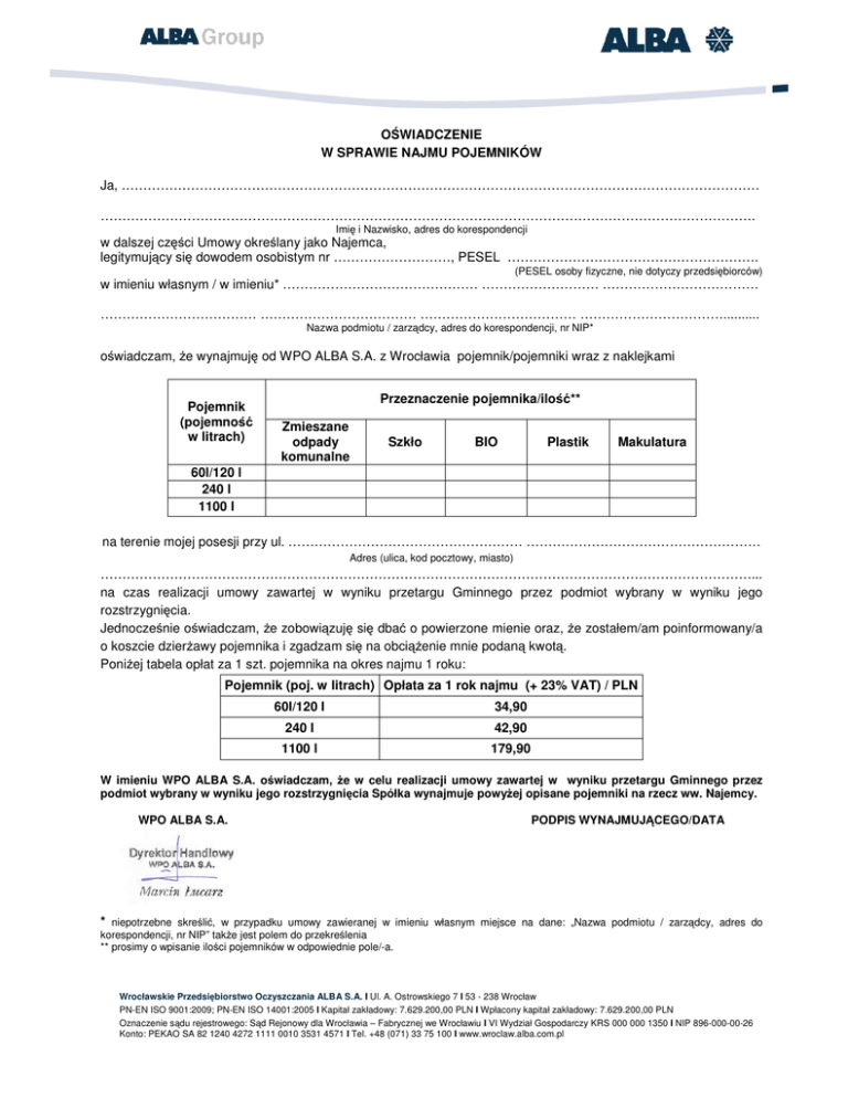 OŚWIADCZENIE W SPRAWIE NAJMU POJEMNIKÓW Ja, ………………………………………………………………………………………………………………………………… ……………………………………………………………………………………………………………………………………. Imię i Nazwisko, adres do korespondencji w dalszej części Umowy określany jako Najemca, legitymujący się dowodem osobistym nr ………………………, PESEL …………………………………………………. (PESEL osoby fizyczne, nie dotyczy przedsiębiorców) w imieniu własnym / w imieniu* ……………………………………… ……………………… ……………………………… ……………………………… ……………………………… ……………………………… …………………………….......... Nazwa podmiotu / zarządcy, adres do korespondencji, nr NIP* oświadczam, Ŝe wynajmuję od WPO ALBA S.A. z Wrocławia pojemnik/pojemniki wraz z naklejkami Pojemnik (pojemność w litrach) Przeznaczenie pojemnika/ilość** Zmieszane odpady komunalne Szkło BIO Plastik Makulatura 60l/120 l 240 l 1100 l na terenie mojej posesji przy ul. ……………………………………………… ……………………………………………… Adres (ulica, kod pocztowy, miasto) ……………………………………………………………………………………………………………………………………... na czas realizacji umowy zawartej w wyniku przetargu Gminnego przez podmiot wybrany w wyniku jego rozstrzygnięcia. Jednocześnie oświadczam, Ŝe zobowiązuję się dbać o powierzone mienie oraz, Ŝe zostałem/am poinformowany/a o koszcie dzierŜawy pojemnika i zgadzam się na obciąŜenie mnie podaną kwotą. PoniŜej tabela opłat za 1 szt. pojemnika na okres najmu 1 roku: Pojemnik (poj. w litrach) Opłata za 1 rok najmu (+ 23% VAT) / PLN 60l/120 l 34,90 240 l 42,90 1100 l 179,90 W imieniu WPO ALBA S.A. oświadczam, Ŝe w celu realizacji umowy zawartej w wyniku przetargu Gminnego przez podmiot wybrany w wyniku jego rozstrzygnięcia Spółka wynajmuje powyŜej opisane pojemniki na rzecz ww. Najemcy. WPO ALBA S.A. PODPIS WYNAJMUJĄCEGO/DATA * niepotrzebne skreślić, w przypadku umowy zawieranej w imieniu własnym miejsce na dane: „Nazwa podmiotu / zarządcy, adres do korespondencji, nr NIP” takŜe jest polem do przekreślenia ** prosimy o wpisanie ilości pojemników w odpowiednie pole/-a. Wrocławskie Przedsiębiorstwo Oczyszczania ALBA S.A. I Ul. A. Ostrowskiego 7 I 53 - 238 Wrocław PN-EN ISO 9001:2009; PN-EN ISO 14001:2005 I Kapitał zakładowy: 7.629.200,00 PLN I Wpłacony kapitał zakładowy: 7.629.200,00 PLN Oznaczenie sądu rejestrowego: Sąd Rejonowy dla Wrocławia – Fabrycznej we Wrocławiu I VI Wydział Gospodarczy KRS 000 000 1350 I NIP 896-000-00-26 Konto: PEKAO SA 82 1240 4272 1111 0010 3531 4571 I Tel. +48 (071) 33 75 100 I www.wroclaw.alba.com.pl Warunki najmu: 1. Wynajmowane pojemniki naleŜy uŜytkować zgodnie z ich przeznaczeniem (napełnianie odpadami przypisanymi do danego pojemnika zgodnie z Regulaminem o którym mowa w ust. 2 i wg treści naklejek na pojemnikach). 2. WPO ALBA S.A. ma prawo odmówić odbioru odpadów jeŜeli ich rodzaj lub gromadzenie jest niezgodne z warunkami obowiązującego na terenie danej gminy Regulaminu utrzymania czystości i porządku. O naruszeniu Regulaminu WPO ALBA S.A. niezwłocznie powiadomi Gminę. 3. Miejsce ustawienia pojemników (tj. miejsce odbioru odpadów) musi odpowiadać wymogom z Regulaminu i umoŜliwiać ich bezpieczne i swobodne odbieranie przy uŜyciu specjalistycznego sprzętu. Przez miejsca odpowiadające wymogom rozumie się np.; miejsce wyznaczone przed posesją (chodnik, pobocze), przy drodze ogólnie dostępnej. 4. WPO ALBA S.A. zobowiązuje się do dostarczenia pojemników w ilości i rodzaju wg oświadczenia powyŜej z chwilą objęcia danego terenu wywozem przez podmiot wybrany przez daną Gminę. 5. O zaprzestaniu korzystania z pojemników i konieczności ich odbioru Najemca winien niezwłocznie powiadomić Wynajmującego celem oddania wynajmowanych pojemników i niezwłocznego rozwiązania umowy. W przypadku nie powiadomienia WPO ALBA S.A. moŜe od Najemcy dochodzić zapłaty kary umownej w kwocie 100,00 zł/netto za pojemnik 120L, 180,00 zł/netto za pojemnik 240L, 600,00 zł/netto za pojemnik 1100L, oprócz czynszu za okres najmu, liczonego do dnia odebrania pojemnika. 6. O kradzieŜy lub istotnym uszkodzeniu (np. oderwanym kółku, braku klapy, pęknięciu zbiornika) pojemnika Najemca powinien niezwłocznie powiadomić Wynajmującego. W przypadku kradzieŜy pojemnika naleŜy powiadomić o tym Policję. W przypadku otrzymania powiadomienia o uszkodzeniu lub kradzieŜy WPO ALBA S.A. niezwłocznie przekaŜe Najemcy odpowiedni pojemnik zastępczy. 7. Płatności naleŜy dokonywać zgodnie z terminami ustalonymi na fakturach lub blankietach. Płatności naleŜy dokonać na indywidualny rachunek bankowy podany na fakturze lub blankiecie opłat za pośrednictwem poczty lub banku z dokładnym opisem zapłaty. 8. Umowa moŜe być wypowiedziana przez kaŜdą ze stron, w formie pisemnej ze wskazaniem przyczyny wypowiedzenia, z zachowaniem miesięcznego okresu wypowiedzenia ze skutkiem na koniec następnego miesiąca kalendarzowego od dnia doręczenia wypowiedzenia, z waŜnych powodów dotyczących Stron, tj. w przypadku zaprzestania realizacji usług przez WPO ALBA S.A. na danym terenie, zaprzestania wytwarzania odpadów na terenie nieruchomości lub zmiany ich ilości bądź zmiany miejsca zamieszkania, zakupu własnego pojemnika. 9. WPO ALBA S.A. przysługuje prawo do wypowiedzenia niniejszej umowy bez zachowania okresu wypowiedzenia (co skutkuje odebraniem pojemnika i niezwłocznym powiadomieniem Gminy o moŜliwym naruszeniu Regulaminu) w przypadku opóźnienia w płatności 