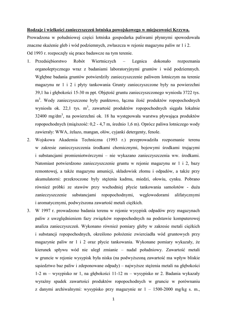 Rodzaje i wielkości zanieczyszczeń lotniska powojskowego w miejscowości Krzywa. Prowadzona w południowej części lotniska gospodarka paliwami płynnymi spowodowała znaczne skażenie gleb i wód podziemnych, zwłaszcza w rejonie magazynu paliw nr 1 i 2. Od 1993 r. rozpoczęły się prace badawcze na tym terenie. 1. Przedsiębiorstwo Robót Wiertniczych – Legnica dokonało rozpoznania organoleptycznego wraz z badaniami laboratoryjnymi gruntów i wód podziemnych. Wgłębne badania gruntów potwierdziły zanieczyszczenie paliwem lotniczym na terenie magazynu nr 1 i 2 i płyty tankowania Grunty zanieczyszczone były na powierzchni 39,1 ha i głębokości 15-30 m ppt. Objętość gruntu zanieczyszczonego wyniosła 3722 tys. m3. Wody zanieczyszczone były punktowo, łączna ilość produktów ropopochodnych wyniosła ok. 22,1 tys. m3, zawartość produktów ropopochodnych sięgała lokalnie 32400 mg/dm3, na powierzchni ok. 18 ha występowała warstwa pływająca produktów ropopochodnych (miąższość: 0,2 - 4,7 m, średnio 1,6 m). Oprócz paliwa lotniczego wody zawierały: WWA, żelazo, mangan, ołów, cyjanki detergenty, fenole. 2. Wojskowa Akademia Techniczna (1993 r.) przeprowadziła rozpoznanie terenu w zakresie zanieczyszczenia środkami chemicznymi, bojowymi środkami trującymi i substancjami promieniotwórczymi – nie wykazano zanieczyszczenia ww. środkami. Natomiast potwierdzono zanieczyszczenie gruntu w rejonie magazynu nr 1 i 2, bazy remontowej, a także magazynu amunicji, składowisk złomu i odpadów, a także przy akumulatorni: przekroczone były stężenia kadmu, miedzi, ołowiu, cynku. Pobrano również próbki ze stawów przy wschodniej płycie tankowania samolotów - duża zanieczyszczenie substancjami ropopochodnymi, węglowodorami alifatycznymi i aromatycznymi, podwyższona zawartość metali ciężkich. 3. W 1997 r. prowadzono badania terenu w rejonie wysypisk odpadów przy magazynach paliw z uwzględnieniem fazy związków ropopochodnych na podstawie komputerowej analiza zanieczyszczeń. Wykonano również pomiary gleby w zakresie metali ciężkich i substancji ropopochodnych, określono położenie zwierciadła wód gruntowych przy magazynie paliw nr 1 i 2 oraz płycie tankowania. Wykonane pomiary wykazały, że kierunek spływu wód nie uległ zmianie – nadal południowy. Zawartość metali w gruncie w rejonie wysypisk była niska (na podwyższoną zawartość ma wpływ bliskie sąsiedztwo baz paliw i zdeponowane odpady) – najwyższe stężenia metali na głębokości 1-2 m – wysypisko nr 1, na głębokości 11-12 m – wysypisko nr 2. Badania wykazały wyraźny spadek zawartości produktów ropopochodnych w gruncie w porównaniu z danymi archiwalnymi: wysypisko przy magazynie nr 1 – 1500-2000 mg/kg s. m., 1 wysypisko przy magazynie nr 2 – zanik zanieczyszczeń w zachodniej części wysypiska i stopniowy wzrost stężeń w kierunku północno-wschodnim (powyżej 3500 mg/kg). Centrum Informacji Ekologicznej i Gospodarczej w Legnicy (CIEiG-1997 r.) w ramach prac wykonało otwory badawcze do głębokości ok. 30 m ppt. Wody podziemne wykazywały właściwości typowe dla wód czwartorzędowych. W odniesieniu do norm wody pitnej: ponadnormatywne zawartości cyjanków wolnych i wysokie CHZTCr i CHZTMn - wskazuje na obecność wolnej fazy produktów naftowych. W wodzie stwierdzono duże stężenie ogólnej zawartości węglowodorów, WWA oraz monoaromatów tylko w 3 próbkach wody przekroczone stężenie Zn, brak przekroczeń innych metali ciężkich. Migracja paliwa w I warstwie wodonośnej - w kierunku południowo-zachodnim i południowym, w II warstwie wodonośnej - w kierunku południowo-wschodnim. Stopień rozpoznania warunków hydrogeologicznych (1997) nie pozwala na szczegółowe śledzenie dróg migracji zanieczyszczonego paliwa z poziomu pierwszego do drugiego. Modelowanie wykazało całkowitą objętość produktu wolnego na terenie: magazynu nr I – 2074,85 m3 (I warstwa wodonośna 445,7 m3, II warstwa wodonośna 1629,15 m3), magazyn nr 2 – 4288,53 m3 wolnego produktu (I warstwa 4081,84 m3, II warstwa 206,69 m3) Zanieczyszczenie gruntu przedstawiało się następująco: Magazyn paliw nr 1 – bardzo małe zawartości substancji ropopochodnych, śladowe ilości węglowodorów, małe zanieczyszczenie frakcją paliwową, brak przekroczeń monoaromatów i WWA. Magazyn paliw nr 2 – suma ropopochodnych od <1,0 mg/kg s.m. do 28719,6 mg/kg s.m., stężenie poszczególnych frakcji węglowodorów wskazuje na zanieczyszczenie paliwem lotniczym (również wysokie stężenia WWA i BTX), obecność estrów kwasu ftalowego wskazuje na niekontrolowane rozlewy paliwa. 4. Badania przeprowadzone przez firmę GEOTEST (2000 r.): badanie wód i gruntu na terenie magazynu paliw nr 1 i 2 (dz. 256/31 i 256/32), głębokość poboru prób: 3,0-18,0 m, wody gruntowej na głębokości 15 m. W wodzie stwierdzono obecność benzyny lotniczej w ilości 80,69 mg/l na głębokości 10,5 m ppt. W gruncie zawartość substancji ropopochodnych od 191,9 mg/kg s.m. do 8425 mg/kg s.m. - grunt nie jest zanieczyszczony metalami ciężkimi, nierównomierne w pionie i poziomie zanieczyszczenie benzyną lotniczą: na głębokości do 2 m ppt. wykryto śladowe ilości benzyny, z wyjątkiem otworu nr 5- na głębokości 0,5 m – 3051,7 mg/kg s.m. substancji ropopochodnych (wytyczne dopuszczają do głęb. 2,0 m 500 mg/kg s.m. ropopochodnych w gruncie) 2 - na głębokości od 4,5 m ppt- wielokrotne przekroczenia dopuszczalnej zawartości benzyny, największa zawartość przy głębokości 10,5 m –8425,0mg/kg 5. Wojewódzki Inspektorat Ochrony Środowiska w ramach państwowego monitoringu środowiska (2003r., 2008r.) wykonał badanie jakości wód podziemnych, które potwierdziło znaczne zanieczyszczenie produktami ropopochodnymi w ilości 8,9-363,8 mg/l (największe stężenie na głębokości 8 m ppt.), dodatkowo stwierdzono obecność fenoli w ilości 0,23 mg/l – 0,83 mg/l. An