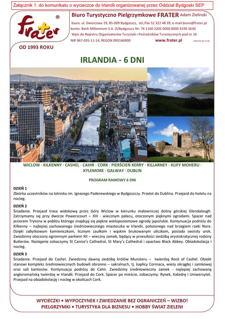 Załącznik 1. do komunikatu o wycieczce do Irlandii organizowanej przez Oddział Bydgoski SEP Biuro Turystyczno Pielgrzymkowe FRATER Adam Zielinski biuro: ul. Dworcowa 19, 85-009 Bydgoszcz, tel./fax 52 322 48 39, e-mail:[email protected] konto: Bank Millennium S.A. O/Bydgoszcz Nr: 76 1160 2202 0000 0000 4190 3630 Wpis do Rejestru Organizatorów Turystyki i Pośredników Turystycznych pod nr 16 NIP 967-035-11-14, REGON 093166900 www.frater.pl 2016-03-30 12:46 IRLANDIA - 6 DNI WICLOW ∙ KILKENNY ∙ CASHEL ∙ CAHIR ∙ CORK ∙ PIERŚCIEŃ KERRY ∙ KILLARNEY ∙ KLIFY MOHERU ∙ KYLEMORE ∙ GALWAY ∙ DUBLIN PROGRAM RAMOWY 6 DNI DZIEŃ 1 Zbiórka uczestników na lotnisku im. Ignacego Paderewskiego w Bydgoszczy. Przelot do Dublina. Przejazd do hotelu na nocleg. DZIEŃ 2 Śniadanie. Przejazd trasa widokową przez Góry Wiclow w kierunku malowniczej doliny górskiej Glendalough. Zatrzymamy się przy dworze Powerscourt – XIII - wiecznym pałacu, otoczonym pięknymi ogrodami. Spacer nad jeziorem Trytona w pobliżu którego znajdują się piękne wielopoziomowe ogrody japońskie. Kontynuacja podróży do Kilkenny – najlepiej zachowanego średniowiecznego miasteczka w Irlandii, położonego nad brzegiem rzeki Nore. Dzięki zabytkowym kamieniczkom, licznym zaułkom i wąskim brukowanym uliczkom, posiada swoisty urok. Zwiedzimy otoczony ogromnym parkiem XII – wieczny zamek, będący w przeszłości siedzibą arystokratycznej rodziny Butlerów. Następnie zobaczymy St Canice’s Cathedral, St Mary’s Cathedral i opactwo Black Abbey. Obiadokolacja i nocleg. DZIEŃ 3 Śniadanie. Przejazd do Cashel. Zwiedzimy dawną siedzibę królów Munsteru – twierdzę Rock of Cashel. Obiekt stanowi kompleks średniowiecznych budowli obronno – sakralnych, tj. kaplicy Cormaca, wieży okrągłej i zamkowej oraz sali kantorów. Kontynuacja podrózy do Cahir. Zwiedzimy średniowieczny zamek - najlepiej zachowaną angloromańską twierdzę w Irlandii. Przejazd do Cork. Spacer po mieście, zobaczymy: Rynek, Katedrę i Uniwersytet. Przejazd na obiadokolację i nocleg w okolicach Cork. Biuro Turystyczno Pielgrzymkowe FRATER Adam Zielinski biuro: ul. Dworcowa 19, 85-009 Bydgoszcz, tel./fax 52 322 48 39, e-mail:[email protected] konto: Bank Millennium S.A. O/Bydgoszcz Nr: 76 1160 2202 0000 0000 4190 3630 Wpis do Rejestru Organizatorów Turystyki i Pośredników Turystycznych pod nr 16 NIP 967-035-11-14, REGON 093166900 www.frater.pl 2016-03-30 12:46 DZIEŃ 4 Śniadanie. Przejazd jednym z najpopularniejszych szlaków turystycznych wyspy – Pierścieniem Kerry. Trasa widokowa prowadzi wzdłuż wybrzeża Oceanu Atlantyckiego, wokół Płw. Iveragh - słynącego z urokliwych gór i pięknych morskich krajobrazów. Przejazd na obiadokolację i nocleg w okolice Limerick. DZIEŃ 5 Śniadanie. Przejedziemy na Klify Moheru. Są to ponad 200 – metrowe urwiska, erodowane przez uderzające fale wód Oceanu Atlantyckiego. Kolejnym punktem programu jest Kylemore. Zobaczymy opactwo, którego nazwa oznacza „ Wielki Las”. Neogotyckie opactwo wraz z rozciągającym się za nim wiktoriańskim ogrodem, stanowi jedno z najbardziej romantycznych i urokliwych miejsc na wyspie. Malowniczą ścieżką udamy się na szczyt wzniesienia, na którym znajduje się statua Chrystusa. Przejazd do Galway – urokliwego miasteczka nadmorskiego z zachowanym dawnym układem urbanistycznym. W celtyckiej stolicy Irlandii zobaczymy: bramę Brown, Eyre Square, Lynch’s Castle oraz Kościół Św. Mikołaja. Przejazd na obiadokolację i nocleg w okolicach Galway. DZIEŃ 6 Śniadanie, po którym przejazd do Dublina. Objazd panoramiczny miasta, zobaczymy m.in. : Katedrę Św. Patryka, Trinity Collage. Przejazd Georgian Squares do największego parku śródmiejskiego w Europie, czyli Phoenix Park. Wizyta w Guinness Storehouse. Przejazd na lotnisko i przelot powrotny. TERMIN: 31.08-05.09.2016 CENA: Ilość osób 40 45 cena 3680 zł 3580 zł ZAPEWNIAMY: przelot samolotem w obie strony wraz z opłatami lotniskowymi, przejazd komfortowym autokarem na terenie Irlandii, 5 noclegów w hotelach **/*** pokoje 2-3 os. z łazienkami, 5 śniadań, 4 obiadokolacje, opiekę i informację turystyczną pilota, ubezpieczenie KL + Assistance wraz z KL chorób przewlekłych do 20 000 € i NNW do 2000 €, do 5000 zł w RP bilety wstępów i inne wydatki programowe UWAGI: program jest ramowy i może ulec drobnym zmianom niezbędny dokument do podróży: paszport lub dowód osobisty