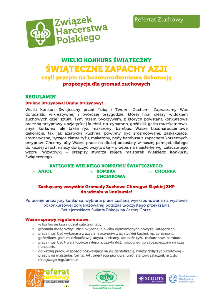 Refertat Zuchowy WIELKI KONKURS ŚWIĄTECZNY ŚWIĄTECZNE ZAPACHY AZJI czyli przepis na bożonarodzeniową dekorację propozycja dla gromad zuchowych REGULAMIN Druhno Drużynowa! Druhu Drużynowy! Wielki Konkurs Świąteczny przed Tobą i Twoimi Zuchami. Zapraszamy Was do udziału w kreatywnej i twórczej przygodzie, której finał cieszy widokiem zuchowych dzieł sztuki. Tym razem tworzywem, z których powstaną konkursowe prace są przyprawy z azjatyckiej kuchni, np. cynamon, goździki, gałka muszkatołowa, anyż, kurkuma, ale także ryż, makarony, bambus. Wasze bożonarodzeniowe dekoracje, tak jak azjatycka kuchnia, powinny być zróżnicowane, zaskakujące, aromatyczne, łączące ziarna ryżu, makarony, pędy bambusa z zapachem korzennych przypraw. Chcemy, aby Wasze prace na dłużej pozostały w naszej pamięci, dlatego do każdej z nich należy dołączyć wizytówkę – przepis na majsterkę wg. załączonego wzoru. Wizytówki – przepisy stworzą księgę majsterek Wielkiego Konkursu Świątecznego. • KATEGORIE WIELKIEGO KONKURSU ŚWIĄTECZNEGO: ANIOŁ • BOMBKA • CHOINKA CHOINKOWA Zachęcamy wszystkie Gromady Zuchowe Chorągwi Śląskiej ZHP do udziału w konkursie! Po ocenie przez jury konkursu, wybrane prace zostaną wyeksponowane na wystawie pokonkursowej zorganizowanej podczas uroczystego przekazania Betlejemskiego Światła Pokoju na Jasnej Górze. Ważne sprawy regulaminowe: • • • • • w konkursie biorą udział całe gromady, gromada może wziąć udział w jednej lub kilku wymienionych powyżej kategoriach, praca musi być wykonana z użyciem przypraw z azjatyckiej kuchni, np. cynamonu, goździków, gałki muszkatołowej, anyżu, kurkumy, ale także ryżu, makaronów, bambusa, praca musi być trwała (dobrze sklejona, zszyta itd.), odpowiednio zabezpieczona na czas transportu, do każdej pracy, w sposób pozwalający na jej identyfikację, należy dołączyć wizytówkę – przepis na majsterkę, format A4 , orientacja pionowa (wzór stanowi załącznik nr 1 do niniejszego regulaminu), • • • • • do pracy należy dołączyć listę z podpisem zuchów i drużynowego (wzór stanowi załącznik nr 2 do niniejszego regulaminu), w przypadku, gdy gromada bierze udział w kilku kategoriach konkursowych listę sporządza w 1 egzemplarzu, prace należy przesłać do biura Komendy Śląskiej Chorągwi ZHP (Al. Korfantego 8, 40–004 Katowice) do dnia 2 grudnia 2016 roku do godz. 16.00, wyniki Wielkiego Konkursu Świątecznego ogłoszone zostaną na profilu społecznościowym i na blogu Referatu Zuchowego, nadesłanych na konkurs prac nie zwracamy, prawo do interpretacji powyższego regulaminu zastrzega sobie Referat Zuchowy Chorągwi Śląskiej ZHP. WIELKI KONKURS ŚWIĄTECZNY ŚWIĄTECZNY KALENDARZ ADWENTOWY propozycja dla namiestnictw zuchowych REGULAMIN Druhno Namiestniczko! Druhu Namiestniku! Zachęcamy Wasze Namiestnictwo do udziału w Wielkim Konkursie Świątecznym. Mamy dla Was wyjątkowe zadanie – przygotujcie wspólnie z kadrą gromad zuchowych Waszego hufca ŚWIĄTECZNY KALENDARZ ADWENTOWY. Ukryjcie w jego okienkach Wasze sukcesy, oczekiwania, braterskie słowa. Sposób wykonania, forma kalendarza zależy od Was samych. Życzymy udanej wspólnej pracy i zabawy, które pozwolą na integrację, poznanie siebie i zuchowego środowiska Waszego hufca. Ważne sprawy regulaminowe: • • • • • • w konkursie biorą udział członkowie namiestnictw i kadra gromad zuchowych hufca, kalendarz musi być trwały (dobrze sklejony, zszyty itd.), odpowiednio zabezpieczony na czas transportu, do kalendarza, w sposób pozwalający na jego identyfikację, należy dołączyć wizytówkę namiestnictwa – nazwa namiestnictwa, hufiec, stopień, imię i nazwisko namiestnika. do kalendarza należy dołączyć listę z podpisami członków namiestnictwa i kadry gromad zuchowych wykonujących pracę, kalendarz należy przesłać do biura Komendy Śląskiej Chorągwi ZHP (Al. Korfantego 8, 40– 004 Katowice) do dnia 2 grudnia 2016 roku do godz. 16.00, wyniki Wielkiego Konkursu Świątecznego ogłoszone zostaną na profilu społecznościowym i na blogu Referatu Zuchowego, Zachęcamy wszystkie Namiestnictwa Zuchowe Chorągwi Śląskiej ZHP do udziału w konkursie! Załącznik nr 1 PRZEPIS NA BOŻONARODZENIOWĄ MAJSTERKĘ NAZWA MAJSTERKI: KATEGORIA: NR I NAZWA GROMADY: HUFIEC ZHP POMYSŁ NA MAJSTERKĘ (WŁAŚCIWE PODKREŚLIĆ): • Majsterka wykonana jest wg naszego autorskiego pomysłu, • Majsterka wykonana jest wg pomysłu zaczerpniętego z ( tutaj należy podać autora, tytuł, miejsce wydania, rok, stronę książki z której pochodzi majsterka lub adres strony internetowej) MIEJSCE NA ZDJĘCIE WYKONANEJ MAJSTERKI: MATERIAŁY POTRZEBNE DO WYKONANIA MAJSTERKI: • • • • ……………………………….. ……………………………….. ……………………………….. ……………………………….. OPIS WYKONANIA MAJSTERKI: • • • • ……………………………….. ……………………………….. ……………………………….. ……………………………….. Załącznik nr 2 LISTA UCZESTNIKÓW NR I NAZWA GROMADY ......................................................................................................................... HUFIEC ZHP ............................................................................................................................................... KATEGORIA KONKURSU (właściwą podkreślić): ANIOŁ Lp. Imię i nazwisko zucha/drużynowego BOMBKA CHOINKOWA podpis CHOINKA