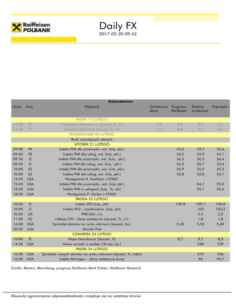 Daily FX 2017-02-20 09:42 Kalendarium Godz. Kraj Wskaźnik Ostateczna dana Prognoza Raiffeisen Średnia oczekiwań Poprzedni 14:00 PL Produkcja przemsyłowa (styczeń, %. r/r) 9,0 8,0 8,0 2,3 14:00 PL Sprzedaż detaliczna (styczeń, %. r/r) 11,4 8,8 7,7 6,4 WTOREK 21 LUTEGO Indeks PMI dla przemysłu, wst. (luty, pkt.) 53,0 53,7 53,6 PIĄTEK 17 LUTEGO PONIEDZIAŁEK 20 LUTEGO Brak ważniejszych danych 09:00 FR 09:00 FR Indeks PMI dla usług, wst. (luty, pkt.) 53,5 53,9 54,1 09:30 D Indeks PMI dla przemysłu, wst. (luty, pkt.) 56,5 56,2 56,4 09:30 D Indeks PMI dla usług, wst. (luty, pkt.) 54,2 53,7 53,4 10:00 EZ Indeks PMI dla przemysłu, wst. (luty, pkt.) 54,9 55,0 55,2 10:00 EZ Indeks PMI dla usług, wst. (luty, pkt.) 53,8 53,8 53,7 14:50 USA Występienie N. Kashkari z FOMC 15:45 USA Indeks PMI dla przemysłu, wst. (luty, pkt.) 54,7 55,0 15:45 USA Indeks PMI w usługach (luty, %, rdr) 55,7 55,6 18:00 USA Występienie P. Harker z FOMC 10:00 D Indeks IFO (luty, pkt) 109,7 109,8 10:00 D Indeks IFO – oczekiwania (luty, pkt) 103 103,2 10:30 UK PKB (Q4, r/r) 2,2 2,2 ŚRODA 22 LUTEGO 11:00 EZ Inflacja CPI – dane ostateczne (styczeń, %. r/r) 16:00 USA Sprzedaż domów na rynku wtórnym (styczeń, tys.) 20:00 USA Minutki Fed 10:00 PL Stopa bezrobocia (Styczeń, %) 14:30 USA Nowe wnioski o zasiłek (18 luty, tys.) 109,8 1,8 1,8 5,45 5,55 5,49 8,7 8,7 8,3 240 239 CZWARTEK 23 LUTEGO PIĄTEK 24 LUTEGO 16:00 USA Sprzedaż nowych domów na rynku wtórnym (styczeń, %, mdm) 575 536 16:00 USA Indeks Michigan – dane ostateczne (Luty) 96 95,7 Źródło: Reuters; Bloomberg; prognozy Raiffeisen Bank Polska i Raiffeisen Research Klauzula ograniczenia odpowiedzialności znajduje się na ostatniej stronie Para walutowa EURUSD EURPLN USDPLN Oczekiwany zakres wahań* 1,057-1,067 4,32-4,34 4,04-4,10 Oczekiwany kierunek boczny boczny boczny *w kolejnych 24 godz. EURUSD – Kurs EURUSD porusza się dzisiaj rano okolicy 1,062, czyli poziomu na którym zakończył ubiegły tydzień. Wobec dnia wolnego od pracy w Stanach Zjednoczonych oraz pustego kalendarza makroekonomicznego w strefie euro, prawdopodobny jest dzisiaj ruch boczny w przypadku tej pary. Oporem jest obecnie 1,067. Wsparciami są 1,059 oraz 1,057. EURPLN – Kurs EURPLN wzrósł w piątek do powyżej oporu na poziomie 4,32. W krótkim terminie oporem powstrzymującym wzrost w przypadku dalszego wzrostu powinien być poziom 4,34, kolejnym zaś okolice 4,36, gdzie obecnie przebiegają 100- i 200-sesyjne średnie ruchome. Wsparciem powinien być w krótkim terminie poziom 4,32. USDPLN – W przypadku kursu USDPLN oporem jest obecnie poziom 4,08. Wzrost powyżej otworzy drogę do wzrostu w okolice USD/PLN 4,1. W przypadku spadku Pierwszym silniejszym wsparciem powinien być 4,04. Raport sporządził: Wojciech Stępień, CFA Analityk Rynków Finansowych Raiffeisen Polbank ul. Grzybowska 78, 00-844 Warszawa www.raiffeisenpolbank.com Departament Sprzedaży Rynków Finansowych Telefon: + 48 22 585 37 86 Faks: + 48 22 585 33 68 W razie pytań lub uwag dotyczących powyższej publikacji proszę o kontakt: [email protected] Dealing: Bydgoszcz tel.: (22) 585 37 73 Poznań tel.: (61) 655 47 51 Gdańsk tel.: (22) 585 37 71 Rzeszów tel.: (22) 585 37 75 Katowice tel.: (22) 585 37 69 Szczecin tel.: (22) 585 37 71 Kielce tel.: (22) 585 37 70 Toruń tel.: (22) 585 37 72 Kraków tel.: (22) 585 37 70 Warszawa tel.: (22) 585 37 79 Lublin tel.: (22) 585 37 75 Wrocław tel.: (22) 585 37 74 Łódź tel.: (22) 585 37 75 Zielona Góra tel.: (22) 585 37 73 Klauzula Ograniczenia Odpowiedzialności: Niniejsza wiadomość została przesłana zgodnie z Pani/Pana zleceniem. Informujemy, że zgoda na otrzymywanie informacji może zostać w każdej chwili odwołana. Jeżeli nie życzy sobie Pani/ Pan dalszego otrzymywania materiałów przygotowanych przez Zespół Analiz Ekonomicznych Raiffeisen Bank Polska S.A (dalej: RBPL lub Bank) lub niniejszy materiał został wysłany na Pani/Pana adres przez pomyłkę, prosimy o przesłanie e-maila o tytule "REZYGNACJA" na skrzynkę e-mailową: [email protected]. Opracowanie to nie stanowi oferty w rozumieniu art. 66 Kodeksu Cywilnego i zostało przesłane na podstawie ustnej zgody, która w każdej chwili może być odwołana. Ma ono charakter wyłącznie informacyjny. Powielanie bądź publikowanie go lub jego części bez pisemnej zgody Banku jest zabronione. Decyzja inwestycyjna w odniesieniu do papieru wartościowego, produktu finansowego lub inwestycji powinna być podjęta na podstawie opublikowanego prospektu emisyjnego lub kompletnej dokumentacji dla papieru wartościowego, produktu finansowego lub inwestycji. Ostateczna decyzja zawarcia transakcji należy wyłącznie do Klienta. Bank nie występuje w roli pośrednika ani przedstawiciela Klienta. Przed zawarciem każdej transakcji Klient powinien nie opierając się na informacjach przekazanych przez Bank określić jej ryzyko, potencjalne korzyści oraz straty z nią związane, jak również w szczególności charakterystykę, konsekwencje prawne, podatkowe i księgowe transakcji oraz konsekwencje zmieniających się czynników rynkowych, a także w sposób niezależny ocenić czy jest w stanie sam lub po konsultacjach ze swoimi doradcami podjąć takie ryzyko. Niniejszy dokument nie stanowi rekomendacji, porady inwestycyjnej i nie jest związany ze świadczeniem usług doradztwa inwestycyjnego. Dokument, ani żadna z jego części nie stanowi podstawy do zawarcia jakiejkolwiek umowy lub powstania zobowiązania. Opracowanie to nie zastępuje niezbędnych porad odnośnie zakupu lub sprzedaży papieru wartościowego, inwestycji lub innego produktu finansowego. Analiza oparta jest na informacjach publicznie dostępnych – do jej sporządzenia nie wykorzystano żadnych informacji poufnych. Wyrażane opinie są niezależnymi opiniami Banku. W opracowaniu wykorzystano źródła informacji, które Bank uważa za wiarygodne i dokładne, lecz nie istnieje gwarancja, że są one wyczerpują