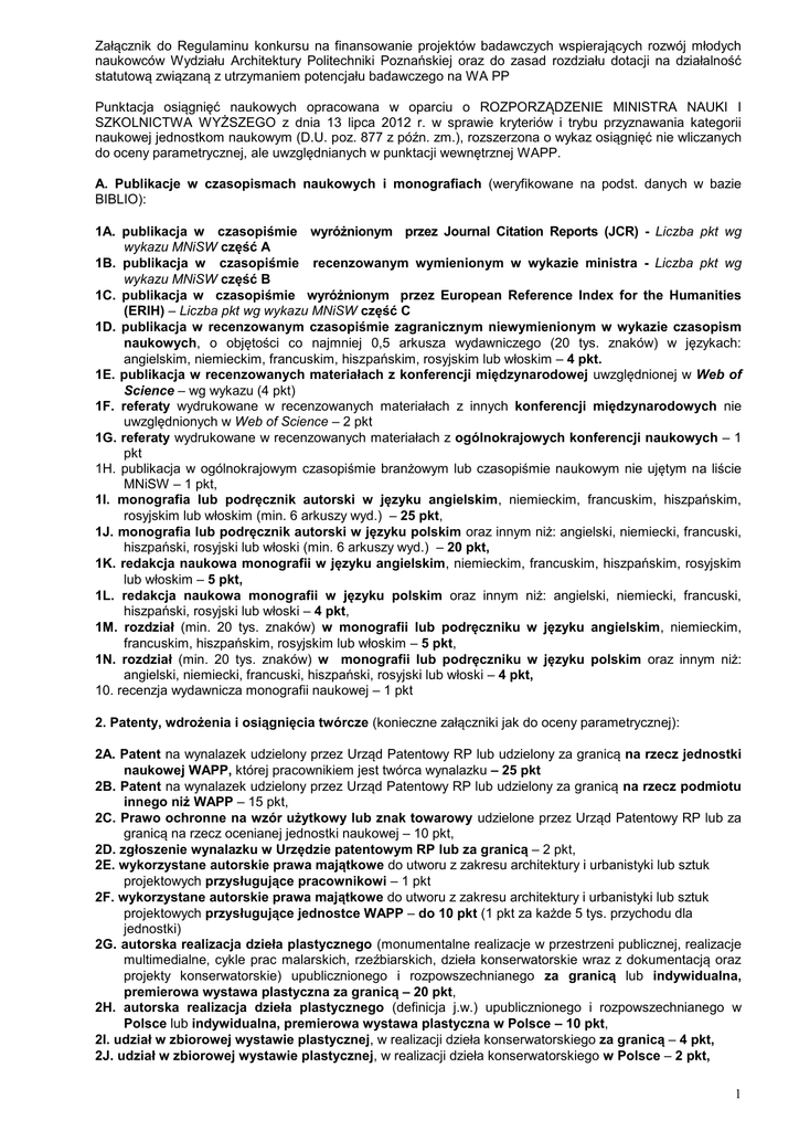 Załącznik do Regulaminu konkursu na finansowanie projektów badawczych wspierających rozwój młodych naukowców Wydziału Architektury Politechniki Poznańskiej oraz do zasad rozdziału dotacji na działalność statutową związaną z utrzymaniem potencjału badawczego na WA PP Punktacja osiągnięć naukowych opracowana w oparciu o ROZPORZĄDZENIE MINISTRA NAUKI I SZKOLNICTWA WYŻSZEGO z dnia 13 lipca 2012 r. w sprawie kryteriów i trybu przyznawania kategorii naukowej jednostkom naukowym (D.U. poz. 877 z późn. zm.), rozszerzona o wykaz osiągnięć nie wliczanych do oceny parametrycznej, ale uwzględnianych w punktacji wewnętrznej WAPP. A. Publikacje w czasopismach naukowych i monografiach (weryfikowane na podst. danych w bazie BIBLIO): 1A. publikacja w czasopiśmie wyróżnionym przez Journal Citation Reports (JCR) - Liczba pkt wg wykazu MNiSW część A 1B. publikacja w czasopiśmie recenzowanym wymienionym w wykazie ministra - Liczba pkt wg wykazu MNiSW część B 1C. publikacja w czasopiśmie wyróżnionym przez European Reference Index for the Humanities (ERIH) – Liczba pkt wg wykazu MNiSW część C 1D. publikacja w recenzowanym czasopiśmie zagranicznym niewymienionym w wykazie czasopism naukowych, o objętości co najmniej 0,5 arkusza wydawniczego (20 tys. znaków) w językach: angielskim, niemieckim, francuskim, hiszpańskim, rosyjskim lub włoskim – 4 pkt. 1E. publikacja w recenzowanych materiałach z konferencji międzynarodowej uwzględnionej w Web of Science – wg wykazu (4 pkt) 1F. referaty wydrukowane w recenzowanych materiałach z innych konferencji międzynarodowych nie uwzględnionych w Web of Science – 2 pkt 1G. referaty wydrukowane w recenzowanych materiałach z ogólnokrajowych konferencji naukowych – 1 pkt 1H. publikacja w ogólnokrajowym czasopiśmie branżowym lub czasopiśmie naukowym nie ujętym na liście MNiSW – 1 pkt, 1I. monografia lub podręcznik autorski w języku angielskim, niemieckim, francuskim, hiszpańskim, rosyjskim lub włoskim (min. 6 arkuszy wyd.) – 25 pkt, 1J. monografia lub podręcznik autorski w języku polskim oraz innym niż: angielski, niemiecki, francuski, hiszpański, rosyjski lub włoski (min. 6 arkuszy wyd.) – 20 pkt, 1K. redakcja naukowa monografii w języku angielskim, niemieckim, francuskim, hiszpańskim, rosyjskim lub włoskim – 5 pkt, 1L. redakcja naukowa monografii w języku polskim oraz innym niż: angielski, niemiecki, francuski, hiszpański, rosyjski lub włoski – 4 pkt, 1M. rozdział (min. 20 tys. znaków) w monografii lub podręczniku w języku angielskim, niemieckim, francuskim, hiszpańskim, rosyjskim lub włoskim – 5 pkt, 1N. rozdział (min. 20 tys. znaków) w monografii lub podręczniku w języku polskim oraz innym niż: angielski, niemiecki, francuski, hiszpański, rosyjski lub włoski – 4 pkt, 10. recenzja wydawnicza monografii naukowej – 1 pkt 2. Patenty, wdrożenia i osiągnięcia twórcze (konieczne załączniki jak do oceny parametrycznej): 2A. Patent na wynalazek udzielony przez Urząd Patentowy RP lub udzielony za granicą na rzecz jednostki naukowej WAPP, której pracownikiem jest twórca wynalazku – 25 pkt 2B. Patent na wynalazek udzielony przez Urząd Patentowy RP lub udzielony za granicą na rzecz podmiotu innego niż WAPP – 15 pkt, 2C. Prawo ochronne na wzór użytkowy lub znak towarowy udzielone przez Urząd Patentowy RP lub za granicą na rzecz ocenianej jednostki naukowej – 10 pkt, 2D. zgłoszenie wynalazku w Urzędzie patentowym RP lub za granicą – 2 pkt, 2E. wykorzystane autorskie prawa majątkowe do utworu z zakresu architektury i urbanistyki lub sztuk projektowych przysługujące pracownikowi – 1 pkt 2F. wykorzystane autorskie prawa majątkowe do utworu z zakresu architektury i urbanistyki lub sztuk projektowych przysługujące jednostce WAPP – do 10 pkt (1 pkt za każde 5 tys. przychodu dla jednostki) 2G. autorska realizacja dzieła plastycznego (monumentalne realizacje w przestrzeni publicznej, realizacje multimedialne, cykle prac malarskich, rzeźbiarskich, dzieła konserwatorskie wraz z dokumentacją oraz projekty konserwatorskie) upublicznionego i rozpowszechnianego za granicą lub indywidualna, premierowa wystawa plastyczna za granicą – 20 pkt, 2H. autorska realizacja dzieła plastycznego (definicja j.w.) upublicznionego i rozpowszechnianego w Polsce lub indywidualna, premierowa wystawa plastyczna w Polsce – 10 pkt, 2I. udział w zbiorowej wystawie plastycznej, w realizacji dzieła konserwatorskiego za granicą – 4 pkt, 2J. udział w zbiorowej wystawie plastycznej, w realizacji dzieła konserwatorskiego w Polsce – 2 pkt, 1 3. Rozwój kadry naukowej 3A. stopień naukowy doktora lub stopień doktora sztuki – 2 pkt, 3B. stopień naukowy doktora habilitowanego – 7 pkt (+ 2 pkt przed ukończeniem 40. roku życia), 3C. tytuł naukowy profesora – 10 pkt (+ 4 pkt przed ukończeniem 45. roku życia), 3D. promotorstwo w otwartym przewodzie doktorskim – 1 pkt, 3E. promotorstwo w przewodzie doktorskim zakończonym nadaniem stopnia doktora – 2 pkt 3F. promotorstwo w przewodzie doktorskim zagranicznym lub międzynarodowym zakończonym nadaniem stopnia doktora – 4 pkt 3G. recenzja rozprawy doktorskiej – 1 pkt, 3H. recenzja rozprawy doktorskiej w języku obcym – 2 pkt, 3I. recenzja w przewodzie habilitacyjnym lub postępowaniu o nadanie tytułu naukowego profesora – 2 pkt, 3J. recenzja w przewodzie habilitacyjnym lub postępowaniu o nadanie tytułu naukowego profesora w języku obcym – 3 pkt, 4. Osiągnięcia organizacyjne i inne: 4A. organizacja konferencji międzynarodowej lub ogólnopolskiej na WAPP (kurator lub sekretarz konferencji) – 4 pkt, 4B. aktywny udział w organizacji wydarzeń służących popularyzacji nauki (festiwale, pokazy, konkursy, wystawy itp.) – 1 pkt 4C. referat wygłoszony w języku obcym na konferencji za granicą – 2 pkt, (referat plenarny lub referat na zaproszenie – 3 pkt) 4D. referat wygłoszony na k