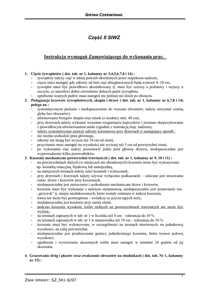 GMINA CZERWONAK Część II SIWZ Instrukcja wymagań Zamawiającego do wykonania prac. 1. Cięcie Ŝywopłotów ( dot. tab. nr 1, kolumny nr 3,4,5,6,7,8 i 14) : - Ŝywopłoty naleŜy ciąć w miarę potrzeb określonych przez inspektora nadzoru, - cięcie musi nastąpić gdy odrosty od linii cięć ubiegłorocznych będą wynosić 8–10 cm, - Ŝywopłot musi być prawidłowo ukształtowany tj. musi być szerszy u podstawy i węŜszy u szczytu, co umoŜliwi dobre oświetlenie dolnych partii Ŝywopłotu, - zgrabienie ściętych pędów musi nastąpić nie później niŜ dzień po obcięciu. 2. Pielęgnacja krzewów Ŝywopłotowych, skupin i drzew ( dot. tab. nr 1, kolumny nr 6,7,8 i 14) polega na : - systematycznym pieleniu i niedopuszczeniu do wzrostu chwastów, naleŜy utrzymać czarną glebę bez chwastów), - uformowaniu brzegów skupin oraz misek (o średnicy min. 40 cm), - przy drzewach naleŜy wykonać wiosenne rozgarnięcie kopczyków i jesienne okopczykowanie z prawidłowym uformowaniem miski (zgodnie z instrukcją insp. nadzoru), - naleŜy systematycznie usuwać odrosty korzeniowe przy drzewach w następujący sposób : - nie moŜna uszkodzić pnia głównego, - odrosty nie mogą być wyŜsze niŜ 10 cm od ziemi, - przycinanie musi nastąpić na wysokości nie wyŜszej niŜ 5 cm od powierzchni ziemi, - po wykonaniu cięć naleŜy pozostawić jeden pień główny drzewa, niedopuszczalne jest wyprowadzenie kilku przewodników. 3. Koszenie mechaniczne powierzchni trawiastych ( dot. tab. nr 1, kolumny nr 9, 10 i 11) : - na powierzchniach duŜych (w miejscach nie obsadzonych) koszenie moŜe być wykonywane np. kosiarką rotacyjną, bijakową lub samojezdną, - na mniejszych terenach naleŜy uŜyć kosiarek i wykaszarek, - przy drzewach i krzewach naleŜy uŜywać wyłącznie podkaszarek – zalecane jest stosowanie osłon drzew i krzewów przy koszeniach, - niedopuszczalne jest zniszczenie i uszkodzenie mechaniczne drzew i krzewów, - koszenie musi być wykonane z naleŜyta starannością, niedopuszczalne jest zostawianie tzw. „grzywek” tj. miejsc niedokoszonych, które zostały ominięte w trakcie koszenia, - trawa nie moŜe być postrzępiona – świadczy to uŜyciu tępych noŜy, - niedopuszczalne jest koszenie przy samej ziemi, - podczas koszenia wysokość roślin zielnych na powierzchniach trawiastych nie moŜe być wyŜsza : - na terenach zapisanych w tab. nr 1 w liczniku niŜ 8 cm – tolerancja do 10 % - na terenach zapisanych w tab. nr 1 w mianowniku niŜ 10 cm – tolerancja do 10 % - koszenie musi być wykonywane, w szczególności na terenach nierównych, na jednakowej wysokości, na całej powierzchni, - niedopuszczalne jest przekroczenie granicy jednokrotnego koszenia, która wynosi połowę wysokości, - zgrabienie i wywiezienie skoszonych roślin musi nastąpić w terminie 24 godzin od jej skoszenia. 4. Gracowanie dróg i placów oraz zwalczanie chwastów na chodnikach ( dot. tab. Nr 1, kolumny nr 15) : 1 ZNAK SPRAWY: SZ.341-6/07 GMINA CZERWONAK - 5. 6. 7. 8. w miejscach wskazanych w tabeli jw. dopuszcza się zastosowanie środków chemicznych pod kontrolą inspektora nadzoru, - zastosowanie środków chemicznych nie moŜe uszkodzić zieleni sąsiadującej, - usunięcie chwastów musi być skuteczne, teren podlegający tym zabiegom musi być pozbawiony chwastów, - wywóz chwastów po ich usunięciu musi nastąpić maksymalnie w ciągu 24 godzin po zakończonej pracy, Zgrabienie liści następuje jednorazowo w ostatnim miesiącu prac na zlecenie inspektora nadzoru ( dot. tab. nr 1, kolumny nr 12) . BieŜące utrzymanie czystości polega na systematycznym usuwaniu zanieczyszczeń porzuconych na całym obszarze oraz przy pojemnikach do selektywnej zbiórki odpadów, bez względu na ilość, rodzaj zanieczyszczeń ( dot. tab. nr 1, kolumny nr 13) częstotliwość wywozu : - w miejscach wskazanych w tab. jw. , - usuwanie i wywóz zanieczyszczeń musi nastąpić równieŜ takŜe przy kaŜdorazowym wykonywaniu pielęgnacji zieleni na poszczególnych pozycjach, - Zamawiający zapewnia bezpłatny wjazd na wysypisko odpadów komunalnych w Owińskach ( tylko firmie posiadającej waŜne zezwolenie), Zakładanie trawnika siewem : - materiał siewny musi posiadać świadectwo kwalifikacji, które stwierdza skład mieszanki, zdolność kiełkowania poszczególnych odmian i datę waŜności, - mieszanka traw musi być dobrana do warunków glebowo – klimatycznych panujących na danym terenie i wymagań funkcji jakie powinno spełniać, - wysiew moŜe nastąpić po zatwierdzeniu wyboru mieszanki traw przez inspektora nadzoru , - nasiona traw nie mogą być spleśniałe, przesuszone, zmoczone, - uzupełnianie trawnika polega na : - uporządkowaniu terenu, spulchnieniu gleby, uzupełnieniu ziemi urodzajnej, wysiewu nasion, ubiciu powierzchni (duŜe powierzchnie przez wałowanie, małe przez zahakowanie grabiami), uporządkowaniu terenu po wykonaniu prac, - przez ziemie urodzajna rozumie się ziemię posiadającą zdolność produkcji roślinnej, wyklucza się ziemię zagruzowaną, przerośniętą korzeniami, zasoloną, zanieczyszczoną odpadami komunalnymi i chemicznymi oraz zachwaszczoną, Zakładanie trawnika darnią na skarpach : - darń musi mieć jednakową intensywną zieloną barwę na całej powierzchni, - musi być w pasach o jednakowej szerokości, grubości i długości, o jednym z niŜej podanych wymiarów, przy grubości min. 2 cm : 40 x 200 cm, 41 x 196 cm, 45,5 x 220 cm, 50 x 200 cm, - powinna mieć gęste i białe korzenie, które silnie przerastają podłoŜe, - darń musi być równomiernie gęsta, bez pustych miejsc, - pasy darni muszą być ułoŜone ściśle jeden przy drugim w taki sposób aby ze sobą sąsiadujące w rzędach miały się podobnie jak cegły w murze, - po ułoŜeniu kilku pasów naleŜy dokładnie docisnąć je do podłoŜa ( np. przy uŜyciu deski) w taki sposób aby nie powstawały pęcherze powietrza, następnie całość ubijamy wałem 