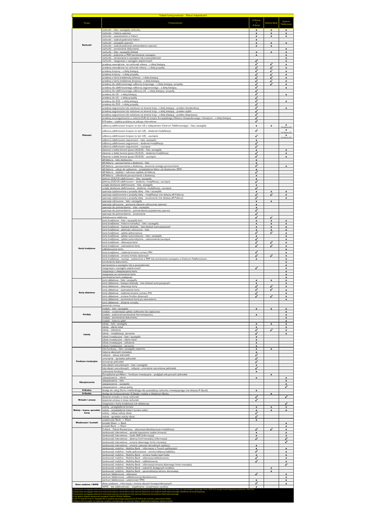 Tabela funkcjonalności - Klienci Indywidualni Grupa Rachunki Płatności Funkcjonalność R-Online + R-Quick rachunki - lista i szczegóły rachunku rachunki - historia operacji rachunki - wyszukiwanie w historii rachunki - wydruk/pobranie historii rachunki - szczegóły operacji rachunki - wydruk/pobranie potwierdzenia operacji rachunki - zamówienie dokumentu rachunki - lista i szczegóły blokad rachunki - pobranie w PDF/zamówienie wyciągów rachunki - zamówienie e-wyciągów lub e-powiadomień rachunki - rezygnacja z wyciągów papierowych przelewy wewnętrzne na rachunek własny - z datą bieżącą przelewy wewnętrzne na rachunek własny - z datą przyszłą przelewy krajowy - z datą bieżącą przelewy krajowy - z datą przyszłą przelewy z karty kredytowej (własny) - z datą bieżącą przelewy z karty kredytowej (krajowy) - z datą bieżącą przelewy do zdefiniowanego odbiorcy krajowego - z datą bieżącą i przyszłą przelewy do zdefiniowanego odbiorcy zagranicznego - z datą bieżącą przelewy do zdefiniowanego odbiorcy US - z datą bieżącą i przyszłą przelewy do US - z datą bieżącą przelewy do US - z datą przyszłą przelewy do ZUS - z datą bieżącą przelewy do ZUS - z datą przyszłą przelewy zagraniczne lub walutowe na terenie kraju z datą bieżącą - przelew standardowy przelewy zagraniczne lub walutowe na terenie kraju z datą bieżącą - przelew szybki przelewy zagraniczne lub walutowe na terenie kraju z datą bieżącą - przelew ekspresowy przelewy euroregulowane w walucie EUR do krajów Europejskiego Obszaru Gospodarczego i Szwajcarii - z datą bieżącą R-Przelew - szybkie przelewy za zakupy internetowe Centrum Telefoniczne x x x x x x x x x x x x x2 3 x 3 x 2 x x2 x3 2 x x3 x3 x3 x2 2 x 2 x 2 x 2 x x2 2 x x2 x2 odbiorcy zdefiniowani krajowi (w tym US z wyłączeniem Centrum Telefonicznego) - lista, szczegóły x odbiorcy zdefiniowani krajowi (w tym US) - dodanie/modyfikacja x odbiorcy zdefiniowani krajowi (w tym US) - usunięcie x odbiorcy zdefiniowani zagraniczni - lista, szczegóły odbiorcy zdefiniowani zagraniczni - dodanie/modyfikacja odbiorcy zdefiniowani zagraniczni - usunięcie zlecenia o stałej kwocie (poza US/ZUS) - lista, szczegóły zlecenia o stałej kwocie (poza US/ZUS) - dodanie/modyfikacja zlecenia o stałej kwocie (poza US/ZUS) - usunięcie eR-faktura - lista dostawców eR-faktura - porozumienie z dostawcą - lista eR-faktura - porozumienie z dostawcą - zawarcie nowego porozumienia eR-faktura - usługi do opłacenia - przeglądanie faktur od dostawców (PDF) eR-faktura - zapłata / odmowa zapłaty za fakturę eR-faktura - odwołanie porozumienia z dostawcą płatnicy ZUS/US zdefiniowani - lista, szczegóły płatnicy ZUS/US zdefiniowani - dodanie, modyfikacja, usunięcie urzędy skarbowe zdefiniowane - lista, szczegóły urzędy skarbowe zdefiniowane - dodanie, modyfikacja, usunięcie operacje zaplanowane z przyszłą datą - lista i szczegóły operacje zaplanowane z przyszłą datą - modyfikacja (nie dotyczy eR-Faktury) operacje zaplanowane z przyszłą datą - anulowanie (nie dotyczy eR-Faktury) operacje odrzucone - lista i szczegóły operacje odrzucone - ponowne zlecenie odrzuconej operacji operacje do potwierdzenia - lista i szczegóły operacje do potwierdzenia - potwierdzenie pojedyńczej operacji operacje do potwierdzenia - anulowanie doładowania telefonów karty kredytowe - lista i szczegóły kart karty kredytowe - historia transakcji - lista i szczegóły karty kredytowe - bieżące blokady - lista blokad autoryzacyjnych karty kredytowe - płatności odrzucone - lista karty kredytowe - spłata jednorazowa karty kredytowe - spłata automatyczna - lista i szczegóły karty kredytowe - spłata automatyczna - ustanowienie/usunięcie karty kredytowe - aktywacja karty karty kredytowe - zastrzeżenie karty Karty kredytowe odblokowanie karty karty kredytowe - nadanie/zmiana numeru PIN karty kredytowe - zmiana limitów dziennych karty kredytowe - wyciągi - pobieranie w PDF lub zamówienie wyciągów w Centrum Telefonicznym zamówienie dokumentu zamówienie e-wyciągów lub e-powiadomień rezygnacja z wyciągów papierowych rezygnacja z ubezpieczenia karty rezygnacja ze wznowienia karty zamówienie karty zastępczej karty debetowe - lista i szczegóły karty debetowe - bieżące blokady - lista blokad autoryzacyjnych karty debetowe - aktywacja karty karty debetowe - zastrzeżenie karty Karty debetowe karty debetowe - nadanie/zmiana numeru PIN karty debetowe - zmiana limitów dziennych karty debetowe - zamówienie karty po zastrzeżeniu karty debetowe - złożenie wniosku zawarcie umowy kredyty - lista i szczegóły kredyty - wcześniejsza spłata (całkowita lub częściowa) Kredyty kredyty - pobranie/zamówienie harmonogramu kredyty - zamówienie dokumentu kredyty - historia spłat lokaty - lista i szczegóły lokaty - oferta lokat lokaty - założenie lokaty - modyfikacja, zerwanie Lokaty lokaty inwestycyjne - lista i szczegóły lokaty inwestycyjne - oferta lokat lokaty inwestycyjne - założenie lokaty inwestycyjne - zerwanie lista funduszy - lista i szczegóły rejestrów historia zleconych transakcji nabycie - zakup jednostek umorzenie - sprzedaż jednostek Fundusze inestycyjne konwersja jednostek lista zleceń warunkowych - lista i szczegóły lista zleceń warunkowych - nabycie i umorzenie warunkowe jednostek notowania funduszy Zarządzanie portfelem - fundusze inwestycyjne - podgląd zakupionych jednostek ubezpieczenia - oferta ubezpieczenia - lista Ubezpieczenia ubezpieczenia - szczegóły ubezpieczenia - zakup polisy R-Broker dostęp do usług Domu maklerskiego dla posiadaczy rachunku inwestycyjnego (nie dotyczy R-Quick) R-Dealer dostęp do funkcjonalności R-Dealer mobile w Mobilnym Banku złożenie wniosku o nowy rachunek Wnioski i umowy zawarcie umowy o nowy rachunek rezygnacja z karty kredytowej lub debetowej waluty - przeglądanie kursów Waluty - kupno, sprzedaż, waluty - przeglądanie historii 