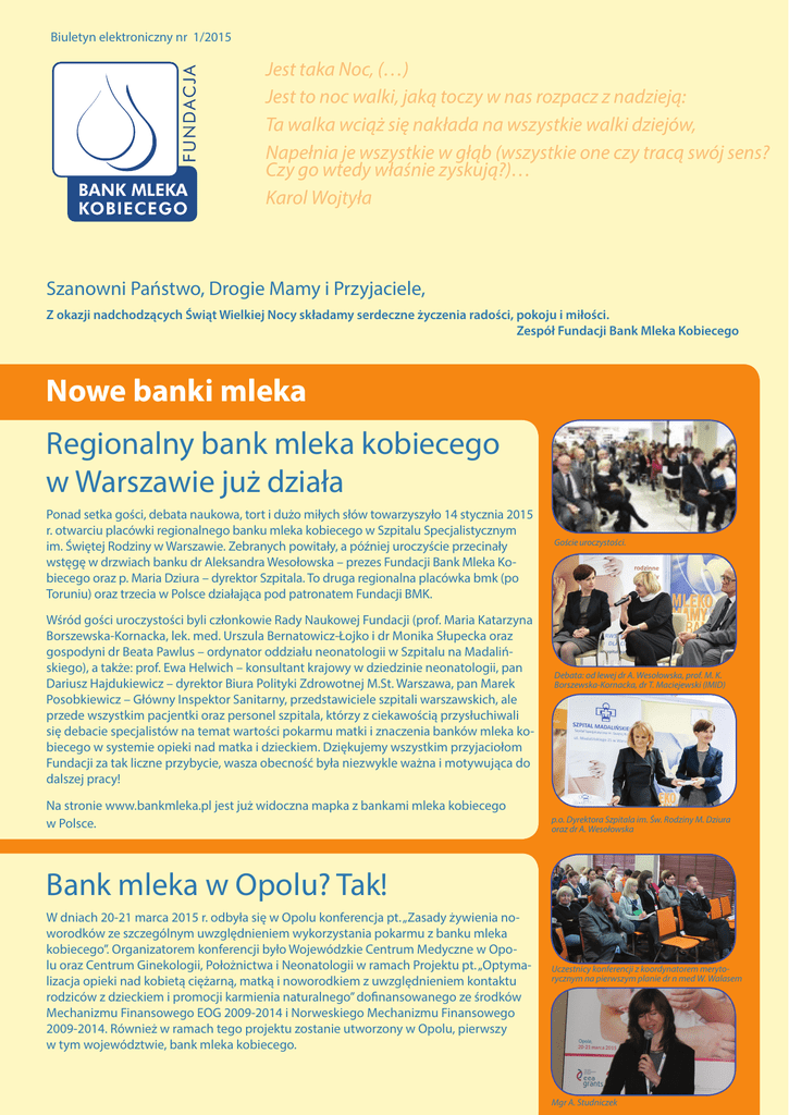 Biuletyn elektroniczny nr 1/2015 Jest taka Noc, (…) Jest to noc walki, jaką toczy w nas rozpacz z nadzieją: Ta walka wciąż się nakłada na wszystkie walki dziejów, Napełnia je wszystkie w głąb (wszystkie one czy tracą swój sens? Czy go wtedy właśnie zyskują?)… Karol Wojtyła Szanowni Państwo, Drogie Mamy i Przyjaciele, Z okazji nadchodzących Świąt Wielkiej Nocy składamy serdeczne życzenia radości, pokoju i miłości. Zespół Fundacji Bank Mleka Kobiecego Nowe banki mleka Regionalny bank mleka kobiecego w Warszawie już działa Ponad setka gości, debata naukowa, tort i dużo miłych słów towarzyszyło 14 stycznia 2015 r. otwarciu placówki regionalnego banku mleka kobiecego w Szpitalu Specjalistycznym im. Świętej Rodziny w Warszawie. Zebranych powitały, a później uroczyście przecinały wstęgę w drzwiach banku dr Aleksandra Wesołowska – prezes Fundacji Bank Mleka Kobiecego oraz p. Maria Dziura – dyrektor Szpitala. To druga regionalna placówka bmk (po Toruniu) oraz trzecia w Polsce działająca pod patronatem Fundacji BMK. Wśród gości uroczystości byli członkowie Rady Naukowej Fundacji (prof. Maria Katarzyna Borszewska-Kornacka, lek. med. Urszula Bernatowicz-Łojko i dr Monika Słupecka oraz gospodyni dr Beata Pawlus – ordynator oddziału neonatologii w Szpitalu na Madalińskiego), a także: prof. Ewa Helwich – konsultant krajowy w dziedzinie neonatologii, pan Dariusz Hajdukiewicz – dyrektor Biura Polityki Zdrowotnej M.St. Warszawa, pan Marek Posobkiewicz – Główny Inspektor Sanitarny, przedstawiciele szpitali warszawskich, ale przede wszystkim pacjentki oraz personel szpitala, którzy z ciekawością przysłuchiwali się debacie specjalistów na temat wartości pokarmu matki i znaczenia banków mleka kobiecego w systemie opieki nad matka i dzieckiem. Dziękujemy wszystkim przyjaciołom Fundacji za tak liczne przybycie, wasza obecność była niezwykle ważna i motywująca do dalszej pracy! Na stronie www.bankmleka.pl jest już widoczna mapka z bankami mleka kobiecego w Polsce. Goście uroczystości. Debata: od lewej dr A. Wesołowska, prof. M. K. Borszewska-Kornacka, dr T. Maciejewski (IMID) p.o. Dyrektora Szpitala im. Św. Rodziny M. Dziura oraz dr A. Wesołowska Bank mleka w Opolu? Tak! W dniach 20-21 marca 2015 r. odbyła się w Opolu konferencja pt. „Zasady żywienia noworodków ze szczególnym uwzględnieniem wykorzystania pokarmu z banku mleka kobiecego”. Organizatorem konferencji było Wojewódzkie Centrum Medyczne w Opolu oraz Centrum Ginekologii, Położnictwa i Neonatologii w ramach Projektu pt. „Optymalizacja opieki nad kobietą ciężarną, matką i noworodkiem z uwzględnieniem kontaktu rodziców z dzieckiem i promocji karmienia naturalnego” dofinansowanego ze środków Mechanizmu Finansowego EOG 2009-2014 i Norweskiego Mechanizmu Finansowego 2009-2014. Również w ramach tego projektu zostanie utworzony w Opolu, pierwszy w tym województwie, bank mleka kobiecego. Uczestnicy konferencji z koordynatorem merytorycznym na pierwszym planie dr n med W. Walasem Mgr A. Studniczek Była to pierwsza w Polsce konferencja naukowa poświęcona działalności banków mleka kobiecego, podczas której swoją wiedzą i doświadczeniami dzielili się pracownicy banków mleka w Warszawie, Toruniu i Rudzie Śląskiej. Licznie reprezentowane było także grono specjalistów Fundacji Bank Mleka Kobiecego. Konferencja jest również zapowiedzią powołania kolejnej placówki banku mleka kobiecego w Polsce – właśnie w Opolu. Uczestnikami konferencji byli lekarze, położne, pielęgniarki i psycholodzy, którzy na co dzień pracują z matkami w okresie okołoporodowym i którym bliska jest idea karmienia pokarmem naturalnym. Wśród prelegentów: prof. dr hab. n. med. Maria Katarzyna Borszewska-Kornacka, przewodnicząca Rady Naukowej Fundacji BMK, dr Aleksandra Wesołowska – prezes Fundacji, dr Urszula Bernatowicz-Łojko – Rada Naukowa Fundacji BMK, mgr Anna Studniczek – pracownik Fundacji, psycholog, oraz położna nowo otwartego banku mleka w Szpitalu Specjalistycznym im Św Rodziny w Warszawie mgr Zofia Słodkowska od dawna związana z Fundacją. 1% i wolontariat na rzecz Fundacji Bank Mleka Kobiecego Członkowie Rady Naukowej Fundacji BMK wraz z Prezes Fundacji dr n biol. A. Wesołowską dr hab J. Woliński, lek. U. Bernatowicz-Łojko, dr n med. B. Pawlus, mgr A. Studniczek. Zachęcamy do przekazania 1% swojego podatku za rok 2014 na rzecz Fundacji Bank Mleka Kobiecego. Można to zrobić wpisując w deklaracji podatkowej (PIT) numer KRS Fundacji 0000329961. Fundacja Bank Mleka Kobiecego wspiera matki karmiące piersią zaangażowane w ideę dzielenia się pokarmem, inicjując powstawanie placówek banków mleka w Polsce. Fundacja gromadzi fundusze potrzebne na inwestycje i zakup profesjonalnego wyposażenia. Jednocześnie podkreśla decydującą rolę matki w procesie żywienia i terapii mlekiem kobiecym. Dziś w Polsce działają już cztery banki mleka, z czego trzy założone pod patronatem Fundacji. Może ich być coraz więcej, ale do tego potrzebne są fundusze. W tym roku po raz pierwszy Fundacja Bank Mleka Kobiecego ma możliwość zgromadzić środki dzięki odpisom 1% podatku. Nasza działalność może być jeszcze skuteczniejsza! Fundacja szuka także wolontariuszy, dla których ważne jest karmienie naturalne, zdrowie i dobro dzieci. Potrzebujemy pomocy m.in. w sprawach biurowych i organizacyjnych, obsłudze społecznościowych profili internetowych. Kontakt: [email protected] Warsztaty na Madalińskiego W 2015 roku Fundacja BMK serdecznie zaprasza na bezpłatne warsztaty dla rodziców na temat karmienia piersią, jego konsekwencjach zdrowotnych dla mamy i dziecka, a także co karmienie wnosi do naszego życia, jaką jest piękną przygodą. Oczywiście jednym z tematów będzie także funkcjonowanie banku mleka kobiecego, który właśnie w Szpitalu na Madalińskiego w Warszawie rozpoczął swoją działalno