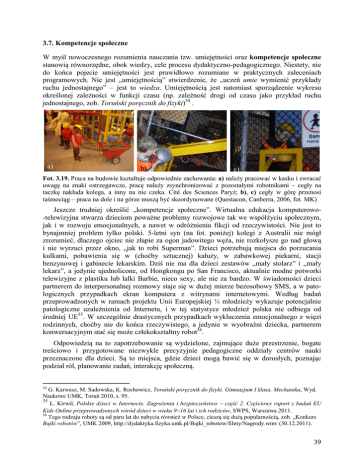 3.7. Kompetencje społeczne W myśl nowoczesnego rozumienia nauczania tzw. umiejętności oraz kompetencje społeczne stanowią równorzędne, obok wiedzy, cele procesu dydaktyczno-pedagogicznego. Niestety, nie do końca pojecie umiejętności jest prawidłowo rozumiane w praktycznych zaleceniach programowych. Nie jest „umiejętnością” stwierdzenie, że „uczeń umie wymienić przykłady ruchu jednostajnego” – jest to wiedza. Umiejętnością jest natomiast sporządzenie wykresu określonej zależności w funkcji czasu (np. zależność drogi od czasu jako przykład ruchu jednostajnego, zob. Toruński poręcznik do fizyki)34 . a) b) c) Fot. 3.19. Praca na budowie kształtuje odpowiednie zachowania: a) należy pracować w kasku i zwracać uwagę na znaki ostrzegawcze, pracę należy zsynchronizować z pozostałymi robotnikami – cegły na taczkę nakłada kolega, a inny na nie czeka. Cité des Sciences Paryż; b), c) cegły w górę przenosi taśmociąg – praca na dole i na górze muszą być skoordynowane (Questacon, Canberra, 2006, fot. MK) Jeszcze trudniej określić „kompetencje społeczne”. Wirtualna edukacja komputerowo-telewizyjna stwarza dzieciom poważne problemy rozwojowe tak we współżyciu społecznym, jak i w rozwoju emocjonalnych, a nawet w odróżnieniu fikcji od rzeczywistości. Nie jest to bynajmniej problem tylko polski. 5-letni syn (na fot. poniżej) kolegi z Australii nie mógł zrozumieć, dlaczego ojciec nie złapie za ogon jadowitego węża, nie rozkołysze go nad głową i nie wyrzuci przez okno, „jak to robi Superman”. Dzieci potrzebują miejsca do porzucania kulkami, pobawienia się w (choćby sztucznej) kałuży, w zabawkowej piekarni, stacji benzynowej i gabinecie lekarskim. Dziś nie ma dla dzieci zestawów „mały stolarz” i „mały lekarz”, a jedynie ujednolicone, od Hongkongu po San Francisco, aktualnie modne potworki telewizyjne z plastiku lub lalki Barbie, nieco sexy, ale nie za bardzo. W świadomości dzieci partnerem do interpersonalnej rozmowy staje się w dużej mierze bezosobowy SMS, a w patologicznych przypadkach ekran komputera z witrynami internetowymi. Według badań przeprowadzonych w ramach projektu Unii Europejskiej ⅓ młodzieży wykazuje potencjalnie patologiczne uzależnienia od Internetu, i w tej statystyce młodzież polska nie odbiega od średniej UE35. W szczególnie drastycznych przypadkach wykluczenia emocjonalnego z więzi rodzinnych, choćby nie do końca rzeczywistego, a jedynie w wyobraźni dziecka, partnerem konwersacyjnym stać się może człekokształtny robot36. Odpowiedzią na to zapotrzebowanie są wydzielone, zajmujące duże przestrzenie, bogate treściowo i przygotowane niezwykle precyzyjnie pedagogiczne oddziały centrów nauki przeznaczone dla dzieci. Są to miejsca, gdzie dzieci mogą bawić się w dorosłych, poznając podział ról, planowanie zadań, interakcję społeczną. 34 G. Karwasz, M. Sadowska, K. Rochowicz, Toruński poręcznik do fizyki. Gimnazjum I klasa. Mechanika, Wyd. Naukowe UMK, Toruń 2010, s. 95. 35 L. Kirwil, Polskie dzieci w Internecie. Zagrożenia i bezpieczeństwo − część 2. Częściowy raport z badań EU Kids Online przeprowadzonych wśród dzieci w wieku 9−16 lat i ich rodziców, SWPS, Warszawa 2011. 36 Tego rodzaju roboty są od paru lat do nabycia również w Polsce, cieszą się dużą popularnością, zob. „Konkurs Bajki robotów”, UMK 2009, http://dydaktyka.fizyka.umk.pl/Bajki_robotow/filmy/Nagrody.wmv (30.12.2011). 39 a) b) c) Fot. 3.20. Indywidualne kompetencje społeczne: a) Luis (3 lata) na placu budowy zajęty obsługą dźwigu; dźwig jest ręczny, obsługa taśmociągu za pomocą obracanej tarczy nie jest manualnie prosta; b) Luis, teraz technik radiolog, w ochronnym fartuchu bada za pomocą promieni Röntgena chorego kota; c) stacja benzynowa: „A gdzie się podziała obsługa?” (Questacon, Canberra, koncepcja i fot. MK) Centra dla małych dzieci, od wieku niemalże niemowlęcego, nie są bynajmniej zjawiskiem marginalnym ani lokalnym. W Australii jest to instytucja w stolicy, Canberze, zrealizowana jako centrum Zachodniego Pacyfiku wspólnie z Japonią i innymi krajami, zob. fot. 3.19 i 3.20. W Paryżu centrum dla dzieci jest częścią największego we Francji Cité des Sciences w Paryżu. Grupy przedszkolne zorganizowane rezerwują zabawę (i animatora) z dużym wyprzedzeniem. Oddzielnie urządzane są wystawy tematyczne, jak „dżungla” dla przedszkolaków albo wystawa medyczna „skąd się biorą dzieci” dla grupy wiekowej 7−10 lat. Kompetencje społeczne wykraczają znacznie dalej niż umiejętność rozróżnia fikcji od rzeczywistości czy umiejętność uczestnictwa we wspólnej zabawie. W obu tych działaniach dziecko pozostaje uczestnikiem, ale jeszcze nie twórcą. Zdobywane umiejętności pozostają też „do natychmiastowego wykorzystania” – dotyczą przeprowadzanych na bieżąco zabaw. Dydaktyka interaktywna w centrach naukowych może potencjalnie dostarczać kompetencji dla dorosłego, zawodowego i społecznego życia. a) b) c) Fot. 3.21. a) Podział pracy i role społeczne; piekarnia: chleb można wyjąć z pieca dopiero, kiedy spadnie temperatura wewnątrz ale należy użyć rękawic ochronnych; b) chleb gotowy, Luis i jego brat James (5 lat) za ladą w piekarni – James umie liczyć, a Luis musi bacznie obserwować; c) u Jamesa, w sklepie z pieczywem pierwszy klient emeryt, wolontariusz; rola społeczna Jamesa nagle wzrosła z doradcy dla młodszego brata na decydenta dla dorosłego klienta (Questacon, Canberra, fot. MK) „Dorosłe” kompetencje zdobywane przez dzieci w centrach nauki są różnorodne – od bezpieczeństwa i higieny pracy, przez podział ról wśród rówieśników, po role emocjonalnie eksponowane, jak obsługa dorosłych klientów w zabawowym sklepie. Przy projektowaniu centrów nauki niezbędne jest więc współdziałanie nie tylko naukowców i techników, ale też psychologów i
