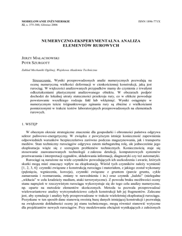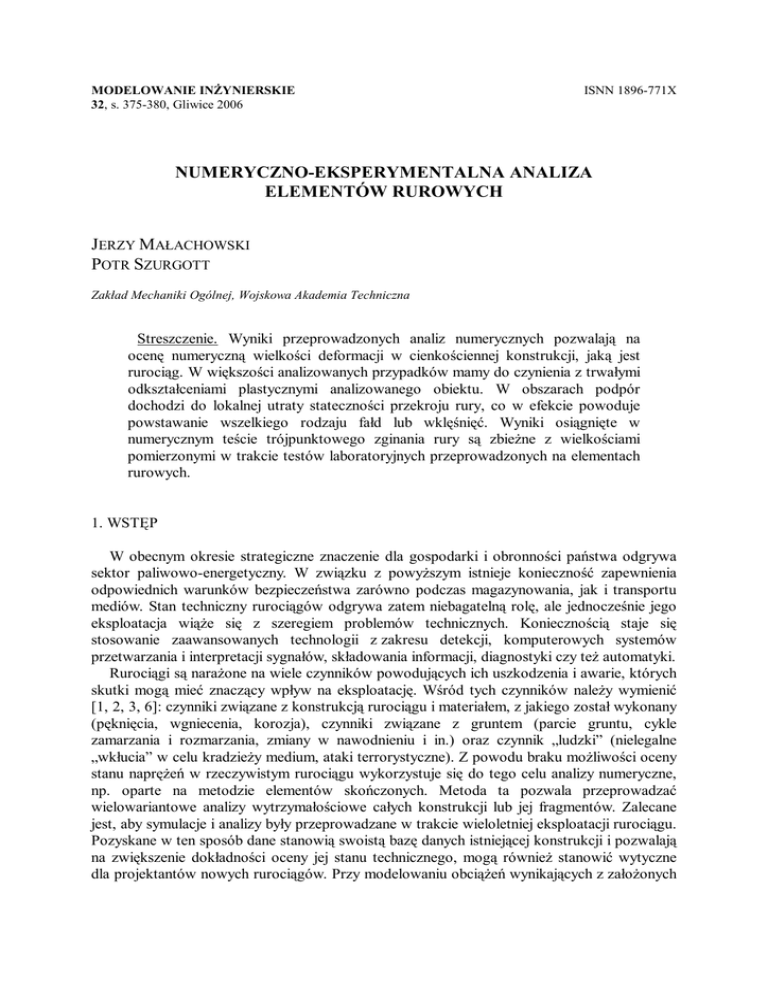 MODELOWANIE INŻYNIERSKIE 32, s. 375-380, Gliwice 2006 ISNN 1896-771X NUMERYCZNO-EKSPERYMENTALNA ANALIZA ELEMENTÓW RUROWYCH JERZY MAŁACHOWSKI POTR SZURGOTT Zakład Mechaniki Ogólnej, Wojskowa Akademia Techniczna Streszczenie. Wyniki przeprowadzonych analiz numerycznych pozwalają na ocenę numeryczną wielkości deformacji w cienkościennej konstrukcji, jaką jest rurociąg. W większości analizowanych przypadków mamy do czynienia z trwałymi odkształceniami plastycznymi analizowanego obiektu. W obszarach podpór dochodzi do lokalnej utraty stateczności przekroju rury, co w efekcie powoduje powstawanie wszelkiego rodzaju fałd lub wklęśnięć. Wyniki osiągnięte w numerycznym teście trójpunktowego zginania rury są zbieżne z wielkościami pomierzonymi w trakcie testów laboratoryjnych przeprowadzonych na elementach rurowych. 1. WSTĘP W obecnym okresie strategiczne znaczenie dla gospodarki i obronności państwa odgrywa sektor paliwowo-energetyczny. W związku z powyższym istnieje konieczność zapewnienia odpowiednich warunków bezpieczeństwa zarówno podczas magazynowania, jak i transportu mediów. Stan techniczny rurociągów odgrywa zatem niebagatelną rolę, ale jednocześnie jego eksploatacja wiąże się z szeregiem problemów technicznych. Koniecznością staje się stosowanie zaawansowanych technologii z zakresu detekcji, komputerowych systemów przetwarzania i interpretacji sygnałów, składowania informacji, diagnostyki czy też automatyki. Rurociągi są narażone na wiele czynników powodujących ich uszkodzenia i awarie, których skutki mogą mieć znaczący wpływ na eksploatację. Wśród tych czynników należy wymienić [1, 2, 3, 6]: czynniki związane z konstrukcją rurociągu i materiałem, z jakiego został wykonany (pęknięcia, wgniecenia, korozja), czynniki związane z gruntem (parcie gruntu, cykle zamarzania i rozmarzania, zmiany w nawodnieniu i in.) oraz czynnik „ludzki” (nielegalne „wkłucia” w celu kradzieży medium, ataki terrorystyczne). Z powodu braku możliwości oceny stanu naprężeń w rzeczywistym rurociągu wykorzystuje się do tego celu analizy numeryczne, np. oparte na metodzie elementów skończonych. Metoda ta pozwala przeprowadzać wielowariantowe analizy wytrzymałościowe całych konstrukcji lub jej fragmentów. Zalecane jest, aby symulacje i analizy były przeprowadzane w trakcie wieloletniej eksploatacji rurociągu. Pozyskane w ten sposób dane stanowią swoistą bazę danych istniejącej konstrukcji i pozwalają na zwiększenie dokładności oceny jej stanu technicznego, mogą również stanowić wytyczne dla projektantów nowych rurociągów. Przy modelowaniu obciążeń wynikających z założonych 376 J. MAŁACHOWSKI, P. SZURGOTT warunków eksploatacji projektowanego rurociągu, istnieje możliwość oceny, czy badana konstrukcja spełnia podstawowe kryteria wytrzymałościowe. 2. BADANIA EKSPERYMENTALNE Symulacje numeryczne wybranych stanów obciążenia rurociągów pozwalają na kompleksowe analizy w zakresie nieliniowym, z uwzględnieniem dużych przemieszczeń i odkształceń. Tego typu przypadki są najczęściej spotykane w warunkach eksploatacji rurociągów. W miejscach, gdzie rurociąg spoczywa na podporach, mogą wystąpić wszelkiego rodzaju wgniecenia, fałdy, owalizacje przekroju poprzecznego, a towarzyszące temu odkształcenia osiągają znaczne wartości. Proces zginania rur zachodzi w momencie, gdy rurociąg utraci kontakt z podłożem wskutek np. podmycia, osunięcia się ziemi, ruchów tektonicznych, występowania obszarów bagiennych itp. Badania własne próby trójpunktowego zginania przeprowadzono na uniwersalnej maszynie wytrzymałościowej z wykonaną we własnym zakresie trawersą, umożliwiającą zginanie rur o długości do 4 m. Szczegóły dotyczące wyznaczenia danych materiałowych, jak też samego eksperymentu wraz z analizą otrzymanych wyników, zostały wcześniej opublikowane w pracy [5]. W trakcie prowadzonych badań były cyklicznie rejestrowane w komputerze takie wielkości jak przemieszczenia (pomiar strzałki ugięcia), odkształcenia oraz siła obciążająca. Schemat rozmieszczenia tensometrów oraz obraz uzyskanej deformacji w trakcie testów eksperymentalnych przedstawiony jest rys. 1. Rys. 1. Obraz uzyskanej deformacji wraz ze schematem rozmieszczenie tensometrów w połowie rozpiętości rury, na jej górnej i dolnej powierzchni 3. ANALIZA NUMERYCZNA PRÓBY TRÓJPUNKTOWEGO ZGINANIA 3.1 Uwagi ogólne do analizy numerycznej Z uwagi na silne nieliniowości, które miały miejsce w trakcie realizowanych badań eksperymentalnych, do rozwiązania problemu zastosowano metodę elementów skończonych. Podstawowym pojęciem w podejściu przyrostowym obliczeń MES [4] w zakresie sprężystoplastycznym jest krok obciążenia, w którym obciążenie działające na konstrukcje jest zwiększone o zadany przyrost ∆R: R( t ) = R( t − 1) + ∆R (1) Stosując podejście przyrostowe metody elementów skończonych [4] w zagadnieniach z nieliniową charakterystyką (naprężenie-odkształcenie) równanie różniczkowe równanie równowagi można zapisać w następującej postaci: k K ⋅ ∆U = k +1R − kF (2) NUMERYCZNO-EKSPERYMENTALNA ANALIZA ELEMENTÓW RUROWYCH 377 gdzie: k - krok obciążenia, który można interpretować jako chwilę t, w której obciążenie przyjmuje wartość R(t), kK - styczna macierz sztywności w kroku obciążenia k, ∆U - wektor przyrostów przemieszczeń węzłów w kroku k, kF - wektor naprężeń aktualnych (w kroku k) oraz k +1R - wektor sił węzłowych w kroku obciążeniowym k +1. Występująca w macierzowym równaniu równowagi (2) macierz styczna kK jest tzw. macierzą sprężysto-plastyczną, wynikającą z przyrostowej postaci prawa konstytutywnego. Rozwiązanie równania (2) odbywa się iteracyjnie. Do wyznaczenia stanu odkształcenia i naprężenia wykorzystano teorię dużych przemieszczeń i odkształceń. Do opisu materiału w analizie