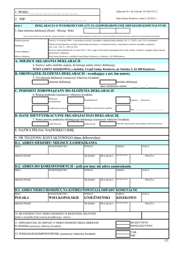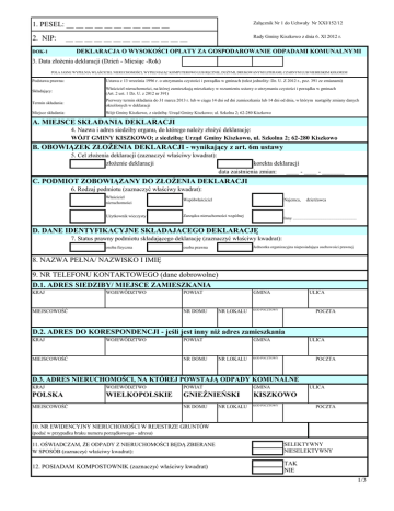 1. PESEL: __ __ __ __ __ __ __ __ __ __ __ Załącznik Nr 1 do Uchwały Nr XXI/152/12 2. NIP: Rady Gminy Kiszkowo z dnia 6. XI 2012 r. __ __ __ __ __ __ __ __ __ __ __ __ __ DEKLARACJA O WYSOKOŚCI OPŁATY ZA GOSPODAROWANIE ODPADAMI KOMUNALNYMI DOK-1 3. Data złożenia deklaracji (Dzień - Miesiąc -Rok) POLA JASNE WYPEŁNIA WŁAŚCICIEL NIERUCHOMOŚCI, WYPEŁNIAJĄC KOMPUTEROWO LUB RĘCZNIE, DUŻYMI, DRUKOWANYMI LITERAMI, CZARNYM LUB NIEBIESKIM KOLOREM Podstawa prawna: Ustawa z 13 września 1996 r. o utrzymaniu czystości i porządku w gminach (tekst jednolity: Dz. U. Z 2012 r., poz. 391 ze zmianami) Składający: Właściciel nieruchomości, na której zamieszkują mieszkańcy w rozumieniu ustawy o utrzymaniu czystości i porządku w gminach (Art. 2 ust. 1 Dz. U. z 2012 nr 391) Termin składania: Pierwszy termin składania do 31 marca 2013 r. lub w ciągu 14 dni od dni zamieszkania lub 14 dni od dnia, w którym nastąpiły zmiany danych określonych w deklaracji Miejsce składania: Wójt Gminy Kiszkowo, z siedzibą: Urząd Gminy Kiszkowo; ul. Szkolna 2; 62-280 Kiszkowo A. MIEJSCE SKŁADANIA DEKLARACJI 4. Nazwa i adres siedziby organu, do którego należy złożyć deklarację: WÓJT GMINY KISZKOWO; z siedzibą: Urząd Gminy Kiszkowo, ul. Szkolna 2; 62-280 Kiszkowo B. OBOWIĄZEK ZŁOŻENIA DEKLARACJI - wynikający z art. 6m ustawy 5. Cel złożenia deklaracji (zaznaczyć właściwy kwadrat): złożenie deklaracji korekta deklaracji data zaistnienia zmian: ____ - ____ - _______ C. PODMIOT ZOBOWIĄZANY DO ZŁOŻENIA DEKLARACJI 6. Rodzaj podmiotu (zaznaczyć właściwy kwadrat): Właściciel nieruchomości Współwłaściciel Użytkownik wieczysty Zarządca nieruchomości wspólnej Najemca, dzierżawca Inny ......................................................... D. DANE IDENTYFIKACYJNE SKŁADAJACEGO DEKLARACJĘ 7. Status prawny podmiotu składającego deklarację (zaznaczyć właściwy kwadrat): osoba fizyczna Jednostka organizacyjna nieposiadająca osobowości prawnej osoba prawna 8. NAZWA PEŁNA/ NAZWISKO I IMIĘ 9. NR TELEFONU KONTAKTOWEGO (dane dobrowolne) D.1. ADRES SIEDZIBY/ MIEJSCE ZAMIESZKANIA KRAJ WOJEWÓDZTWO MIEJSCOWOŚĆ POWIAT NR DOMU GMINA NR LOKALU ULICA KOD POCZTOWY POCZTA D.2. ADRES DO KORESPONDENCJI - jeśli jest inny niż adres zamieszkania KRAJ WOJEWÓDZTWO MIEJSCOWOŚĆ POWIAT NR DOMU GMINA NR LOKALU ULICA KOD POCZTOWY POCZTA D.3. ADRES NIERUCHOMOŚCI, NA KTÓREJ POWSTAJĄ ODPADY KOMUNALNE KRAJ WOJEWÓDZTWO POWIAT GMINA POLSKA WIELKOPOLSKIE GNIEŹNIEŃSKI KISZKOWO NR DOMU KOD POCZTOWY MIEJSCOWOŚĆ NR LOKALU ULICA POCZTA 10. NR EWIDENCYJNY NIERUCHOMOŚCI W REJESTRZE GRUNTÓW (podać w przypadku braku numeru porządkowego - adresu) 11. OŚWIADCZAM, ŻE ODPADY Z NIERUCHOMOŚCI BĘDĄ ZBIERANE W SPOSÓB (zaznaczyć właściwy kwadrat): SELEKTYWNY NIESELEKTYWNY 12. POSIADAM KOMPOSTOWNIK (zaznaczyć właściwy kwadrat) TAK NIE 1/3 E.1. OPŁATA ZA GOSPODAROWANIE ODPADAMI KOMUNALNYMI - nieruchomości zamieszkałe E.1.1. Odpady zbierane w sposób selektywny Liczba gospodarstw domowych Wielkość gospodarstwa domowego Należność w zł Stawka opłaty (liczba gosp. x stawka) 9 zł 18 zł 27 zł 36 zł 45 zł 46 zł 47 zł 48 zł 49 zł 50 zł 51 zł 52 zł 53 zł 54 zł 55 zł 1 osoba 2 osoby 3 osoby 4 osoby 5 osób 6 osób 7 osób 8 osób 9 osób 10 osób 11 osób 12 osób 13 osób 14 osób 15 i więcej osób Razem: E.1.2. Odpady zbierane w sposób nieselektywny Liczba gospodarstw domowych Wielkość gospodarstwa domowego Należność w zł Stawka opłaty (liczba gosp. x stawka) 20 zł 40 zł 60 zł 80 zł 100 zł 120 zł 140 zł 160 zł 180 zł 200 zł 220 zł 240 zł 260 zł 280 zł 300 zł 1 osoba 2 osoby 3 osoby 4 osoby 5 osób 6 osób 7 osób 8 osób 9 osób 10 osób 11 osób 12 osób 13 osób 14 osób 15 i więcej osób Razem: E.2. OPŁATA ZA GOSPODAROWANIE ODPADAMI KOMUNALNYMI - nieruchomości niezamieszkałe E.2.1. WYSOKOŚĆ MIESIĘCZNEJ OPŁATY ZA E.2.2. WYSOKOŚĆ MIESIĘCZNEJ OPŁATY ZA GOSPODAROWANIE ODPADAMI KOMUNALNYMI GOSPODAROWANIE ODPADAMI KOMUNALNYMI ZBIERANYMI SELEKTYWNIE ZBIERANYMI NIESELEKTYWNIE LICZBA POJEMNIKÓW 120 L STAWKA OPŁATY NALEZNOŚĆ LICZBA POJEMNIKÓW 120 L STAWKA OPŁATY NALEZNOŚĆ LICZBA POJEMNIKÓW 240 L STAWKA OPŁATY NALEZNOŚĆ LICZBA POJEMNIKÓW 240 L STAWKA OPŁATY NALEZNOŚĆ LICZBA POJEMNIKÓW1100 L STAWKA OPŁATY NALEZNOŚĆ LICZBA POJEMNIKÓW1100 L STAWKA OPŁATY NALEZNOŚĆ SUMA SUMA F. OŚWIADCZENIE I PODPIS OSOBY SKŁADAJĄCEJ DEKLARACJĘ Oświadczam, że złożone przeze mnie informacje zawarte w deklaracji, są zgodne z prawdą. DATA CZYTELNY PODPIS (Z PODANIEM IMIENIA I NAZWISKA; PIECZĄTKA OSOBY UPOWAŻNIONEJ) POUCZENIE W przypadku nie wpłacenia w określonych ustawowo terminach kwoty opłaty lub wpłacenia jej w niepełnej wysokości, niniejsza deklaracja stanowi podstawę do wystawienia tytułu wykonawczego, zgodnie z przepisami ustawy z 17 czerwca 1966 r. o postępowaniu egzekucyjnym w administracji (Dz. U. z 2005 r. Nr 229, poz. 1954 ze zmianami). Zgodnie z art. 6m ustawy z 13 września 1996 r. o utrzymaniu czystości i porządku w gminach, właściciel nieruchomości jest obowiązany złożyć do właściwego organu deklarację o wysokości opłaty za gospodarowanie odpadami komunalnymi w terminie 14 dni od dnia zamieszkania na danej nieruchomości pierwszego mieszkańca. W przypadku zmiany danych będących podstawą ustalenia wysokości należnej opłaty za gospodarowanie odpadami komunalnymi, właściciel nieruchomości jest obowiązany złożyć nową deklarację w terminie 14 dni od dnia nastąpienia zmiany. Zgodnie z art. 6o w/ ustawy, w razie niezłożenia deklaracji o wysokości opłaty za gospodarowanie odpadami komunalnymi albo uzasadnionych wątpliwości co do danych zawartych w deklaracji właściwy organ określa, w drodze decyzji, wysokość opłaty za gospodarowanie odpadami komunalnymi, biorąc pod uwagę uzasadnione szacunki. G. ADNOTACJE ORGANU