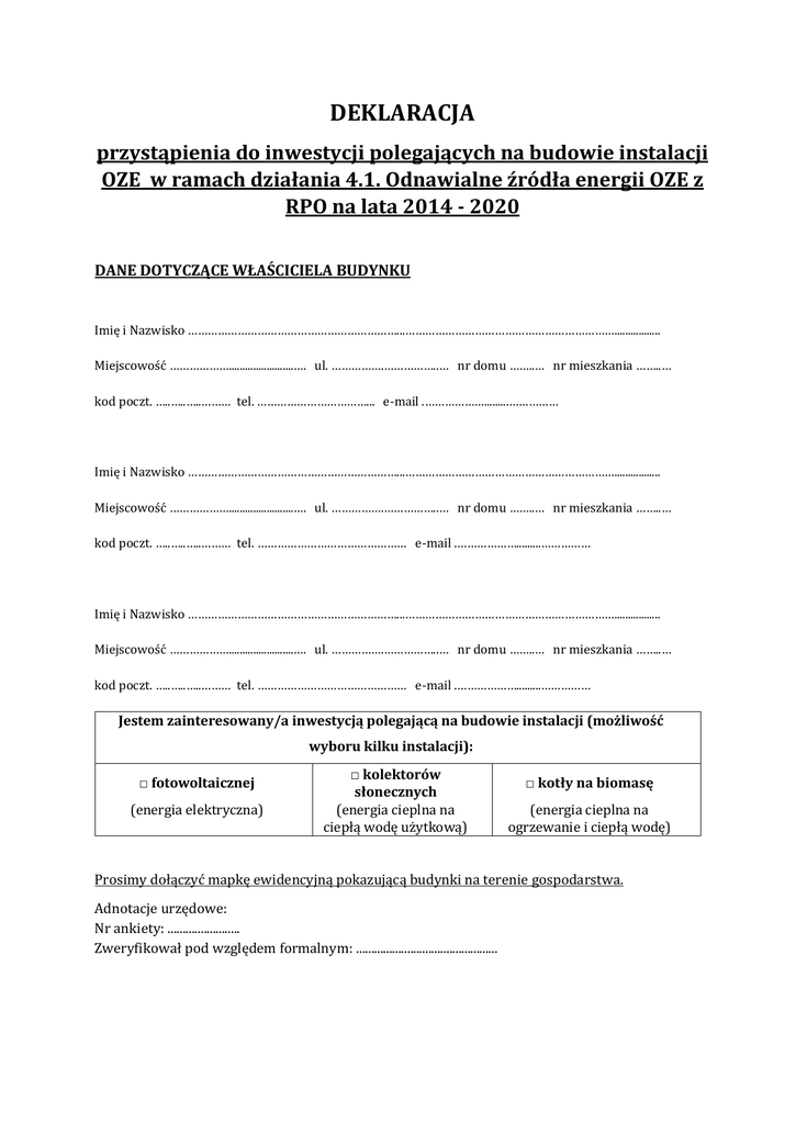 DEKLARACJA przystąpienia do inwestycji polegających na budowie instalacji OZE w ramach działania 4.1. Odnawialne źródła energii OZE z RPO na lata 2014 - 2020 DANE DOTYCZĄCE WŁAŚCICIELA BUDYNKU Imię i Nazwisko ………………………………………………………...………………………………………………………................. Miejscowość ………………........................…. ul. …………….……………..… nr domu ……..… nr mieszkania ……..… kod poczt. …..…..…..……… tel. ……………………………... e-mail .……………….........…………… Imię i Nazwisko ………………………………………………………...………………………………………………………................. Miejscowość ………………........................…. ul. …………….……………..… nr domu ……..… nr mieszkania ……..… kod poczt. …..…..…..……… tel. ……………………………………… e-mail .……………….........…………… Imię i Nazwisko ………………………………………………………...………………………………………………………................. Miejscowość ………………........................…. ul. …………….……………..… nr domu ……..… nr mieszkania ……..… kod poczt. …..…..…..……… tel. ……………………………………… e-mail .……………….........…………… Jestem zainteresowany/a inwestycją polegającą na budowie instalacji (możliwość wyboru kilku instalacji): □ fotowoltaicznej (energia elektryczna) □ kolektorów słonecznych (energia cieplna na ciepłą wodę użytkową) □ kotły na biomasę (energia cieplna na ogrzewanie i ciepłą wodę) Prosimy dołączyć mapkę ewidencyjną pokazującą budynki na terenie gospodarstwa. Adnotacje urzędowe: Nr ankiety: ........................ Zweryfikował pod względem formalnym: ............................................... I. Charakterystyka obiektów budowlanych wchodzących w skład gospodarstwa domowego Budynek Mieszkalny Budynek inny niż mieszkalny Posiadany tytuł prawny do obiektu (1) tak / nie tak / nie Powierzchnia użytkowa budynku poniżej 300 m2 (2) tak / nie tak / nie Wyszczególnienie Numer działki/-ek (na której mieści się obiekt) Adres nieruchomości Rok budowy (dla obiektów w budowie rok oddania do użytkowania) Liczba osób zamieszkujących na stałe w budynku Uwaga: W przypadku deklaracji na fotowoltaikę jeżeli użytkownik zgadza się na ewentualny montaż urządzeń na budynku innym niż mieszkalny należy wypełnić kolumnę „Budynek inny niż mieszkalny” Tabelę poniżej wypełniają osoby zainteresowane panelami fotowoltaicznymi i/lub kolektorami: Powierzchnia POŁUDNIOWEJ ekspozycji dachu dla instalacji wykorzystującej energię słońca w [m2] Rodzaj pokrycia dachowego(3) Czy planowana zmiana poszycia dachowego w przeciągu roku. (dotyczy eternitu) tak / nie tak / nie W przypadku braku połaci dachowej o ekspozycji południowej lub braku miejsca na niej wyrażam zgodę na : Montaż na południowej elewacji tak / nie * tak / nie * Powierzchnia tej elewacji w [m2] ……………[m2] ……………[m2] Montaż paneli fotowoltaicznych na gruncie (nie dotyczy kolektorów słonecznych) tak / nie * Tabelę poniżej wypełniają osoby zainteresowane kotłami na biomasę: Powierzchnia ogrzewana budynku w m2 Technologia budowy budynku (np. cegła, pustak, drewno itd.) Czy budynek jest ocieplony Czy poddasze/dach jest ocieplony ……………[m2] tak / nie tak / nie Jaka jest grubość docieplenia (izolacji) Typ instalacji centralnego ogrzewania (np. grzejnikowa, podłogowe) Temperatura pracy instalacji centralnego ogrzewania zasilanie/powrót ( np. 90/70˚C) Moc obecnego źródła ciepła/pieca w kW Dostępna powierzchnia 8 m2 (np. w kotłowni) na potrzeby urządzeń ……………[cm] ………..…[°C] …………[kW] tak / nie * ……………[m2] Rodzaj ogrzewania Kocioł(piec) – drewno/węgiel tak / nie Kocioł(piec) gazowy tak / nie Kocioł(piec) olejowy tak / nie Kocioł(piec) na pelet tak / nie Ogrzewanie elektryczne tak / nie Instalacja solarna na ciepłą wodę tak / nie Bojler elektryczny na ciepłą wodę tak / nie Inny, wskazać jaki ………………………………. (1) tytuł prawny do władania nieruchomością jest niezbędny do uzyskania przyłącza mikroinstalacji do sieci (najczęściej spotykanymi tytułami do władania nieruchomością są: prawo własności, prawo użytkowania wieczystego, użytkowanie, dzierżawa, najem, lub samoistne posiadanie), (2) montaż instalacji na budynkach o powierzchni użytkowej powyżej 300 m2 będzie obciążony stawką podatku VAT w wysokości 23%, zaś na budynkach o powierzchni użytkowej poniżej 300 m2 będzie obciążony stawką podatku VAT w wysokości 8%. Powierzchnia użytkowa budynku będzie weryfikowana przez Urząd Gminy. Montaż instalacji fotowoltaicznej na gruncie lub budynku gospodarczym będzie obciążony stawką podatku VAT w wysokości 23%, (3) rodzaju pokrycia dachowego - eternit, blacha, itp... Jeżeli na budynku, którego użytkownik chce zamontować instalację jest eternit proszę podać czy w przeciągu roku planuję się wymianę poszycia. Wypełniają osoby zainteresowane panelami fotowoltaicznymi: Czy pod jeden licznik jest przyłączony*: a) Budynek/-ki mieszkalne bez działalności gospodarczej lub rolnej b) Budynek mieszkalny i działalność gospodarcza lub rolna. * - właściwe zaznaczyć II. Wykaz energochłonnych urządzeń elektrycznych w gospodarstwie domowym Rodzaj urządzenia Szt. Rodzaj urządzenia Lodówka Żelazko Zamrażalka Odkurzacz Pralka Hydrofor Zmywarka Czajnik elektryczny Kuchenka elektryczna Grzejnik elektryczny Kuchenka mikrofalowa Suma żarówek Piekarnik elektryczny Komputer Prodiż Suszarka do włosów Okap kuchenny Telewizo