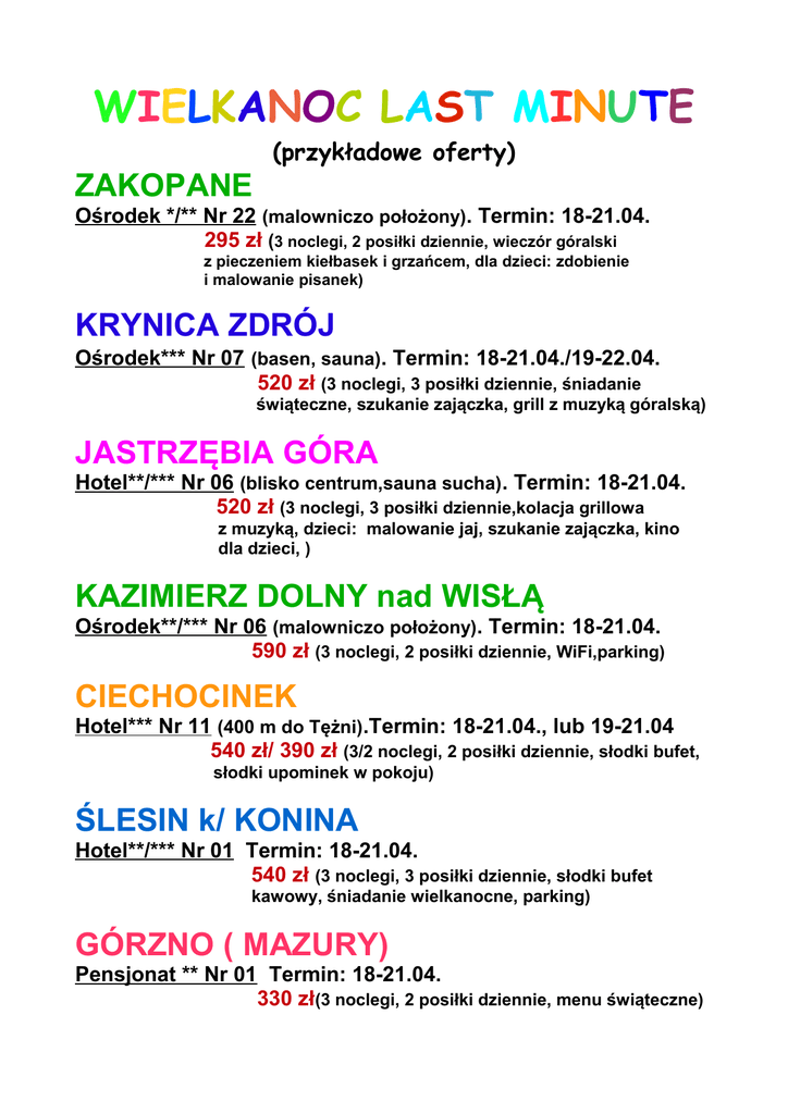 WIELKANOC LAST MINUTE (przykładowe oferty) ZAKOPANE Ośrodek */** Nr 22 (malowniczo położony). Termin: 18-21.04. 295 zł (3 noclegi, 2 posiłki dziennie, wieczór góralski z pieczeniem kiełbasek i grzańcem, dla dzieci: zdobienie i malowanie pisanek) KRYNICA ZDRÓJ Ośrodek*** Nr 07 (basen, sauna). Termin: 18-21.04./19-22.04. 520 zł (3 noclegi, 3 posiłki dziennie, śniadanie świąteczne, szukanie zajączka, grill z muzyką góralską) JASTRZĘBIA GÓRA Hotel**/*** Nr 06 (blisko centrum,sauna sucha). Termin: 18-21.04. 520 zł (3 noclegi, 3 posiłki dziennie,kolacja grillowa z muzyką, dzieci: malowanie jaj, szukanie zajączka, kino dla dzieci, ) KAZIMIERZ DOLNY nad WISŁĄ Ośrodek**/*** Nr 06 (malowniczo położony). Termin: 18-21.04. 590 zł (3 noclegi, 2 posiłki dziennie, WiFi,parking) CIECHOCINEK Hotel*** Nr 11 (400 m do Tężni).Termin: 18-21.04., lub 19-21.04 540 zł/ 390 zł (3/2 noclegi, 2 posiłki dziennie, słodki bufet, słodki upominek w pokoju) ŚLESIN k/ KONINA Hotel**/*** Nr 01 Termin: 18-21.04. 540 zł (3 noclegi, 3 posiłki dziennie, słodki bufet kawowy, śniadanie wielkanocne, parking) GÓRZNO ( MAZURY) Pensjonat ** Nr 01 Termin: 18-21.04. 330 zł(3 noclegi, 2 posiłki dziennie, menu świąteczne)