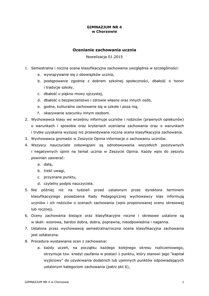 GIMNAZJUM NR 4 w Chorzowie Ocenianie zachowania ucznia Nowelizacja 01.2015 1. Semestralna i roczna ocena klasyfikacyjna zachowania uwzględnia w szczególności: a. wywiązywanie się z obowiązków ucznia, b. postępowanie zgodnie z dobrem szkolnej społeczności, dbałość o honor i tradycje szkoły, c. dbałość o piękno mowy ojczystej, d. dbałość o bezpieczeństwo i zdrowie własne oraz innych osób, e. godne, kulturalne zachowanie się w szkole i poza nią, f. okazywanie szacunku innym osobom. 2. Wychowawca klasy we wrześniu informuje uczniów i rodziców (prawnych opiekunów) o warunkach i sposobie oraz kryteriach oceniania zachowania oraz o warunkach i trybie uzyskania wyższej niż przewidywana roczna ocena klasyfikacyjna zachowania. 3. Wychowawca gromadzi w Zeszycie Opinia informacje o zachowaniu uczniów. 4. Wszyscy nauczyciele zobowiązani są odnotowywania wszystkich pozytywnych i negatywnych opinii na temat ucznia w Zeszycie Opinia. Każdy wpis do zeszytu powinien zawierać: a. datę, b. treść uwagi, c. przyznane punkty, d. czytelny podpis nauczyciela. 5. Nie później niż klasyfikacyjnego na tydzień posiedzenia przed Rady ustalonym Pedagogicznej przez dyrektora wychowawcy klas terminem informują uczniów i ich rodziców o ocenach zachowania (wpis proponowanej oceny okresowej lub rocznej). 6. Oceny zachowania bieżące oraz klasyfikacyjne roczne i okresowe ustalone są w skali: wzorowa, bardzo dobra, dobra, poprawna, nieodpowiednia i naganna. 7. Ustalona przez wychowawcę semestralna/roczna ocena klasyfikacyjna zachowania jest ostateczna. 8. Procedura wystawiania ocen z zachowania: a. każdy uczeń, na początku każdego kolejnego okresu rozliczeniowego, otrzymuje tzw. kredyt zaufania w postaci 1 punktu, który stanowi jego "kapitał wyjściowy" do uzyskiwania dodatnich lub ujemnych punktów odpowiadających ustalonym kategoriom zachowania (patrz pkt 6), GIMNAZJUM NR 4 w Chorzowie 1 b. szczegółowa punktacja (patrz pkt 10) w odniesieniu do poszczególnych uczniów oraz uzyskiwane na tej podstawie punkty są wpisywane do Zeszytu Opinia, c. ocena roczna stanowi średnią arytmetyczną punktów uzyskanych w pierwszym i drugim semestrze roku szkolnego, d. wychowawca jest zobowiązany do posiadania dokumentacji potwierdzającej wystawioną ocenę z zachowania oraz uzasadnienia oceny nieodpowiedniej i nagannej (pisemne usprawiedliwienia nieobecności, wpisy w Zeszycie Opinia). Rodzice (prawni opiekunowie) mają wgląd do prowadzonej dokumentacji, e. uczeń dokonuje samooceny wypisując swoje osiągnięcia i sukcesy, które uwzględnia wychowawca, f. nauczyciel, uczący w danej klasie dysponuje pulą 0-5 punktów, które przyznaje każdemu uczniowi na zakończenie I okresu lub roku szkolnego. Wychowawca wyznacza średnią arytmetyczną z ilości przyznanych punktów, a następnie dolicza punkty wg następujących przedziałów: GIMNAZJUM NR 4 w Chorzowie Średnia arytmetyczna wystawionych punktów przez nauczycieli Ilość punktów 4,75 – 5,00 4,25 – 4,74 3,75 – 4,24 3,25 – 3,74 2,75 – 3,24 2,25 – 2,74 1,75 – 2,24 1,25 – 1,74 0,75 – 1,24 0 – 0,74 30 25 20 15 10 5 0 -5 -10 -15 2 9. Ocenę zachowania zatwierdza Rada Pedagogiczna. 10. Kryteria oceny z zachowania wraz z punktacją: PUNKTY DODATNIE Kategoria zachowania Ilość punktów 1. Jest zawsze punktualny (nie posiada ani jednego nieusprawiedliwionego spóźnienia). +5 (za każdy miesiąc) 2. Nie ma ani jednej nieusprawiedliwionej godziny. + 10 (za każdy miesiąc) 3. Nie ma negatywnych uwag dotyczących zachowania. +20 (jednorazowo za dany okres rozliczeniowy) 4. Bierze udział w wewnątrzszkolnych konkursach przedmiotowych i zawodach sportowych : a) udział w konkursie / zawodach, b) zajęcie 1, 2 lub 3 miejsca lub wyróżnienie. +5 (za każdy konkurs), +20 (1 miejsce), +15 (2 miejsce), +10 (3 miejsce i wyróżnienie) 5. Bierze udział w pozaszkolnych konkursach przedmiotowych i zawodach sportowych (na szczeblu miejskim): a) udział w konkursie / zawodach, b) zajęcie 1, 2 lub 3 miejsca lub wyróżnienie. +5 (za każdy konkurs), +30 (1 miejsce), +25 (2 miejsce), +20 (3 miejsce i wyróżnienie) 6. Jest laureatem /finalistą pozaszkolnych konkursów przedmiotowych, artystycznych lub sportowych (na szczeblu wojewódzkim lub ogólnopolskim) +50 (za udział) 7. Udział w uroczystościach miejskich: w dni wolne od zajęć dydaktycznych i święta w czasie wakacji i ferii +50 (każdorazowo) +70 (każdorazowo) 8. Udział w uroczystościach/spotkaniach popołudniowych +30 (każdorazowo) 9. Bierze udział w organizacji imprez klasowych lub szkolnych +5 (za każdą klasową), +10 (za każdą szkolną) 10. Wzbogaca klasopracownię (kwiaty, dekoracje, gazetka, dodatkowe pomoce) +5 11. Bierze udział w zbiórce surowców wtórnych. (Zbiórka odbywa się do końca maja) +10 (10kg makulatury) +10 (za 100 nakrętek) 12. Ma pochwałę dotyczącą zachowania nie wymienionego w powyższych kryteriach +5 (za każdą pochwałę) 13. Bierze udział w akcjach szkolnych o charakterze charytatywnym. +15 (każdorazowo) 14. Systematycznie oszczędza w SKO +10 (jednorazowo za dany okres rozliczeniowy) 15. Otrzymał(a) pisemną pochwałę dyrekcji szkoły. +20 (za każdą pochwałę) GIMNAZJUM NR 4 w Chorzowie 3 16. Bierze aktywny i systematyczny udział w pracy samorządu klasowego lub samorządu uczniowskiego. +10 (praca w samorządzie klasowym - jednorazowo za dany okres rozliczeniowy), +20 (praca w samorządzie szkolnym - jednorazowo za dany okres rozliczeniowy) PUNKTY UJEMNE Kategoria zachowania Ilość punktów 1. Ma godziny nieusprawiedliwione. -2 (za każdą godzinę) 2. Ma nieusprawiedliwione spóźnienia. -1 (za każde spóźnienie) 3.Ma uwagi dotyczące negatywnego zachowania nie wymienione w kryteriach oceny zachowania. -5 (za każdą uwagę) 4. Używa wulgaryzmów i obraźliwych gestów. -10 (za każdą uwagę wpisaną do zeszytu opinia) 5. Jest arogancki i niekulturalny wobec rówieśników i osób dorosłych. -