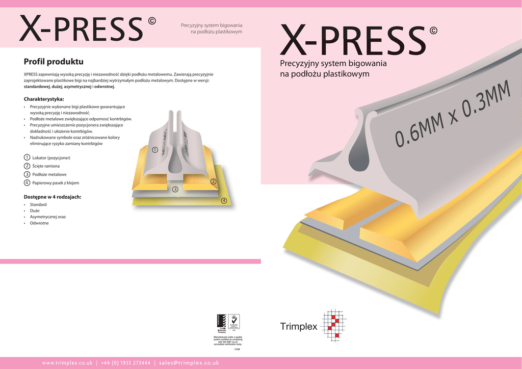 X-PRESS © Precyzyjny system bigowania na podłożu plastikowym Profil produktu X-PRESS Precyzyjny system bigowania na podłożu plastikowym XPRESS zapewniają wysoką precyzję i niezawodność dzięki podłożu metalowemu. Zawierają precyzyjnie zaprojektowane plastikowe bigi na najbardziej wytrzymałym podłożu metalowym. Dostępne w wersji: standardowej, dużej, asymetrycznej i odwrotnej. Charakterystyka: • Precyzyjnie wykonane bigi plastikowe gwarantujące wysoką precyzję i niezawodność. Podłoże metalowe zwiększające odpornosć kontrbigów. Precyzyjne umieszczenie pozycjonera zwiększające dokładność i ułożenie kontrbigów. Nadrukowane symbole oraz zróżnicowane kolory eliminujące ryzyko zamiany kontrbigów • • • 1 1 Lokator (pozycjoner) 2 Ścięte ramiona 3 Podłoże metalowe 4 2 Papierowy pasek z klejem 3 Dostępne w 4 rodzajach: • • • • 4 Standard Duże Asymetrycznej oraz Odwrotne 018 Manufactured under a quality system certified as complying with ISO 9001 by an accredited certification body. 12/09 www.trimplex.co.uk | +44 (0) 1933 273444 | s a l e s @ t r i m pl e x. co . u k Trimplex © X-PRESS © Precyzyjny system bigowania na podłożu plastikowym Standardowe Asymetryczne (Off centre) Podłoże metalowe Podłoże metalowe Dokładnie wykonane plastikowe kontrbigi na podłożu metalowym z precyzyjnym lokatorem. Standardowe opakowanie posiada 36 kontrbigów, każdy po 700mm. Specjalnie zaprojektowane kontrbigi do precyzyjnych prac blisko siebie. Odległości pomiędzy bigami mogą być ustalone w następujący sposób: Odległość środka do środka (C) = 2x szerokość ramienia (i.e 1.5mm) plus szerokość bigi (B). Standardowe opakowanie posiada 36 kontrbigów, każdy po 700mm. Kolor A x B Grubość (mikrony) Gramatura (g/m2) Kod (0.001") Platinum 0.40 x 0.50 100 2-4 50-100 XS-050-040 Orange 0.40 x 0.80 100 2-6 50-150 XS-080-040 Beige 0.40 x 1.00 100-200 4-8 100-175 XS-100-040 Pale Blue 0.40 x 1.30 300-400 12-16 225-275 XS-130-040 White 0.45 x 1.30 325-400 13-16 240-270 XS-130-045 Bright Green 0.50 x 1.30 325-500 13-20 240-375 XS-130-050 Black 0.55 x 1.30 325-450 13-18 240-300 XS-130-055 Apple Green 0.45 x 1.50 375-450 15-18 260-300 XS-150-045 Yellow 0.50 x 1.50 425-500 17-20 290-335 XS-150-050 Rosewood 0.70 x 1.50 475-550 19-22 350-365 XS-150-070 Violet 0.50 x 1.70 475-500 19-22 350-375 XS-170-050 Beige Powder Blue 0.55 x 1.70 500-550 20-22 335-365 XS-170-055 White Purple 0.60 x 1.70 525-600 20-24 350-400 XS-170-060 Yellow Olive 0.50 x 1.90 500-550 20-24 335-365 XS-190-050 Green 0.60 x 1.90 525-600 20-24 350-400 XS-190-060 Ash Grey 0.80 x 1.90 550-600 22-24 365-400 XS-190-080 Ebony 0.50 x 2.10 500-550 20-22 335-365 XS-210-050 Burgundy 0.65 x 2.10 575-650 23-26 385-435 XS-210-065 Pink 0.80 x 2.10 600-700 24-28 400-465 XS-210-080 Odwrotne (Reverse) Red 0.70 x 2.30 625-700 25-28 420-465 XS-230-070 Podłoże metalowe Blue 0.80 x 2.70 700-800 28-32 465-535 XS-270-080 Standardowe pozycjonery pasują do rozmiaru 2-3. Kolor A x B Grubość Gramatura (g/m2) Kod (mikrony) (0.001") 0.40 x 1.00 100-200 4-8 100-175 XO-310-040 0.45 x 1.30 340-410 13-16 240-270 XO-313-045 0.50 x 1.50 440-500 17-20 290-335 XO-315-050 Gramatura (g/m2) Kod 260-300 XR-270-007 Standardowe pozycjonery pasują do rozmiaru 2-3. Xpress odwrotne przeznaczone są do produkcji bigowej podczas cięcia z odwrotnej strony. Standardowe kontrbigi do szerokości 2.7mm mają 36 pasków w każdym pudełku a większe rozmiary do 4.0mm- 21 pasków. Duże (Large) Podłoże metalowe Xpress Duże pasują do grubszych kartonów. W opakowaniu znajduje się 21 kontrbigów, każdy po 700mm. Kolor A x B Grubość (mikrony) Kolor Gramatura (g/m2) Kod (0.001") Brown 1.00 x 3.00 800-1000 32-40 535-665 2/3, 3-4 XL-300-100 Yellow 1.30 x 3.00 800-1000 32-40 535-665 3/4 XL-300-130 Grey 1.20 x 4.00 1000-1300 40-51 665-800 2, 2/3, 3/4, 4, 6 XL-400-120 Green 1.60 x 4.00 1000-1300 40-51 665-800 4, 6 XL-400-160 Black 1.50 x 5.00 1300-1500 51-60 800-900 3/4, 4, 6 XL-500-150 Red 2.00 x 5.00 1300-1500 51-60 800-900 4, 6 XL-500-200 Cream 1.70 x 6.00 1500-1700 60-67 900-1000 4, 6 XL-600-170 Blue 2.50 x 6.00 1500-1700 60-67 900-1000 4, 6 XL-600-250 Zaleca się uwzględnienie rozmiaru przy zamawianiu. www.trimplex.co.uk | +44 (0) 1933 273444 | s a l e s @t r i m pl e x. co . u k Black A x B 0.70 x 2.70 Grubość (mikrony) (0.001") 350-425 15-18 Orange 0.80 x 2.70 400-450 16-18 280-300 XR-270-008 Beige 1.00 x 2.70 400-475 16-18 280-310 XR-270-010 White 1.20 x 2.70 425-500 16-20 280-325 XR-270-012 Green 1.50 x 4.00 450-550 18-22 300-365 XT-400-015 Yellow 1.50 x 5.00 500-600 20-24 350-400 XT-500-015 Purple 2.00 x 5.00 800-900 32-36 535-600 XT-500-020 Blue 1.50 x 6.00 550-650 22-26 365-435 XT-600-015 Pink 2.00 x 6.00 900-950 36-38 600-650 XT-600-020 Brown 3.00 x 6.00 950-1050 38-42 650-700 XT-600-030 Xpress odwrotne pasują do wszystkich rozmiarów. www.trimplex.co.uk | +44 (0) 1933 273444 | s al es@ t ri mp lex. co. uk