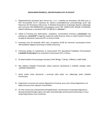 REGULAMIN PROMOCJI „200 RESTAURACJI KFC W POLSCE” 1. Organizatorem promocji jest Amrest Sp. z o.o. z siedzibą we Wrocławiu (50-365) przy ul. Plac Grunwaldzki 25-27, wpisanej do rejestru przedsiębiorców prowadzonego przez Sąd Rejonowy dla Wrocławia Fabrycznej, VI Wydział Gospodarczy Krajowego Rejestru Sądowego pod numerem KRS 0000025220, posiadającej numer NIP: 5260211104, REGON: 011565564, kapitał zakładowy w wysokości 649 750 000,00 zł („Amrest”). 2. Udział w Promocji jest dobrowolny i bezpłatny. Uczestnikami Promocji („Uczestnicy” lub pojedynczo „Uczestnik”) mogą być wyłącznie osoby fizyczne, które w czasie trwania Promocji przyjdą do dowolnej restauracji KFC na terenie Polski. 3. Promocja trwa 26 listopada 2015 roku, od godziny 10.00 do momentu wyczerpania limitu 200 kubełków objętych promocją w każdej restauracji. 4. Promocja polega na rozdawaniu w restauracjach KFC specjalnych Kubełków Promocyjnych („Kubełek Promocyjny”) we wszystkich restauracjach KFC w Polsce. 5. W skład Kubełka Promocyjnego wchodzą 3 Hot Wings, 1 Strips, 3 Bitesy i małe frytki. 6. Aby odebrać Kubełek Promocyjny należy poprosić sprzedawcę o kubełek, podając hasło „DOWÓD ŚWIEŻOŚCI”. 7. Jedna osoba może skorzystać z promocji tylko jeden raz, odbierając jeden Kubełek Promocyjny. 8. Organizator ma prawo do zmiany Regulaminu Promocji, przy czym zmiany Regulaminu nie będą naruszać praw nabytych Uczestników. 9. W razie zmiany lub unieważnienia któregokolwiek z postanowień niniejszego Regulaminu decyzją kompetentnego organu lub sądu, pozostałe jego postanowienia pozostają w mocy i wiążą Organizatora oraz Uczestnika.