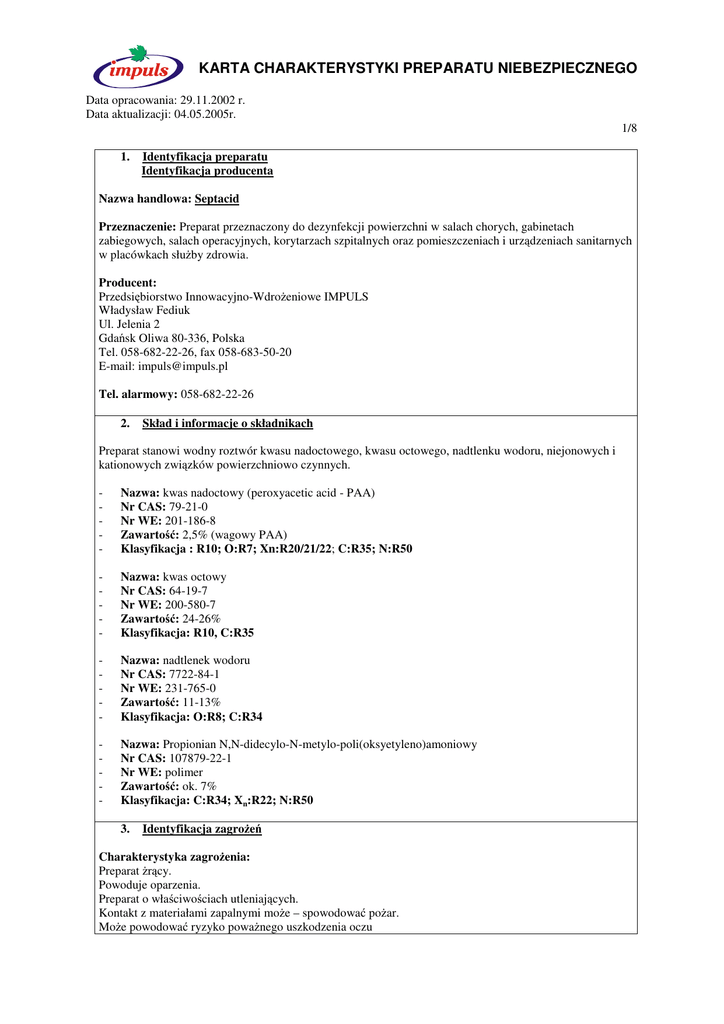KARTA CHARAKTERYSTYKI PREPARATU NIEBEZPIECZNEGO Data opracowania: 29.11.2002 r. Data aktualizacji: 04.05.2005r. 1/8 1. Identyfikacja preparatu Identyfikacja producenta Nazwa handlowa: Septacid Przeznaczenie: Preparat przeznaczony do dezynfekcji powierzchni w salach chorych, gabinetach zabiegowych, salach operacyjnych, korytarzach szpitalnych oraz pomieszczeniach i urządzeniach sanitarnych w placówkach służby zdrowia. Producent: Przedsiębiorstwo Innowacyjno-Wdrożeniowe IMPULS Władysław Fediuk Ul. Jelenia 2 Gdańsk Oliwa 80-336, Polska Tel. 058-682-22-26, fax 058-683-50-20 E-mail: [email protected] Tel. alarmowy: 058-682-22-26 2. Skład i informacje o składnikach Preparat stanowi wodny roztwór kwasu nadoctowego, kwasu octowego, nadtlenku wodoru, niejonowych i kationowych związków powierzchniowo czynnych. - Nazwa: kwas nadoctowy (peroxyacetic acid - PAA) Nr CAS: 79-21-0 Nr WE: 201-186-8 Zawartość: 2,5% (wagowy PAA) Klasyfikacja : R10; O:R7; Xn:R20/21/22; C:R35; N:R50 - Nazwa: kwas octowy Nr CAS: 64-19-7 Nr WE: 200-580-7 Zawartość: 24-26% Klasyfikacja: R10, C:R35 - Nazwa: nadtlenek wodoru Nr CAS: 7722-84-1 Nr WE: 231-765-0 Zawartość: 11-13% Klasyfikacja: O:R8; C:R34 - Nazwa: Propionian N,N-didecylo-N-metylo-poli(oksyetyleno)amoniowy Nr CAS: 107879-22-1 Nr WE: polimer Zawartość: ok. 7% Klasyfikacja: C:R34; Xn:R22; N:R50 3. Identyfikacja zagrożeń Charakterystyka zagrożenia: Preparat żrący. Powoduje oparzenia. Preparat o właściwościach utleniających. Kontakt z materiałami zapalnymi może – spowodować pożar. Może powodować ryzyko poważnego uszkodzenia oczu KARTA CHARAKTERYSTYKI PREPARATU NIEBEZPIECZNEGO Data opracowania: 29.11.2002 r. Data aktualizacji: 04.05.2005r. 2/8 Pary preparatu mogą drażnić układ oddechowy. Szczególne uwagi dotyczące niebezpieczeństwa dla ludzi i środowiska: Niebezpieczeństwo rozkładu pod wpływem działania ciepła. Niebezpieczeństwo rozkładu pod wpływem silnego podgrzania. Niebezpieczeństwo rozkładu podczas kontaktu z nieodpowiednimi materiałami, jak np.: niektóre metale (miedź i stal zwykła), jony metali wielowartościowych i ciężkich, alkalia, środki redukujące. 4. Pierwsza pomoc Uwagi ogólne Poszkodowanych usunąć poza teren zagrożony. Zadbać o ochronę osobistą (okulary i ubranie ochronne, zabezpieczenie dróg oddechowych). Usunąć z miejsca wypadku osoby nie powołane. Wdychanie Możliwe dolegliwości: podrażnienie śluzówek nosa, tchawicy, oczu. Wyprowadzić poszkodowanych na świeże powietrze, umieścić w pozycji półsiedzącej, przykryć kocem, nie dopuścić do utraty ciepła. Natychmiast wezwać lekarza. Kontakt ze skórą Natychmiast zdjąć zbrudzoną odzież. Skórę natychmiast spłukać dużą ilością wody. Odzież wypłukać w wodzie. Kontakt z oczami Otwarte oczy natychmiast płukać przez 15 min. pod bieżącą wodą. Skonsultować się z lekarzem okulistą. Połknięcie Natychmiast wezwać lekarza. Wypłukać jamę ustną wodą, a następnie podać wodę do picia w małych porcjach. Nie wywoływać wymiotów. 5. Postępowanie w przypadku pożaru Środki gaśnicze: Woda, piana Środki gaśnicze nieodpowiednie z punktu widzenia bezpieczeństwa: Proszki gaśnicze, dwutlenek węgla Niebezpieczeństwa, które stwarza sam produkt, powstające przy spalaniu produktu bądź grożące ze strony produktów spalania i powstających gazów: Sam produkt jest nie palny. Jako silny utleniacz może podtrzymywać ogień. Podczas pożaru w najbliższym otoczeniu może dojść do podniesienia temperatury, co może spowodować niebezpieczeństwo samorzutnego rozkładu z wydzieleniem gazowego tlenu. Tlen podtrzymuje ogień. Podczas rozkładu wzrasta niebezpieczeństwo podniesienia ciśnienia w zamkniętych przestrzeniach, może to doprowadzić do rozerwania pojemnika, zbiornika i rurociągu. W przypadku pożaru chłodzić wodą zbiornik i rurociągi. Specjalne środki ochrony W przypadku pożaru używać masek tlenowych oraz ubioru odpornego na działanie chemikaliów. 6. Postępowanie w przypadku niezamierzonego uwolnienia do środowiska KARTA CHARAKTERYSTYKI PREPARATU NIEBEZPIECZNEGO Data opracowania: 29.11.2002 r. Data aktualizacji: 04.05.2005r. 3/8 Ogólne środki bezpieczeństwa dotyczące ludzi: Stosować ubranie ochronne - patrz pkt. 8. Poszkodowanych usunąć poza teren zagrożony. Usunąć z miejsca wypadku osoby nie powołane. Uwagi ogólne Starać się w sposób bezpieczny uszczelnić miejsce wycieku. Uszkodzony pojemnik odizolować od innych i uszczelnić. Ochrona środowiska Zapobiec dalszemu rozpłynięciu się produktu, obsypać wał z piasku i ziemi. Nie wylewać do kanalizacji, wód gruntowych i gleby - patrz pkt. 13. Postępowanie przy czyszczeniu; usuwaniu resztek Rozlany produkt usunąć mechanicznie za pomocą odpowiedniego urządzenia i gromadzić w przeznaczonym do tego celu zbiorniku. Można też stosować uniwersalne, neutralne środki adsorpcyjne (wiążące ciecze). Nie używać materiałów palnych, trocin, szmat. Resztki spłukać gruntownie wodą. Nie dopuścić do kontaktu z nieodpowiednimi materiałami - patrz pkt. 10. Uwagi dodatkowe: Rozlanego produktu nigdy nie wolno zlewać z powrotem do oryginalnego pojemnika (niebezpieczeństwo samorzutnego rozkładu). 7. Postępowanie z preparatem i jego magazynowanie Ogólne zasady bezpiecznego obchodzenia się z produktem: Przestrzegać ogólnych przepisów dotyczących chemikaliów. Chronić przed zanieczyszczeniem i działaniem ciepła. Rozlanego produktu nigdy nie wolno zlewać z powrotem do oryginalnego pojemnika (niebezpieczeństwo samorzutnego rozkładu). Stosować ubranie ochronne - patrz pkt. 8. Unikać kontaktu z ze skórą, oczami i odzieżą. Nie wdychać oparów. Zadbać o dobrą wentylację pomieszczenia. Zabrudzoną oraz zużytą odzież roboczą wymienić. Zabrudzoną odzież natychmiast wypłukać w wodzie. Uwagi dotyczące chronienia produktu przed pożarem i eksplozją: Chronić przed działaniem promieni sł