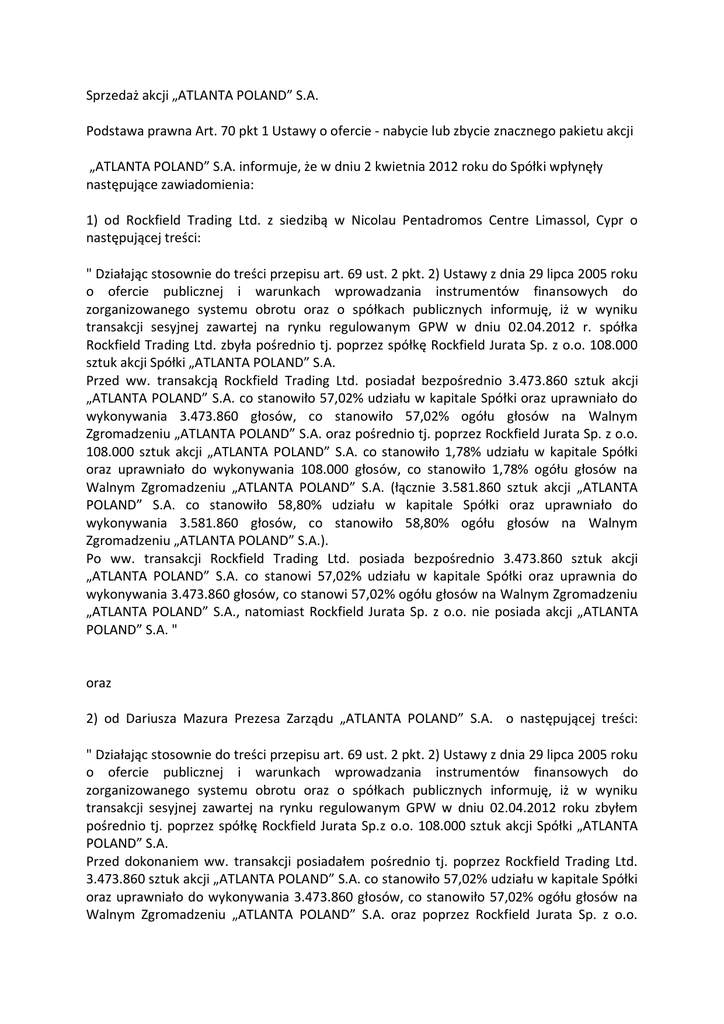 Sprzedaż akcji „ATLANTA POLAND” S.A. Podstawa prawna Art. 70 pkt 1 Ustawy o ofercie - nabycie lub zbycie znacznego pakietu akcji „ATLANTA POLAND” S.A. informuje, że w dniu 2 kwietnia 2012 roku do Spółki wpłynęły następujące zawiadomienia: 1) od Rockfield Trading Ltd. z siedzibą w Nicolau Pentadromos Centre Limassol, Cypr o następującej treści: " Działając stosownie do treści przepisu art. 69 ust. 2 pkt. 2) Ustawy z dnia 29 lipca 2005 roku o ofercie publicznej i warunkach wprowadzania instrumentów finansowych do zorganizowanego systemu obrotu oraz o spółkach publicznych informuję, iż w wyniku transakcji sesyjnej zawartej na rynku regulowanym GPW w dniu 02.04.2012 r. spółka Rockfield Trading Ltd. zbyła pośrednio tj. poprzez spółkę Rockfield Jurata Sp. z o.o. 108.000 sztuk akcji Spółki „ATLANTA POLAND” S.A. Przed ww. transakcją Rockfield Trading Ltd. posiadał bezpośrednio 3.473.860 sztuk akcji „ATLANTA POLAND” S.A. co stanowiło 57,02% udziału w kapitale Spółki oraz uprawniało do wykonywania 3.473.860 głosów, co stanowiło 57,02% ogółu głosów na Walnym Zgromadzeniu „ATLANTA POLAND” S.A. oraz pośrednio tj. poprzez Rockfield Jurata Sp. z o.o. 108.000 sztuk akcji „ATLANTA POLAND” S.A. co stanowiło 1,78% udziału w kapitale Spółki oraz uprawniało do wykonywania 108.000 głosów, co stanowiło 1,78% ogółu głosów na Walnym Zgromadzeniu „ATLANTA POLAND” S.A. (łącznie 3.581.860 sztuk akcji „ATLANTA POLAND” S.A. co stanowiło 58,80% udziału w kapitale Spółki oraz uprawniało do wykonywania 3.581.860 głosów, co stanowiło 58,80% ogółu głosów na Walnym Zgromadzeniu „ATLANTA POLAND” S.A.). Po ww. transakcji Rockfield Trading Ltd. posiada bezpośrednio 3.473.860 sztuk akcji „ATLANTA POLAND” S.A. co stanowi 57,02% udziału w kapitale Spółki oraz uprawnia do wykonywania 3.473.860 głosów, co stanowi 57,02% ogółu głosów na Walnym Zgromadzeniu „ATLANTA POLAND” S.A., natomiast Rockfield Jurata Sp. z o.o. nie posiada akcji „ATLANTA POLAND” S.A. " oraz 2) od Dariusza Mazura Prezesa Zarządu „ATLANTA POLAND” S.A. o następującej treści: " Działając stosownie do treści przepisu art. 69 ust. 2 pkt. 2) Ustawy z dnia 29 lipca 2005 roku o ofercie publicznej i warunkach wprowadzania instrumentów finansowych do zorganizowanego systemu obrotu oraz o spółkach publicznych informuję, iż w wyniku transakcji sesyjnej zawartej na rynku regulowanym GPW w dniu 02.04.2012 roku zbyłem pośrednio tj. poprzez spółkę Rockfield Jurata Sp.z o.o. 108.000 sztuk akcji Spółki „ATLANTA POLAND” S.A. Przed dokonaniem ww. transakcji posiadałem pośrednio tj. poprzez Rockfield Trading Ltd. 3.473.860 sztuk akcji „ATLANTA POLAND” S.A. co stanowiło 57,02% udziału w kapitale Spółki oraz uprawniało do wykonywania 3.473.860 głosów, co stanowiło 57,02% ogółu głosów na Walnym Zgromadzeniu „ATLANTA POLAND” S.A. oraz poprzez Rockfield Jurata Sp. z o.o. 108.000 sztuk akcji „ATLANTA POLAND” S.A. co stanowiło 1,78% udziału w kapitale Spółki oraz uprawniało do wykonywania 108.000 głosów, co stanowiło 1,78% ogółu głosów na Walnym Zgromadzeniu „ATLANTA POLAND” S.A. (łącznie 3.581.860 sztuk akcji „ATLANTA POLAND” S.A. co stanowiło 58,80% udziału w kapitale Spółki oraz uprawniało do wykonywania 3.581.860 głosów, co stanowiło 58,80% ogółu głosów na Walnym Zgromadzeniu „ATLANTA POLAND” S.A.). Po ww. transakcji posiadam pośrednio tj. poprzez Rockfield Trading Ltd. 3.473.860 sztuk akcji „ATLANTA POLAND” S.A. co stanowi 57,02% udziału w kapitale Spółki oraz uprawnia do wykonywania 3.473.860 głosów, co stanowi 57,02% ogółu głosów na Walnym Zgromadzeniu „ATLANTA POLAND” S.A. Ponadto informuję, że jestem udziałowcem Rockfield Trading Ltd. Sp. z o.o. i posiadam 100% udziałów tego podmiotu. Przed ww. transakcją Rockfield Trading Ltd. posiadał bezpośrednio 3.473.860 sztuk akcji „ATLANTA POLAND” S.A. co stanowiło 57,02% udziału w kapitale Spółki oraz uprawniało do wykonywania 3.473.860 głosów, co stanowiło 57,02% ogółu głosów na Walnym Zgromadzeniu „ATLANTA POLAND” S.A. oraz pośrednio tj. poprzez Rockfield Jurata Sp. z o.o. 108.000 sztuk akcji „ATLANTA POLAND” S.A. co stanowiło 1,78% udziału w kapitale Spółki oraz uprawniało do wykonywania 108.000 głosów, co stanowiło 1,78% ogółu głosów na Walnym Zgromadzeniu „ATLANTA POLAND” S.A. Po ww. transakcji Rockfield Trading Ltd. posiada bezpośrednio 3.473.860 sztuk akcji „ATLANTA POLAND” S.A. co stanowi 57,02% udziału w kapitale Spółki oraz uprawnia do wykonywania 3.473.860 głosów, co stanowi 57,02% ogółu głosów na Walnym Zgromadzeniu „ATLANTA POLAND” S.A. Ponadto informuję, że jestem udziałowcem Rockfield Jurata Sp. z o.o. i posiadam 10% udziałów tego podmiotu. Przed dokonaniem ww. transakcji Rockfield Jurata Sp. z o.o. posiadał 108.000 sztuk akcji „ATLANTA POLAND” S.A. co stanowiło 1,78% udziału w kapitale Spółki oraz uprawniało do wykonywania 108.000 głosów, co stanowiło 1,78% ogółu głosów na Walnym Zgromadzeniu „ATLANTA POLAND” S.A. Po ww. transakcji Rockfield Jurata Sp. z o.o. nie posiada akcji „ATLANTA POLAND” S.A."