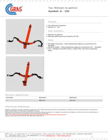 Typ: Wieszak na gaśnice Symbol: G - 155 Produkt Typ: Wieszak na gaśnice Symbol: G - 155 Opis produktu Wieszak na gaśnice Wieszak jednoramienny do gaśnicy Ø 150 Kolor RAL3000 (czerwony) - farba poliestrowa odporna na promienie UV. standard RAL9010 (biały) - farba poliestrowa odporna na promienie UV. - standard Inny - dostępne wszystkie kolory z palety RAL oraz kolory specjalne. opcja Wymiary gabarytowe Szerokość Wysokość Głębokość --- 360 mm 110 mm Informacje dodatkowe Zgodnie z wymogami rynkowymi i prawnymi, producent P.P.P.H. GRAS zastrzega sobie prawo do wprowadzania w dowolnej chwili zmian konstrukcyjnych w oferowanych szafach hydrantowych, nie zmieniając ich ogólnego characteru. Prezentowana w katalogu oferta nie stanowi oferty w rozumieniu Kodeksu Cywilnego. Ze w względu na ograniczenia wynikające z techniki druku, kolory reprodukowane w dokumencie mogą się różnić od rzeczywistych kolorów oferowanych produktów. Źródło: http://www.gras.pl/gpl/pl/Stojaki-wieszaki-zestawy-ppoz/Wieszaki-na-gasnice/Wieszak-na-gasnice-G-155 Sygnatura: GTS: 2017-03-03 11:46:39 | NID: 1600 | OID: 1260 | VID: 14 PPPH Gras ● ul. Sławieńska 12 ● 77-231 Korzybie ● Woj. pomorskie, Poland ● NIP: 8390201293 ● REGON: 005318706 Tel.: +48.598577303 ● Fax: +48.598586304 ● e-mail: [email protected] ● http://www.gras.pl GTS: 2017-03-03 11:46:39 | NID: 1600 | OID: 1260 | VID: 14 1/1
