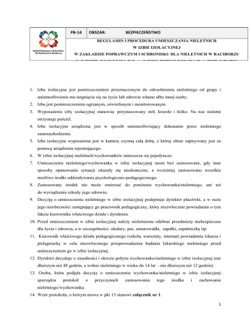 PB-14 OBSZAR: BEZPIECZEŃSTWO REGULAMIN I PROCEDURA UMIESZCZANIA NIELETNICH W IZBIE IZOLACYJNEJ W ZAKŁADZIE POPRAWCZYM I SCHRONISKU DLA NIELETNICH W RACIBORZU I SCHRONISKU DLA NIELETNICH W RACIBORZU 1. Izba izolacyjna jest pomieszczeniem przeznaczonym do odosobnienia nieletniego od grupy i uniemożliwienia mu targnięcia się na życie lub zdrowie własne albo innej osoby. 2. Izba jest pomieszczeniem ogrzanym, oświetlonym i monitorowanym. 3. Wyposażenie izby izolacyjnej stanowią: przymocowany stół, krzesło i łóżko. Na noc nieletni otrzymuje pościel. 4. Izba izolacyjna urządzona jest w sposób uniemożliwiający dokonanie przez nieletniego samouszkodzenia. 5. Izba izolacyjna wyposażona jest w kamerę czynną całą dobę, z której obraz zapisywany jest za pomocą urządzenia rejestrującego. 6. W izbie izolacyjnej nieletnich/wychowanków umieszcza się pojedynczo. 7. Umieszczenie nieletniego/wychowanka w izbie izolacyjnej może być zastosowane, gdy inne sposoby opanowania sytuacji okazały się nieskuteczne, a wcześniej zastosowano wszelkie możliwe środki oddziaływania psychologiczno-pedagogicznego. 8. Zastosowany środek nie może zmierzać do poniżenia wychowanka/nieletniego, ani też do wyrządzenia szkody jego zdrowiu. 9. Decyzję o umieszczeniu nieletniego w izbie izolacyjnej podejmuje dyrektor placówki, a w razie jego nieobecności zastępujący go pracownik pedagogiczny, który niezwłocznie powiadamia o tym fakcie kierownika właściwego działu i dyrektora. 10. Przed umieszczeniem w izbie izolacyjnej należy nieletniemu odebrać przedmioty niebezpieczne dla życia i zdrowia, a w szczególności: okulary, pas, sznurowadła, zapałki, zapalniczkę itp. 11. Kierownik właściwego działu pedagogicznego (szkoła, warsztaty, internat) powiadamia lekarza i pielęgniarkę w celu niezwłocznego przeprowadzenia badania lekarskiego nieletniego przed umieszczeniem go w izbie izolacyjnej. 12. Dyrektor decyduje o zasadności i okresie pobytu wychowanka/nieletniego w izbie izolacyjnej (nie dłuższym niż 48 godzin, a wobec nieletniego w wieku do 14 lat - nie dłuższym niż 12 godzin). 13. Osoba, która podjęła decyzję o umieszczeniu wychowanka/nieletniego w izbie izolacyjnej sporządza protokół o przyczynach zastosowania tego środka i zachowania nieletniego/wychowanka. 14. Wzór protokołu, o którym mowa w pkt 13 stanowi załącznik nr 1. 1 15. Osoba sporządzająca protokół odnotowuje w nim: a) przyczyny zastosowania odosobnienia, b) zachowanie się wychowanka/nieletniego w trakcie umieszczania w izolatce; c) dokładną godzinę zastosowania i środka oraz zakończenia jego stosowania, d) wyniki badania lekarskiego, e) imię, nazwisko oraz datę urodzenia nieletniego/wychowanka wobec którego zastosowano środek. 16. Umieszczenie nieletniego w izbie izolacyjnej należy bezzwłocznie odnotować w księdze ewidencyjnej nieletnich umieszczonych w izbie izolacyjnej. 17. Księgę prowadzi się wg wzoru stanowiącego załącznik nr 2. 18. Pracownicy służby zdrowia - lekarz ogólny, psychiatra lub pielęgniarka – odwiedzają izolowanego wychowanka/nieletniego podczas swojego dyżuru przynajmniej 2 razy dziennie, odnotowując ten fakt w księdze ewidencyjnej. 19. Stan fizyczny i zachowanie nieletniego w izbie izolacyjnej przez cały czas monitoruje strażnik pełniący służbę w dyżurce w budynku głównym, nie rzadziej niż co 15 minut, odnotowując to w karcie pobytu nieletniego/wychowanka w izbie izolacyjnej. 20. W razie wystąpienia zagrożenia dla zdrowia lub nietypowego zachowania się nieletniego, monitorujący pracownik niezwłocznie powiadamia o tym lekarza lub pielęgniarkę oraz dyrektora placówki. 21. Nieletniego, wobec którego zastosowano umieszczenie w izbie izolacyjnej, należy objąć wzmożonym oddziaływaniem zespołu diagnostyczno – korekcyjnego lub diagnostycznego. 22. Wszelkie kontakty pracowników z nieletnim umieszczonym w izbie izolacyjnej należy odnotować w księdze ewidencji nieletnich/wychowanków umieszczonych w izbie izolacyjnej, o której mowa w pkt 16. 23. Posiłki dostarczane są nieletniemu przez strażnika, z zachowaniem szczególnej ostrożności. 24. Nieletniemu umieszczonemu w izbie izolacyjnej przysługuje prawo do otrzymania przedmiotów osobistego użytku w ilości i na czas niezbędny do utrzymania higieny osobistej oraz spożycia posiłku. 25. Kierownik właściwego działu jest odpowiedzialny za przeprowadzenie postępowania wyjaśniającego i przedstawienie protokołu z postępowania dyrektorowi placówki. 26. Dyrektor powiadamia o umieszczeniu nieletniego w izbie izolacyjnej sędziego sądu rodzinnego sprawującego nadzór nad Zakładem, sąd rodzinny wykonujący środek (niezwłocznie, nie później niż w ciągu 24 godz. od momentu zastosowania środka izolacyjnego) 27. Nieletniemu przysługuje prawo złożenia skargi na umieszczenie w izbie izolacyjnej do dyrektora placówki. 28. Skargę wraz z protokołem zastosowania środka przymusu bezpośredniego dyrektor przedstawia niezwłocznie sędziemu sprawującemu nadzór nad zakładem/schroniskiem. 2 PROTOKÓŁ NR……….. Z ZASTOSOWANIA ŚRODKA W POSTACI UMIESZCZENIA NIELETNIEGO W IZBIE IZOLACYJNEJ 1. Data i godzina zastosowania środka: 2. Imię i nazwisko oraz stanowisko służbowe osoby występującej z wnioskiem: 3. Przyczyny zastosowania środka 4. Opis zachowywania się nieletniego podczas umieszczania w izbie izolacyjnej: 5. Imię, nazwisko oraz data urodzenia nieletniego wobec którego zastosowano środek: 3 6. Decyzja dyrektora zakładu i schroniska: Protokół sporządził: ……………………………………………… Na podstawie §4 ust. 2 oraz Regulaminu Zakładu Poprawczego i Schroniska dla Nieletnich w Raciborzu z dnia 30.08.2011 r. dokument został zatwierdzony do użytku na posiedzeniu Rady Zakładu Poprawczego i Schroniska dla Nieletnich w Raciborzu na posiedzeniu w dniu 24.02.2015 r. 4