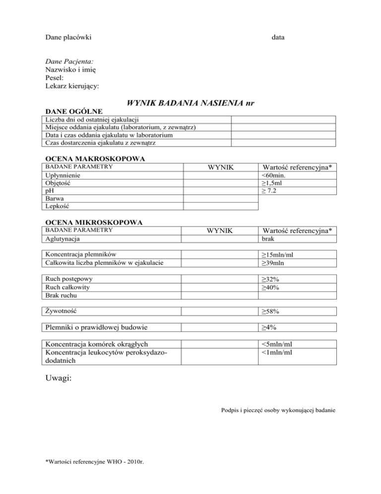 Dane placówki data Dane Pacjenta: Nazwisko i imię Pesel: Lekarz kierujący: WYNIK BADANIA NASIENIA nr DANE OGÓLNE Liczba dni od ostatniej ejakulacji Miejsce oddania ejakulatu (laboratorium, z zewnątrz) Data i czas oddania ejakulatu w laboratorium Czas dostarczenia ejakulatu z zewnątrz OCENA MAKROSKOPOWA BADANE PARAMETRY WYNIK Upłynnienie Objętość pH Barwa Lepkość Wartość referencyjna* <60min. ≥1,5ml ≥ 7.2 OCENA MIKROSKOPOWA BADANE PARAMETRY WYNIK Wartość referencyjna* Aglutynacja brak Koncentracja plemników Całkowita liczba plemników w ejakulacie ≥15mln/ml ≥39mln Ruch postępowy Ruch całkowity Brak ruchu ≥32% ≥40% Żywotność ≥58% Plemniki o prawidłowej budowie ≥4% Koncentracja komórek okrągłych Koncentracja leukocytów peroksydazododatnich <5mln/ml <1mln/ml Uwagi: Podpis i pieczęć osoby wykonującej badanie *Wartości referencyjne WHO - 2010r.