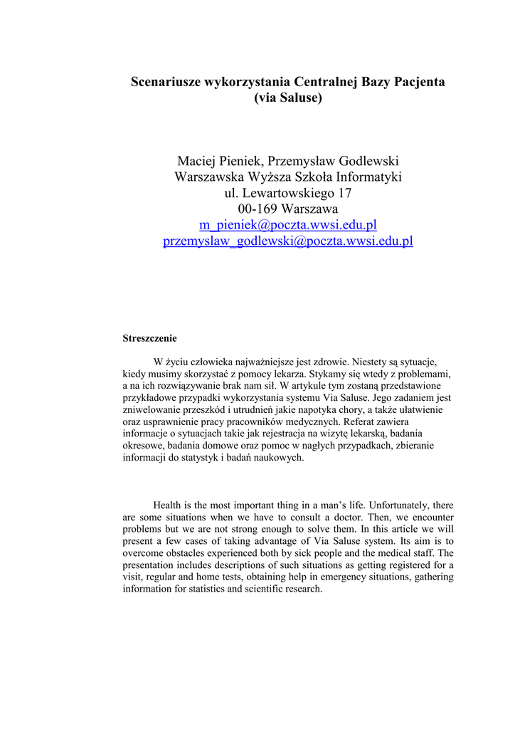 Scenariusze wykorzystania Centralnej Bazy Pacjenta (via Saluse) Maciej Pieniek, Przemysław Godlewski Warszawska WyŜsza Szkoła Informatyki ul. Lewartowskiego 17 00-169 Warszawa [email protected] [email protected] Streszczenie W Ŝyciu człowieka najwaŜniejsze jest zdrowie. Niestety są sytuacje, kiedy musimy skorzystać z pomocy lekarza. Stykamy się wtedy z problemami, a na ich rozwiązywanie brak nam sił. W artykule tym zostaną przedstawione przykładowe przypadki wykorzystania systemu Via Saluse. Jego zadaniem jest zniwelowanie przeszkód i utrudnień jakie napotyka chory, a takŜe ułatwienie oraz usprawnienie pracy pracowników medycznych. Referat zawiera informacje o sytuacjach takie jak rejestracja na wizytę lekarską, badania okresowe, badania domowe oraz pomoc w nagłych przypadkach, zbieranie informacji do statystyk i badań naukowych. Health is the most important thing in a man’s life. Unfortunately, there are some situations when we have to consult a doctor. Then, we encounter problems but we are not strong enough to solve them. In this article we will present a few cases of taking advantage of Via Saluse system. Its aim is to overcome obstacles experienced both by sick people and the medical staff. The presentation includes descriptions of such situations as getting registered for a visit, regular and home tests, obtaining help in emergency situations, gathering information for statistics and scientific research. Wstęp Via Saluse jest to projekt kółka programistycznego studentów Warszawskie WyŜszej Szkoły Informatyki. Podczas dodatkowych zajęć, na których poszerzane są wiadomości o nowych technologiach firmy Microsoft, powstał pomysł na zaprojektowanie systemu o zrewolucjonizowanym podejściu do pacjenta. Szybko został on podchwycony i w ciągu kilku miesięcy powstała aplikacja. Przystępny interfejs sprawi, Ŝe zarejestrowanie się do lekarza oraz przyszłe leczenie będzie bardziej komfortowe. TakŜe lekarze oraz pracownicy naukowi będą mieli moŜliwość czerpania wiedzy z bazy danych, jaką gromadzi system. Historia pacjenta zaczyna się juŜ od jego narodzin i trwa przez cały czas. Nawet po jego śmierci dane o przebytych chorobach, leczeniach są zachowywane między innymi dla ośrodków statystycznych i pracowników naukowych. Prezentowane niŜej sytuacje moŜna uŜyć dzięki systemowi. Narodziny pacjenta. W Ŝyciu kaŜdej matki nadchodzi taki dzień, w którym usłyszy pierwszy krzyk swojego maleństwa, dzień narodzin. W tym momencie zaczyna się droga Ŝycia młodego obywatela. Wraz z aktem urodzenia w systemie Via saluse zakładana jest [karta pacjenta]. Po wyborze przez szczęśliwych rodziców imienia dla dzidziusia w bazie danych zostaną wprowadzone pierwsze informacje - dane personalne oraz unikatowy numer identyfikacyjny. Na jego podstawie pacjent będzie rozpoznawany przez całe Ŝycie w systemie. Rejestracja. Dbając o zdrowie swojego dziecka, rodzice zabierają je na badania. Przed tym dokonują rejestracji poprzez stronę internetową, a jeśli nie mają takiej moŜliwości, to telefonicznie lub osobiście. Dziecko nie jest przypisane do konkretnej placówki zdrowia i ma moŜliwość wyboru dowolnej przychodni i dowolnego lekarza, który będzie miał wolny termin. Wszystkie dane dotyczące placówek medycznych oraz aktualne informacje o lekarzach i ich godzinach przyjęć są dostępne w jednym miejscu na stronie internetowej systemu. MoŜe się zdarzyć taka sytuacja, Ŝe z róŜnych przyczyn nie będzie moŜliwe dotarcie do lekarza. W takim wypadku moŜliwa jest rezygnacja z umówionego terminu i wybranie nowego. Zwolniony termin zostanie automatycznie udostępniony pozostałym pacjentom. Obraz1. Ekran rejestracji na wizytę do lekarza pierwszego kontaktu. Wizyta u lekarza – badanie kontrolne, szczepienia Po przyjściu na umówioną wizytę, rodzic podaje numer identyfikacyjny, za pomocą, którego lekarz otwiera kartę dziecka. Wyświetlane dane o historii wizyt zawierają informacje nie tylko z danej placówki, lecz ze wszystkich, w których dziecko otrzymywało pomoc lekarską. Lekarz na ich podstawie moŜe określić, czy rozwój dziecka przebiega prawidłowo oraz na co było ono do tej pory szczepione. Następnie wykonuje niezbędne badania oraz szczepi dziecko. Później uzupełnia kartę o dane dotyczące wyników badania oraz rodzaju wykonanych szczepień. Wpisywane informacje są od razu przesyłane do centralnej bazy. Badania szkolne W całym okresie dzieciństwa są prowadzone okresowe badania dziecka. Pielęgniarki w szkołach badają wzrost, wagę, ciśnienie młodych pacjentów. Prowadzone są równieŜ obowiązkowe szczepienia ochronne jak choćby te przeciwko tęŜcowi czy gruźlicy. Te informacje równieŜ na bieŜąco uzupełniane są w systemie. Rodzic informowany jest, Ŝe danego dnia odbędzie się badanie, a jeśli jest wymagane szczepienie to uŜywając podpisu elektronicznego wyraŜa na nie zgodę. Pierwsza choroba Dziecko rozwija się, dorasta i… okazuje się, Ŝe po przyjeździe z wakacji w Egipcie na skórze pojawiają się róŜnego koloru plamki. JuŜ jako dorosły obywatel udaje się na spotkanie z lekarzem. Po dokonaniu wstępnych badań, doktor przegląda historię leczenia chorego. Następnie ma moŜliwość pobrania informacji o nietypowych chorobach występujących w Egipcie i porównuje je z zaobserwowanymi objawami. Niestety wystawienie diagnozy wymaga przeprowadzenia dodatkowych badań i konsultacji ze specjalistami. W tym celu zostaje wystawione elektroniczne skierowanie na badanie krwi. Informacje o miejscach, w których moŜe ono zostać zrealizowane znajdują się w systemie. Udostępniają się one dla pacjenta w momencie wystawienia skierowania. Gdy wyniki badania krwi są dostępne, doktor dokonuje diagnozy. Następnie prosi chorego drogą e-mailową lub telefonicznie, by zjawił się u niego. Zaznajamia go jaki będzie obowiązywał sposób leczenia, w jak i w jakiej ilości