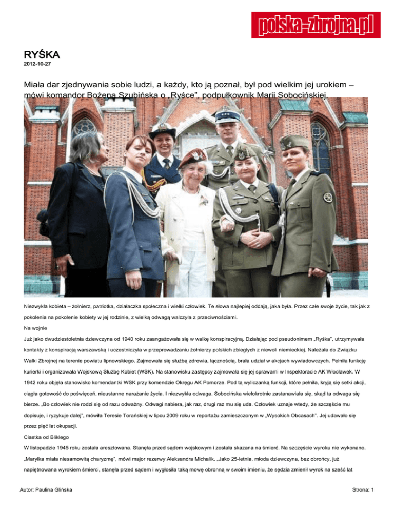 RYŚKA 2012-10-27 Miała dar zjednywania sobie ludzi, a każdy, kto ją poznał, był pod wielkim jej urokiem – mówi komandor Bożena Szubińska o „Ryśce”, podpułkownik Marii Sobocińskiej. Niezwykła kobieta – żołnierz, patriotka, działaczka społeczna i wielki człowiek. Te słowa najlepiej oddają, jaka była. Przez całe swoje życie, tak jak z pokolenia na pokolenie kobiety w jej rodzinie, z wielką odwagą walczyła z przeciwnościami. Na wojnie Już jako dwudziestoletnia dziewczyna od 1940 roku zaangażowała się w walkę konspiracyjną. Działając pod pseudonimem „Ryśka”, utrzymywała kontakty z konspiracją warszawską i uczestniczyła w przeprowadzaniu żołnierzy polskich zbiegłych z niewoli niemieckiej. Należała do Związku Walki Zbrojnej na terenie powiatu lipnowskiego. Zajmowała się służbą zdrowia, łącznością, brała udział w akcjach wywiadowczych. Pełniła funkcję kurierki i organizowała Wojskową Służbę Kobiet (WSK). Na stanowisku zastępcy zajmowała się jej sprawami w Inspektoracie AK Włocławek. W 1942 roku objęła stanowisko komendantki WSK przy komendzie Okręgu AK Pomorze. Pod tą wyliczanką funkcji, które pełniła, kryją się setki akcji, ciągła gotowość do poświęceń, nieustanne narażanie życia. I niezwykła odwaga. Sobocińska wielokrotnie zastanawiała się, skąd ta odwaga się bierze. „Bo człowiek nie rodzi się od razu odważny. Odwagi nabiera, jak raz, drugi raz mu się uda. Człowiek uznaje wtedy, że szczęście mu dopisuje, i ryzykuje dalej”, mówiła Teresie Torańskiej w lipcu 2009 roku w reportażu zamieszczonym w „Wysokich Obcasach”. Jej udawało się przez pięć lat okupacji. Ciastka od Bliklego W listopadzie 1945 roku została aresztowana. Stanęła przed sądem wojskowym i została skazana na śmierć. Na szczęście wyroku nie wykonano. „Marylka miała niesamowitą charyzmę”, mówi major rezerwy Aleksandra Michalik. „Jako 25-letnia, młoda dziewczyna, bez obrońcy, już napiętnowana wyrokiem śmierci, stanęła przed sądem i wygłosiła taką mowę obronną w swoim imieniu, że sędzia zmienił wyrok na sześć lat Autor: Paulina Glińska Strona: 1 pozbawienia wolności. Można powiedzieć, że wybroniła samą siebie”. Jednak dokument z wyrokiem z 13 lutego 1946 roku, który trzymała w swoim sztokholmskim mieszkaniu wśród licznych książek, nie pozwolił zapomnieć o tym, co przeżyła. Unieważniono wtedy jej stopnie wojskowe i odznaczenia, w tym srebrny Krzyż Walecznych z Mieczami i Krzyż Srebrny Orderu Virtuti Militari (wręczony dopiero w 2002 roku). Jej pięciu współtowarzyszy dostało kary poniżej pięciu lat, a trzech kolejnych młodych żołnierzy AK – karę śmierci. Razem ze swoimi współwięźniarkami dobrze słyszały huk wystrzałów, gdy wykonano egzekucję. „To ważne mieć przy sobie kogoś bliskiego w czasie koszmaru śledztwa. Jak łatwo się w takich warunkach zatracić, zaprzedać złu. Bo więzieniem rządzi zło i przemoc, ale jest też możliwość przyjrzenia się sobie i lepszego poznania samej siebie. I jakże inne z czasem obowiązują kryteria i jakie rodzą się zażyłości oraz solidarność”, mówiła „Ryśka” w wywiadzie udzielonym Krystynie Stochli w 2002 roku. Swoją karę odsiadywała w Toruniu, Fordonie w Bydgoszczy i najcięższym zakładzie karnym w Polsce dla kobiet w Inowrocławiu. Niemal w każdej sytuacji starała się dostrzegać coś dobrego, wywołującego uśmiech w ponurej powojennej rzeczywistości. Paradoksalnie, nawet w więzieniu ten uśmiech się pojawiał. „Zgodnie z regulaminem paczki mogły przychodzić tylko raz w miesiącu, dwa kilogramy na osobę, z określoną zawartością. Kiedyś dostałam taką paczkę od stryja, pieczołowicie, pięknie zapakowaną, Otwieram, a tu ciasteczka od Bliklego! A najbardziej oczekiwane były cebula, czosnek i tłuszcz”. Marylka na emigracji Na wolność wyszła po amnestii w grudniu 1948 roku. Z perspektywy czasu oceniała, jak trudny był to start w „normalność”. Wojna i okupacja zabrały jej młodość, a więzienie nadszarpnęło zdrowie. Problemy ze znalezieniem pracy, a nade wszystko swojego miejsca w życiu nie polepszały sytuacji. Pracy dla takich ludzi, z jej „życiorysem”, nie było. Zaczęła wątpić, traciła nadzieję na poukładanie własnego życia. Rano wychodziła z domu, brała drugie śniadanie i szła do Łazienek karmić łabędzie lub udawała się do kościoła przy placu Trzech Krzyży. W porę zdążyła się otrząsnąć. Kolejny raz znalazła w sobie dość siły, by na nowo zbudować swój świat. Za namową kuzyna zmieniła swój życiorys. Posługiwała się nim przez następnych kilkanaście lat. Zaczęła chodzić na kursy, pracowała w kilku miejscach, by w efekcie dostać pracę na Politechnice Warszawskiej. Tam pozostała już do emerytury, do 1980 roku, kiedy odeszła ze stanowiska kierownika działu w Instytucie Elektroniki. W 1983 roku zamieszkała w Sztokholmie. Aktywnie działała w organizacjach polonijnych, była członkiem Rady Naczelnej AK na Zachodzie z siedzibą w Londynie. Wśród Polonii cieszyła się wielkim autorytetem. O kraju jednak nie zapomniała. W październiku 1994 roku z kilkoma innymi więźniarkami odsłoniła tablicę na murze inowrocławskiego więzienia. Wielokrotnie zresztą odwiedzała to miasto. Zawsze wtedy ból wspomnień mieszał się z radością i wzruszeniem. Przy każdej okazji podkreślała, jak bardzo cieszy się, że zwycięsko wyszła z tego całego okrucieństwa. W wywiadzie udzielonym w 2002 roku mówiła: „To moje największe zwycięstwo: wyrzucić nienawiść, która potem mogłaby zatruć życie moje i bliskich. Po tym wszystkim nie szukałam moich oprawców, lecz wybawicieli, by im podziękować”. Często wspominała o najważniejszej z tych osób – doktorze Czesławie Zagórskim, więziennym lekarzu z Inowrocławia. „Aby nawiązać rozmowę, upozorował ba