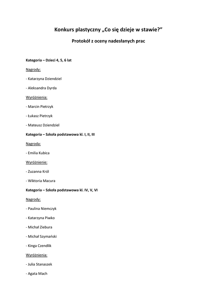Konkurs plastyczny „Co się dzieje w stawie?” Protokół z oceny nadesłanych prac Kategoria – Dzieci 4, 5, 6 lat Nagrody: - Katarzyna Dziendziel - Aleksandra Dyrda Wyróżnienia: - Marcin Pietrzyk - Łukasz Pietrzyk - Mateusz Dziendziel Kategoria – Szkoła podstawowa kl. I, II, III Nagroda: - Emilia Kubica Wyróżnienie: - Zuzanna Król - Wiktoria Macura Kategoria – Szkoła podstawowa kl. IV, V, VI Nagrody: - Paulina Niemczyk - Katarzyna Piwko - Michał Ziebura - Michał Szymaoski - Kinga Czendlik Wyróżnienia: - Julia Stanaszek - Agata Mach