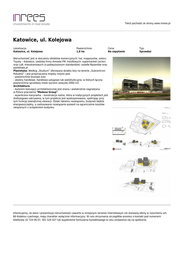 Tekst pochodzi ze strony www.inrees.pl Katowice, ul. Kolejowa Lokalizacja: Katowice, ul. Kolejowa Powierzchnia: 1,8 ha Cena: Na zapytanie Typ: Sprzedaż Nieruchomość jest w otoczeniu obiektów komercyjnych: hal, magazynów, salonu Toyoty – Katowice, siedziba firmy Armada FM; handlowych: supermarket Leclerc oraz Lidl; mieszkaniowych (o podwyższonym standardzie): osiedle Bażantów oraz pastelowe.pl Planistyka: Według „Studium” oferowana działka leży na terenie „Subcentrum Południe” i jest przeznaczona między innymi pod: - powierzchnie biurowe oraz - obiekty handlowe, handlowo-usługowe lub wielofunkcyjne, w których łączna powierzchnia sprzedaży może wynosić powyżej 2000 m2. Architektura - Autorem koncepcji architektonicznej jest znana i wielokrotnie nagradzana w Polsce pracownia "Medusa Group". - wywrócona marynarka – konstrukcja nośna, która w tradycyjnych projektach jest drobiazgowo zakrywana, w tym projekcie jest wyeksponowana, spełniając przy tym funkcję zewnętrznej elewacji. Dzięki takiemu rozwiązaniu, budynek będzie energooszczędny, a zastosowane rozwiązanie pozwoli na ograniczenie kosztów związanych z ociepleniem budynku. Informujemy, że dane i prezentacje nieruchomości zawarte w niniejszym serwisie internetowym nie stanowią oferty w rozumieniu art. 66 Kodeksu cywilnego, mają charakter wyłącznie informacyjny. W celu otrzymania szczegółów prosimy o kontakt pod numerami telefonów 32 724 06 07, 501 520 427 lub wypełnienie formularza kontaktowego w celu umówienia się na spotkanie.