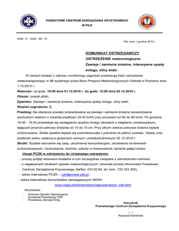 POWIATOWE CENTRUM ZARZĄDZANIA KRYZYSOWEGO W PILE WSK. VI – 5320 - 86 / 10 Piła, dnia 1 grudnia 2010 r. KOMUNIKAT OSTRZEGAWCZY OSTRZEŻENIE meteorologiczne Zawieje / zamiecie śnieżne, intensywne opady śniegu, silny wiatr W ramach działań z zakresu monitoringu zagrożeń przekazuję treść ostrzeżenia meteorologicznego nr 88 wydanego przez Biuro Prognoz Meteorologicznych Oddział w Poznaniu dnia 1.12.2010 r.: Ważność: od godz. 18:00 dnia 01.12.2010 r. do godz. 12:00 dnia 02.12.2010 r. Obszar: powiat pilski, Zjawisko: Zawieje / zamiecie śnieżne, Intensywne opady śniegu, silny wiatr, Stopień zagrożenia: 2, Przebieg: Na obszarze powiatu przewidywane są zawieje i zamiecie śnieżne spowodowane wschodnim wiatrem o średniej prędkości 35-45 km/h oraz porywami od 60 do 80 km/h. Po godzinie 18.00 - 19.00 przewiduje się wystąpienie opadów śniegu okresami o natężeniu umiarkowanym, dających przyrost pokrywy śnieżnej od 10 do 15 cm. Przy silnym wietrze pokrywa śnieżna będzie zróżnicowana. Strefa opadów będzie się przemieszczała z południa na północ powiatu. Opady oraz prędkość wiatru osłabną w godzinach rannych i przedpołudniowych 02.12.2010 r. Skutki: Szybkie tworzenie się zasp, utrudnienia komunikacyjne, utrudnienia na terenach zurbanizowanych. Uszkodzenia, dachów, szkody w drzewostanie, łamanie gałęzi drzew. Uwagi PCZK w odniesieniu do niniejszego ostrzeżenia: - proszę podjąć stosowne działania w tym szczególnie związane z ostrzeżeniem ludności, - o negatywnych skutkach zjawisk meteorologicznych i anomalii proszę informować Powiatowe Centrum Zarządzania Kryzysowego (tel/fax. 210 93 84, tel. kom. 722 323 353), - adres internetowy PCZK – [email protected] , - adres internetowy komunikatów ostrzegawczych IMGW: www.imgw.pl/wl/internet/zz/zagrozenia/ost_met.html Rozdzielnik: - Gminne Ośrodki Alarmowania Komenda Powiatowa PSP Powiatowy Zarząd Dróg Kierownik Powiatowego Centrum Zarządzania Kryzysowego /-/ Ryszard Karwiński