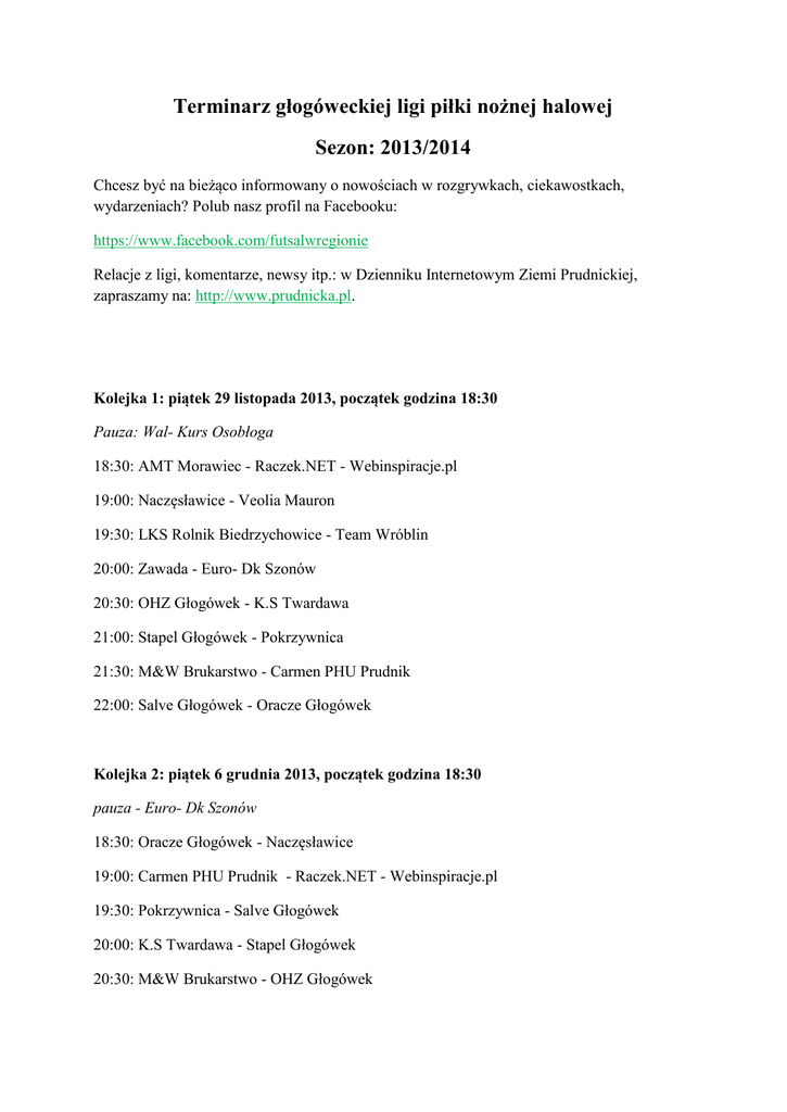 Terminarz głogóweckiej ligi piłki nożnej halowej Sezon: 2013/2014 Chcesz być na bieżąco informowany o nowościach w rozgrywkach, ciekawostkach, wydarzeniach? Polub nasz profil na Facebooku: https://www.facebook.com/futsalwregionie Relacje z ligi, komentarze, newsy itp.: w Dzienniku Internetowym Ziemi Prudnickiej, zapraszamy na: http://www.prudnicka.pl. Kolejka 1: piątek 29 listopada 2013, początek godzina 18:30 Pauza: Wal- Kurs Osobłoga 18:30: AMT Morawiec - Raczek.NET - Webinspiracje.pl 19:00: Naczęsławice - Veolia Mauron 19:30: LKS Rolnik Biedrzychowice - Team Wróblin 20:00: Zawada - Euro- Dk Szonów 20:30: OHZ Głogówek - K.S Twardawa 21:00: Stapel Głogówek - Pokrzywnica 21:30: M&W Brukarstwo - Carmen PHU Prudnik 22:00: Salve Głogówek - Oracze Głogówek Kolejka 2: piątek 6 grudnia 2013, początek godzina 18:30 pauza - Euro- Dk Szonów 18:30: Oracze Głogówek - Naczęsławice 19:00: Carmen PHU Prudnik - Raczek.NET - Webinspiracje.pl 19:30: Pokrzywnica - Salve Głogówek 20:00: K.S Twardawa - Stapel Głogówek 20:30: M&W Brukarstwo - OHZ Głogówek 21:00: Team Wróblin - Zawada 21:30: Veolia Mauron - LKS Rolnik Biedrzychowice 22:00: Wal- Kurs Osobłoga - AMT Morawiec Kolejka 3: niedziela 8 grudnia 2013, Pauza - Zawada 16:00: Naczęsławice - Team Wróblin 16:30: Salve Głogówek - Veolia Mauron 17:00: Oracze Głogówek - Stapel Głogówek 17:30: Raczek.NET - Webinspiracje.pl - Wal- Kurs Osobłoga 18:00: AMT Morawiec - M&W Brukarstwo 18:30: Carmen PHU Prudnik - K.S Twardawa 19:00: Euro- Dk Szonów - LKS Rolnik Biedrzychowice 19:30: OHZ Głogówek - Pokrzywnica Kolejka 4: piątek 13 grudnia 2013 pauza - Stapel Głogówek 18:30 Carmen PHU Prudnik - Naczęsławice 19:00 OHZ Głogówek - Salve Głogówek 19:30 Raczek.NET - Webinspiracje.pl - Euro- Dk Szonów 20:00 Team Wróblin - M&W Brukarstwo 20:30 Wal- Kurs Osobłoga - Zawada 21:00 Veolia Mauron - K.S Twardawa 21:30 AMT Morawiec - LKS Rolnik Biedrzychowice 22:00 Pokrzywnica - Oracze Głogówek Kolejka 5: niedziela 15 grudnia 2013 Pauza Pokrzywnica 15:00 Euro- Dk Szonów - Wal- Kurs Osobłoga 15:30 Team Wróblin - Raczek.NET - Webinspiracje.pl 16:00 M&W Brukarstwo - Veolia Mauron 16:30 Salve Głogówek - Stapel Głogówek 17:00 Naczęsławice - OHZ Głogówek 17:30 LKS Rolnik Biedrzychowice - Carmen PHU Prudnik 18:00 K.S Twardawa - Oracze Głogówek 18:30 Zawada - AMT Morawiec Kolejka 6, piątek 20 grudnia 2013 Pauza: Raczek.NET - Webinspiracje.pl 18:30 Euro- Dk Szonów - Naczęsławice 19:00 Team Wróblin - Salve Głogówek 19:30 Veolia Mauron - Stapel Głogówek 20:00 Oracze Głogówek - OHZ Głogówek 20:30 Wal- Kurs Osobłoga - M&W Brukarstwo 21:00 LKS Rolnik Biedrzychowice - Zawada 21:30 Pokrzywnica - Carmen PHU Prudnik 22:00 K.S Twardawa - AMT Morawiec Kolejka 7: niedziela 22 grudnia 2013 Pauza: AMT Morawiec 15:00 Carmen PHU Prudnik - Wal- Kurs Osobłoga 15:30 OHZ Głogówek - Raczek.NET - Webinspiracje.pl 16:00 Zawada - Veolia Mauron 16:30 Euro- Dk Szonów - Team Wróblin 17:00 Stapel Głogówek - M&W Brukarstwo 17:30 Salve Głogówek - K.S Twardawa 18:00 Naczęsławice - Pokrzywnica 18:30 LKS Rolnik Biedrzychowice - Oracze Głogówek Kolejka 8: niedziela 29 grudnia 2013 Pauza: LKS Rolnik Biedrzychowice 15:00 Zawada - Naczęsławice 15:30 Euro- Dk Szonów - Salve Głogówek 16:00 Stapel Głogówek - Team Wróblin 16:30 Veolia Mauron - OHZ Głogówek 17:00 Raczek.NET - Webinspiracje.pl - M&W Brukarstwo 17:30 Wal- Kurs Osobłoga - K.S Twardawa 18:00 AMT Morawiec - Pokrzywnica 18:30 Oracze Głogówek - Carmen PHU Prudnik Kolejka 9: piątek 3 stycznia 2014 Pauza: Naczęsławice 18:30 Oracze Głogówek - Wal- Kurs Osobłoga 19:00 Pokrzywnica - Raczek.NET - Webinspiracje.pl 19:30 AMT Morawiec - Veolia Mauron 20:00 Zawada - Stapel Głogówek 20:30 OHZ Głogówek - Euro- Dk Szonów 21:00 K.S Twardawa - M&W Brukarstwo 21:30 Salve Głogówek - LKS Rolnik Biedrzychowice 22:00 Team Wróblin - Carmen PHU Prudnik Kolejka 10: niedziela 5 stycznia 2013 Pauza: Oracze Głogówek 15:00 AMT Morawiec - Naczęsławice 15:30 Carmen PHU Prudnik - Salve Głogówek 16:00 Stapel Głogówek - OHZ Głogówek 16:30 M&W Brukarstwo - Euro- Dk Szonów 17:00 Raczek.NET - Webinspiracje.pl - Zawada 17:30 Team Wróblin - K.S Twardawa 18:00 Wal- Kurs Osobłoga - LKS Rolnik Biedrzychowice 18:30 Veolia Mauron - Pokrzywnica Kolejka 11: piątek 1 stycznia 2013 Pauza: M&W Brukarstwo 18:30 Pokrzywnica - Wal- Kurs Osobłoga 19:00 K.S Twardawa - Raczek.NET - Webinspiracje.pl 19:30 Zawada - Salve Głogówek 20:00 Euro- Dk Szonów - Stapel Głogówek 20:30 Team Wróblin - OHZ Głogówek 21:00 Naczęsławice - LKS Rolnik Biedrzychowice 21:30 Veolia Mauron - Carmen PHU Prudnik 22:00 Oracze Głogówek - AMT Morawiec Kolejka 12: piątek 17 stycznia 2014 Pauza: KS Twardawa 18:30 Salve Głogówek - Naczęsławice 19:00 Wal- Kurs Osobłoga - Veolia Mauron 19:30 LKS Rolnik Biedrzychowice - Stapel Głogówek 20:00 AMT Morawiec - Team Wróblin 20:30 Carmen PHU Prudnik - Euro- Dk Szonów 21:00 OHZ Głogówek - Zawada 21:30 M&W Brukarstwo - Pokrzywnica 22:00 Raczek.NET - Webinspiracje.pl - Oracze Głogówek Kolejka 13: piątek 31 stycznia 2014 Pauza: TEAM Wróblin 18:30 OHZ Głogówek - Wal- Kurs Osobłoga 19:00 Stapel Głogówek - Raczek.NET - Webinspiracje.pl 19:30 Veolia Mauron - Euro- Dk Szonów 20:00 Salve Głogówek - M&W Brukarstwo 20:30 Naczęsławice - K.S Twardawa 21:00 Pokrzywnica - LKS Rolnik Biedrzychowice 21:30 AMT Morawiec - Carmen PHU Prudnik 22:00 Zawada - Oracze Głogówek Kolejka 14: piątek 7 luty 2014 Pauza: Veolia Mauron 18:30 Raczek.NET - Webinspiracje.pl - Naczęsławice 19:00 Wal- Kurs Osobłoga - Salve Głogówek 19:30 Oracze Głogówek - Team Wróblin 20:00 Carmen PHU Prudnik - OHZ Głogówek 21:30 K.S Twardawa - Zawada 22:00 M&W Brukarstwo - LKS Rolnik Biedrzychowice 22:30 Euro- Dk Szonów - Pokrzywnica Stapel Głogówek - AMT Morawiec Kolejka 15: niedziela 9 luty 2014 Pauza: Carmen PHU Prudnik 15:00 Stapel Głogówek - Wal- Kurs Osobłoga 15: