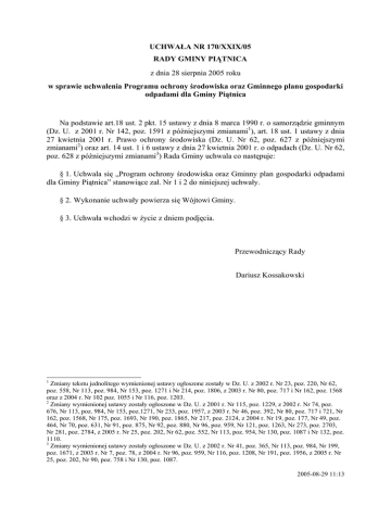 UCHWAŁA NR 170/XXIX/05 RADY GMINY PIĄTNICA z dnia 28 sierpnia 2005 roku w sprawie uchwalenia Programu ochrony środowiska oraz Gminnego planu gospodarki odpadami dla Gminy Piątnica Na podstawie art.18 ust. 2 pkt. 15 ustawy z dnia 8 marca 1990 r. o samorządzie gminnym (Dz. U. z 2001 r. Nr 142, poz. 1591 z późniejszymi zmianami1), art. 18 ust. 1 ustawy z dnia 27 kwietnia 2001 r. Prawo ochrony środowiska (Dz. U. Nr 62, poz. 627 z późniejszymi zmianami2) oraz art. 14 ust. 1 i 6 ustawy z dnia 27 kwietnia 2001 r. o odpadach (Dz. U. Nr 62, poz. 628 z późniejszymi zmianami3) Rada Gminy uchwala co następuje: § 1. Uchwala się „Program ochrony środowiska oraz Gminny plan gospodarki odpadami dla Gminy Piątnica” stanowiące zał. Nr 1 i 2 do niniejszej uchwały. § 2. Wykonanie uchwały powierza się Wójtowi Gminy. § 3. Uchwała wchodzi w życie z dniem podjęcia. Przewodniczący Rady Dariusz Kossakowski 1 Zmiany tekstu jednolitego wymienionej ustawy ogłoszone zostały w Dz. U. z 2002 r. Nr 23, poz. 220, Nr 62, poz. 558, Nr 113, poz. 984, Nr 153, poz. 1271 i Nr 214, poz. 1806, z 2003 r. Nr 80, poz. 717 i Nr 162, poz. 1568 oraz z 2004 r. Nr 102 poz. 1055 i Nr 116, poz. 1203. 2 Zmiany wymienionej ustawy zostały ogłoszone w Dz. U. z 2001 r. Nr 115, poz. 1229, z 2002 r. Nr 74, poz. 676, Nr 113, poz. 984, Nr 153, poz.1271, Nr 233, poz. 1957, z 2003 r. Nr 46, poz. 392, Nr 80, poz. 717 i 721, Nr 162, poz. 1568, Nr 175, poz. 1693, Nr 190, poz. 1865, Nr 217, poz. 2124, z 2004 r. Nr 19, poz. 177, Nr 49, poz. 464, Nr 70, poz. 631, Nr 91, poz. 875, Nr 92, poz. 880, Nr 96, poz. 959, Nr 121, poz. 1263, Nr 273, poz. 2703, Nr 281, poz. 2784, z 2005 r. Nr 25, poz. 202, Nr 62, poz. 552, Nr 113, poz. 954, Nr 130, poz. 1087 i Nr 132, poz. 1110. 3 Zmiany wymienionej ustawy zostały ogłoszone w Dz. U. z 2002 r. Nr 41, poz. 365, Nr 113, poz. 984, Nr 199, poz. 1671, z 2003 r. Nr 7, poz. 78, z 2004 r. Nr 96, poz. 959, Nr 116, poz. 1208, Nr 191, poz. 1956, z 2005 r. Nr 25, poz. 202, Nr 90, poz. 758 i Nr 130, poz. 1087. 2005-08-29 11:13 ZałącznikNr 1 do UCHWAŁY NR 170/XXIX/05 RADY GMINY PIĄTNICA z dnia 28 sierpnia 2005 roku PROGRAM OCHRONY ŚRODOWISKA DLA GMINY PIĄTNICA 2 SPIS TREŚCI WSTĘP ............................................................................................................................................. 3 ROZDZIAŁ I OGÓLNA CHARAKTERYSTYKA GMINY ....................................................................... 5 1.1. KLIMAT GMINY ........................................................................................................................ 5 1.2. BUDOWA GEOLOGICZNA .......................................................................................................... 6 1.3. WARUNKI GLEBOWE ................................................................................................................ 7 1.4. WODY PODZIEMNE ................................................................................................................. 10 1.5. WODY POWIERZCHNIOWE ...................................................................................................... 18 1.6. SIEĆ WODOCIĄGOWO – KANALIZACYJNA .............................................................................. 22 1.6.1. Sieć wodociągowa........................................................................................................... 22 1.6.2. Sieć kanalizacyjna........................................................................................................... 26 1.7. POWIETRZE ATMOSFERYCZNE ............................................................................................... 27 1.8. ŚRODOWISKO AKUSTYCZNE .................................................................................................. 33 1.9. LASY ...................................................................................................................................... 36 1.10. ROZWÓJ TURYSTYKI I ROLNICTWA EKOLOGICZNEGO JAKO STRATEGICZNE KIERUNKI ROZWOJU WOJEWÓDZTWA PODLASKIEGO .......................................................... 37 1.11. EDUKACJA EKOLOGICZNA ................................................................................................... 44 1.12. ZAGROŻENIA POWAŻNYMI AWARIAMI ................................................................................ 45 ROZDZIAŁ II ANALIZA SWOT ..................................................................................................................... 48 ROZDZIAŁ III CELE I PRIORYTETY WYNIKAJĄCE Z ZEWNĘTRZNYCH UWARUNKOWAŃ .... 50 3.1. PROGRAM OCHRONY WÓD PODZIEMNYCH I POWIERZCHNIOWYCH ...................................... 50 3.2. PROGRAM OCHRONY POWIETRZA .......................................................................................... 54 3.3. PROGRAM OCHRONY PRZED HAŁASEM .................................................................................. 59 3.4. OCHRONA POWIERZCHNI ZIEMI ............................................................................................. 60 3.5. OCHRONA ŚRODOWISKA PRZYRODNICZEGO.......................................................................... 62 3.6. PROGRAM ROZWOJU I REKREACJI ZGODNIE Z II POLITYKĄ EKOLOGICZNĄ PAŃSTWA ......... 65 3.7. EDUKACJA EKOLOGICZNA ..................................................................................................... 67 ROZDZIAŁ IV INSTRUMENTY REALIZACJI PROGRAMU .................................................................... 78 4.1. PRAWNE INSTRUMENTY REALIZACJI PROGRAMU .................................................................. 78 4.2. INSTRUMENTY ODDZIAŁYWANIA SPOŁECZNEGO................................................................... 78 4.3. INSTRUMENTY EKONOMICZNE ............................................................................................... 80 4.4. INSTRUMENTY FINANSOWE .......................................................................