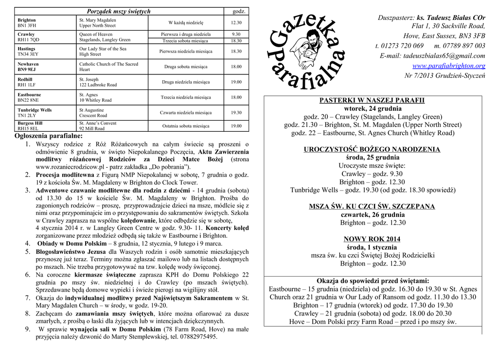 Porządek mszy świętych godz. nc Brighton BN1 3FH St. Mary Magdalen Upper North Street Crawley RH11 7QD Queen of Heaven Stagelands, Langley Green Hastings TN34 3EY Our Lady Star of the Sea High Street Newhaven BN9 9EJ Catholic Church of The Sacred Heart Redhill RH1 1LF W każdą niedzielę 12.30 Pierwsza i druga niedziela Trzecia sobota miesiąca 9.30 18.30 Pierwsza niedziela miesiąca 18.30 Druga sobota miesiąca 18.00 St. Joseph 122 Ladbroke Road Druga niedziela miesiąca 19.00 Eastbourne BN22 8NE St. Agnes 10 Whitley Road Trzecia niedziela miesiąca 18.00 Tunbridge Wells TN1 2LY St Augustine Crescent Road Czwarta niedziela miesiąca 19.30 Burgess Hill RH15 8EL St. Anne’s Convent 92 Mill Road Ostatnia sobota miesiąca 19.00 Ogłoszenia parafialne: 1. Wszyscy rodzice z Róż Różańcowych na całym świecie są proszeni o odmówienie 8 grudnia, w święto Niepokalanego Poczęcia, Aktu Zawierzenia modlitwy różańcowej Rodziców za Dzieci Matce Bożej (strona www.rozaniecrodzicow.pl - patrz zakładka „Do pobrania”). 2. Procesja modlitewna z Figurą NMP Niepokalanej w sobotę, 7 grudnia o godz. 19 z kościoła Św. M. Magdaleny w Brighton do Clock Tower. 3. Adwentowe czuwanie modlitewne dla rodzin z dziećmi - 14 grudnia (sobota) od 13.30 do 15 w kościele Św. M. Magdaleny w Brighton. Prośba do zagonionych rodziców – proszę, przyprowadzajcie dzieci na msze, módlcie się z nimi oraz przypominajcie im o przystępowaniu do sakramentów świętych. Szkoła w Crawley zaprasza na wspólne kolędowanie, które odbędzie się w sobotę, 4 stycznia 2014 r. w Langley Green Centre w godz. 9.30- 11. Koncerty kolęd zorganizowane przez młodzież odbędą się także w Eastbourne i Brighton. 4. Obiady w Domu Polskim – 8 grudnia, 12 stycznia, 9 lutego i 9 marca. Wartości doczesne i wieczne 5. Błogosławieństwo Jezusa dla Waszych rodzin i osób samotnie mieszkających „Troszczcie się nie omożna ten pokarm, ginie” 27). dostępnych przynoszę już teraz. Terminy zgłaszaćktóry mailowo lub(Jna6,listach Pan po Jezus dowartościował doczesność, równocześnie otwierając nam oczy mszach. Nie trzeba przygotowywać na tzw. kolędę wody święconej. na 6. wartości wieczne.kiermasze świąteczne zaprasza KPH do Domu Polskiego 22 Na coroczne Dokonał cudu aby dowartościować doczesność. grudnia porozmnożenia mszy św. chleba, niedzielnej i do Crawley (po mszach świętych). Podzielił również ryby. to cud wyjątkowo oczywisty, z pięciu Sprzedawane będą Był domowe wypieki i świeże pierogi na ponieważ wigilijny stół. bochenków chlebamodlitwy Apostołowie dwanaście koszów 7. Okazjapodzielonego do indywidualnej przedzebrali Najświętszym Sakramentem w St. ułomków. Mary Magdalen Church – w środy, w godz. 19-20. 8. to Zachęcam do zamawiania mszychleb, świętych, które można ofiarować za dusze Był błogosławiony chleb, święty przekazany ludziom jako pokarm z prośbą o łaski dla żyjących lubbędą w intencjach dziękczynnych. dla ichzmarłych, ciała w trosce o to, aby nie ustali, gdy wracać do domu. Tego 9. głodni W sprawie wynajęcia sali wtakże Domu (78 Farm Road, Hove) na małe chleba szukali u Chrystusa na Polskim drugi dzień. przyjęcia należy dzwonić do Marty Stemplewskiej, tel. 07882975495. Duszpasterz: ks. Tadeusz Białas COr Flat 1, 30 Sackville Road, Hove, East Sussex, BN3 3FB t. 01273 720 069 m. 07789 897 003 E-mail: [email protected] www.parafiabrighton.org Nr 7/2013 Grudzień-Styczeń PASTERKI W NASZEJ PARAFII wtorek, 24 grudnia godz. 20 – Crawley (Stagelands, Langley Green) godz. 21.30 – Brighton, St. M. Magdalen (Upper North Street) godz. 22 – Eastbourne, St. Agnes Church (Whitley Road) UROCZYSTOŚĆ BOŻEGO NARODZENIA środa, 25 grudnia Uroczyste msze święte: Crawley – godz. 9.30 Brighton – godz. 12.30 Tunbridge Wells – godz. 19.30 (od godz. 18.30 spowiedź) MSZA ŚW. KU CZCI ŚW. SZCZEPANA czwartek, 26 grudnia Brighton – godz. 12.30 NOWY ROK 2014 środa, 1 stycznia msza św. ku czci Świętej Bożej Rodzicielki Brighton – godz. 12.30 Okazja do spowiedzi przed świętami: Eastbourne – 15 grudnia (niedziela) od godz. 16.30 do 19.30 w St. Agnes Church oraz 21 grudnia w Our Lady of Ransom od godz. 11.30 do 13.30 Brighton – 17 grudnia (wtorek) od godz. 17.30 do 19.30 Crawley – 21 grudnia (sobota) od godz. 18.00 do 20.30 Hove – Dom Polski przy Farm Road – przed i po mszy św. Matka Jezusa Syn Boży, stając się człowiekiem, nie został stworzony przez Ojca tak, jak pierwszy człowiek. Wszedł w ludzką rodzinę przez Matkę. Łono Maryi z Nazaretu było Bożym warsztatem, w którym On ubrał ludzkie ciało. Nic więc dziwnego, że Syn Boga chciał mieć ten Boży warsztat, jakim jest ciało kobiety, idealnie czysty i święty. Dlatego postarał się o to, by Maryja była ziemią świętą, nietkniętą przez żaden grzech. Została więc poczęta w łonie Anny, swej matki, jako wolna od grzechu pierworodnego. Dlatego Maryja z Nazaretu wyróżnia się spośród wszystkich dzieci Adama i Ewy tym, że została poczęta jako wypełniona łaską. Ani przez sekundę nie była wyjęta spod prawa łaski. Słowo kalać znaczy brudzić, skalany znaczy pobrudzony. Nieskalany to idealnie czysty. To słowo zostało wykorzystane dla oddania wielkiego przywileju za zarazem bogactwa, jakim dysponuje od chwili poczęcia Matka Jezusa. Ona – Nieskalana – jest Niepokalanie Poczęta. O tym przymiocie Maryi Pismo Święte nie mówi bezpośrednio, chociaż w pewnej mierze można dostrzec tę Jej wyjątkową świętość w słowach archanioła Gabriela, który w czasie zwiastowania nazywa Ją pełną łaski. Tajemnicę Niepokalanego Poczęcia Matki Bożej Kościół przypomina w roku liturgicznym 8 grudnia. Drugim przymiotem Matki Jezusa jest jej Dziewictwo. Tradycja od samego początku, chcąc podkreślić, że w tworzeniu ciała Jezusa Chrystusa nie miał udziału mężczyzna, uznaje, że Maryja nigdy z żadnym mężczyz