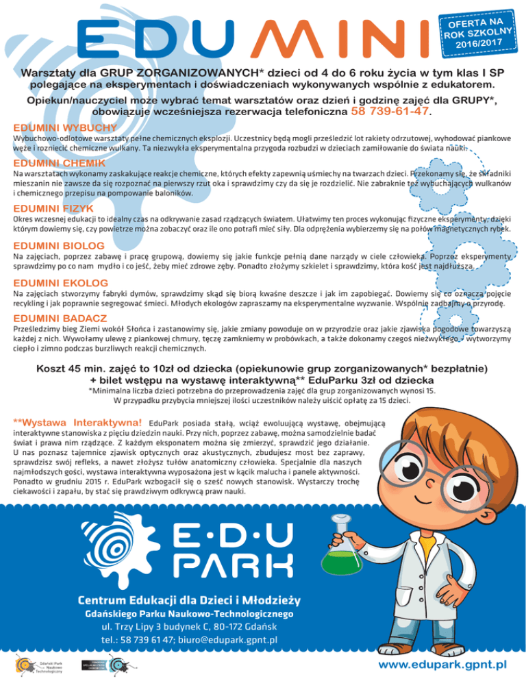 EduMINI OFERTA NA NY ROK SZKOL 7 2016/201 Warsztaty dla GRUP ZORGANIZOWANYCH* dzieci od 4 do 6 roku życia w tym klas I SP polegające na eksperymentach i doświadczeniach wykonywanych wspólnie z edukatorem. Opiekun/nauczyciel może wybrać temat warsztatów oraz dzień i godzinę zajęć dla GRUPY*, obowiązuje wcześniejsza rezerwacja telefoniczna 58 739-61-47. EDUMINI WYBUCHY Wybuchowo-odlotowe warsztaty pełne chemicznych eksplozji. Uczestnicy będą mogli prześledzić lot rakiety odrzutowej, wyhodować piankowe węże i rozniecić chemiczne wulkany. Ta niezwykła eksperymentalna przygoda rozbudzi w dzieciach zamiłowanie do świata nauki. EDUMINI CHEMIK Na warsztatach wykonamy zaskakujące reakcje chemiczne, których efekty zapewnią uśmiechy na twarzach dzieci. Przekonamy się, że składniki mieszanin nie zawsze da się rozpoznać na pierwszy rzut oka i sprawdzimy czy da się je rozdzielić. Nie zabraknie też wybuchających wulkanów i chemicznego przepisu na pompowanie baloników. EDUMINI FIZYK Okres wczesnej edukacji to idealny czas na odkrywanie zasad rządzących światem. Ułatwimy ten proces wykonując fizyczne eksperymenty, dzięki którym dowiemy się, czy powietrze można zobaczyć oraz ile ono potrafi mieć siły. Dla odprężenia wybierzemy się na połów magnetycznych rybek. EDUMINI BIOLOG Na zajęciach, poprzez zabawę i pracę grupową, dowiemy się jakie funkcje pełnią dane narządy w ciele człowieka. Poprzez eksperymenty sprawdzimy po co nam mydło i co jeść, żeby mieć zdrowe zęby. Ponadto złożymy szkielet i sprawdzimy, która kość jest najdłuższa. EDUMINI EKOLOG Na zajęciach stworzymy fabryki dymów, sprawdzimy skąd się biorą kwaśne deszcze i jak im zapobiegać. Dowiemy się co oznacza pojęcie recykling i jak poprawnie segregować śmieci. Młodych ekologów zapraszamy na eksperymentalne wyzwanie. Wspólnie zadbajmy o przyrodę. EDUMINI BADACZ Prześledzimy bieg Ziemi wokół Słońca i zastanowimy się, jakie zmiany powoduje on w przyrodzie oraz jakie zjawiska pogodowe towarzyszą każdej z nich. Wywołamy ulewę z piankowej chmury, tęczę zamkniemy w probówkach, a także dokonamy czegoś niezwykłego – wytworzymy ciepło i zimno podczas burzliwych reakcji chemicznych. Koszt 45 min. zajęć to 10zł od dziecka (opiekunowie grup zorganizowanych* bezpłatnie) + bilet wstępu na wystawę interaktywną** EduParku 3zł od dziecka *Minimalna liczba dzieci potrzebna do przeprowadzenia zajęć dla grup zorganizowanych wynosi 15. W przypadku przybycia mniejszej ilości uczestników należy uiścić opłatę za 15 dzieci. **Wystawa Interaktywna! EduPark posiada stałą, wciąż ewoluującą wystawę, obejmującą interaktywne stanowiska z pięciu dziedzin nauki. Przy nich, poprzez zabawę, można samodzielnie badać świat i prawa nim rządzące. Z każdym eksponatem można się zmierzyć, sprawdzić jego działanie. U nas poznasz tajemnice zjawisk optycznych oraz akustycznych, zbudujesz most bez zaprawy, sprawdzisz swój refleks, a nawet złożysz tułów anatomiczny człowieka. Specjalnie dla naszych najmłodszych gości, wystawa interaktywna wyposażona jest w kącik malucha i panele aktywności. Ponadto w grudniu 2015 r. EduPark wzbogacił się o sześć nowych stanowisk. Wystarczy trochę ciekawości i zapału, by stać się prawdziwym odkrywcą praw nauki. Centrum Edukacji dla Dzieci i Młodzieży Gdańskiego Parku Naukowo-Technologicznego ul. Trzy Lipy 3 budynek C, 80-172 Gdańsk tel.: 58 739 61 47; [email protected] www.edupark.gpnt.pl