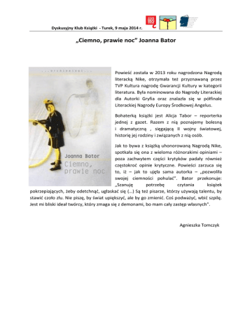 Dyskusyjny Klub Książki - Turek, 9 maja 2014 r. „Ciemno, prawie noc” Joanna Bator Powieść została w 2013 roku nagrodzona Nagrodą literacką Nike, otrzymała też przyznawaną przez TVP Kultura nagrodę Gwarancji Kultury w kategorii literatura. Była nominowana do Nagrody Literackiej dla Autorki Gryfia oraz znalazła się w półfinale Literackiej Nagrody Europy Środkowej Angelus. Bohaterką książki jest Alicja Tabor – reporterka jednej z gazet. Razem z nią poznajemy bolesną i dramatyczną , sięgającą II wojny światowej, historię jej rodziny i związanych z nią osób. Jak to bywa z książką uhonorowaną Nagrodą Nike, spotkała się ona z wieloma różnorakimi opiniami – poza zachwytem części krytyków padały również częstokroć opinie krytyczne. Powieści zarzuca się to, iż – jak to ujęła sama autorka – „pozwoliła swojej ciemności pohulać”. Bator przekonuje: „Szanuję potrzebę czytania książek pokrzepiających, żeby odetchnąć, ugłaskać się (…) Są też pisarze, którzy używają talentu, by stawić czoło złu. Nie piszę, by świat upiększyć, ale by go zmienić. Coś podważyć, wbić szpilę. Jest mi bliski ideał twórcy, który zmaga się z demonami, bo mam cały zastęp własnych”. Agnieszka Tomczyk