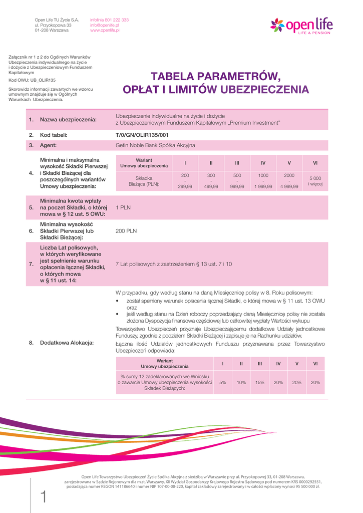 Open Life TU Życie S.A. ul. Przyokopowa 33 01-208 Warszawa infolinia 801 222 333 [email protected] www.openlife.pl Załącznik nr 1 z 2 do Ogólnych Warunków Ubezpieczenia indywidualnego na życie i dożycie z Ubezpieczeniowym Funduszem Kapitałowym TABELA PARAMETRÓW, OPŁAT I LIMITÓW UBEZPIECZENIA Kod OWU: UB_OLIR135 Skorowidz informacji zawartych we wzorcu umownym znajduje się w Ogólnych Warunkach Ubezpieczenia. 1. Nazwa ubezpieczenia: Ubezpieczenie indywidualne na życie i dożycie z Ubezpieczeniowym Funduszem Kapitałowym „Premium Investment” 2. Kod tabeli: T/0/GN/OLIR135/001 3. Agent: Getin Noble Bank Spółka Akcyjna 4. Minimalna i maksymalna wysokość Składki Pierwszej i Składki Bieżącej dla poszczególnych wariantów Umowy ubezpieczenia: 5. Minimalna kwota wpłaty na poczet Składki, o której mowa w § 12 ust. 5 OWU: 1 PLN 6. Minimalna wysokość Składki Pierwszej lub Składki Bieżącej: 200 PLN 7. Liczba Lat polisowych, w których weryfikowane jest spełnienie warunku opłacenia łącznej Składki, o których mowa w § 11 ust. 14: 7 Lat polisowych z zastrzeżeniem § 13 ust. 7 i 10 Wariant Umowy ubezpieczenia I II III IV V VI Składka Bieżąca (PLN): 200 299,99 300 499,99 500 999,99 1000 1 999,99 2000 4 999,99 5 000 i więcej W przypadku, gdy według stanu na daną Miesięcznicę polisy w 8. Roku polisowym: • • został spełniony warunek opłacenia łącznej Składki, o której mowa w § 11 ust. 13 OWU oraz jeśli według stanu na Dzień roboczy poprzedzający daną Miesięcznicę polisy nie została złożona Dyspozycja finansowa częściowej lub całkowitej wypłaty Wartości wykupu Towarzystwo Ubezpieczeń przyznaje Ubezpieczającemu dodatkowe Udziały jednostkowe Funduszy, zgodnie z podziałem Składki Bieżącej i zapisuje je na Rachunku udziałów. 8. Dodatkowa Alokacja: 1 Łączna ilość Udziałów jednostkowych Funduszu przyznawana przez Towarzystwo Ubezpieczeń odpowiada: Wariant Umowy ubezpieczenia I II III IV V VI % sumy 12 zadeklarowanych we Wniosku o zawarcie Umowy ubezpieczenia wysokości Składek Bieżących: 5% 10% 15% 20% 20% 20% Open Life Towarzystwo Ubezpieczeń Życie Spółka Akcyjna z siedzibą w Warszawie przy ul. Przyokopowej 33, 01-208 Warszawa, zarejestrowana w Sądzie Rejonowym dla m.st. Warszawy, XII Wydział Gospodarczy Krajowego Rejestru Sądowego pod numerem KRS 0000292551, posiadająca numer REGON 141186640 i numer NIP 107-00-08-220, kapitał zakładowy zarejestrowany i w całości wpłacony wynosi 95 500 000 zł. Open Life TU Życie S.A. ul. Przyokopowa 33 01-208 Warszawa infolinia 801 222 333 [email protected] www.openlife.pl Towarzystwo Ubezpieczeń przyznaje dodatkowe Udziały jednostkowe Funduszy miesięcznie w ilości odpowiadającej 1/12 równowartości łącznej Dodatkowej Alokacji przyznanej w skali Roku polisowego. Nabycie dodatkowych Udziałów jednostkowych Funduszy dokonywane jest według Wartości udziału jednostkowego Funduszu na 3. Dnia wyceny następującego po Miesięcznicy polisy, według której Towarzystwo Ubezpieczeń przyznało dodatkowe Udziały jednostkowe Funduszu i zgodnie z podziałem Składki Bieżącej obowiązującym w dniu następującym po danej Miesięcznicy polisy. 8. Dodatkowa Alokacja cd.: 9. Wiek Ubezpieczającego, o którym mowa w § 4 ust. 3 OWU: W przypadku, gdy według stanu na daną Miesięcznicę polisy nie został spełniony warunek opłacenia łącznej Składki, o której mowa w § 11 ust. 13 OWU nabycie dodatkowych Udziałów jednostkowych Funduszy w tym miesiącu nie następuje, z zachowaniem prawa do ich otrzymania w późniejszym czasie trwania ochrony ubezpieczeniowej i po spełnieniu warunku opłacenia Składki. W takim przypadku za datę przyznania dodatkowych Udziałów jednostkowych Funduszu przyjmuje się datę kolejnej Miesięcznicy polisy, w której został spełniony warunek opłacenia łącznej Składki, a kwota przeznaczona do zaalokowania w Fundusze tytułem Dodatkowej alokacji, przyznana w dacie danej Miesięcznicy polisy odpowiada wielokrotności miesięcznej wartości Dodatkowej alokacji wynikającej z liczby Miesięcy polisowych, za które został spełniony warunek opłacania łącznej Składki zgodnie z § 11 ust. 13 OWU, a która to nie została jeszcze zrealizowana przez Towarzystwo Ubezpieczeń. Ukończony 18. rok życia i nieprzekroczony 63. rok życia Wiek Ubezpieczonego, 10. o którym mowa w § 4 ust. 4 OWU: Ukończony 13. rok życia i nieprzekroczony 63. rok życia Minimalna Wartość rachunku udziałów, po częściowej wypłacie Wartości wykupu, o której mowa 11. w § 18 ust. 6 OWU, z zastrzeżeniem możliwości zmiany w przypadku, o którym mowa w § 14 ust. 5 OWU: 500 PLN Stawka procentowa Wartości rachunku 12. udziałów, o której mowa w § 18 ust. 8 OWU: 100% Wartości rachunku udziałów Open Life Towarzystwo Ubezpieczeń Życie Spółka Akcyjna z siedzibą w Warszawie przy ul. Przyokopowej 33, 01-208 Warszawa, zarejestrowana w Sądzie Rejonowym dla m.st. Warszawy, XII Wydział Gospodarczy Krajowego Rejestru Sądowego pod numerem KRS 0000292551, posiadająca numer REGON 141186640 i numer NIP 107-00-08-220, kapitał zakładowy zarejestrowany i w całości wpłacony wynosi 95 500 000 zł. 2 Open Life TU Życie S.A. ul. Przyokopowa 33 01-208 Warszawa infolinia 801 222 333 [email protected] www.openlife.pl Opłaty/Koszty/Składka za ryzyko: sposób i termin ich pobierania Opłata/Składka za ryzyko Wysokość, sposób i termin pobierania Wyrażona procentowo. Naliczana od wartości wpłaty tytułem Składki Pierwszej oraz wpłat tytułem Składki Bieżącej, zgodnie z postanowieniami § 11 ust. 16 - 18 OWU. Naliczana i pobierana przed Alokacją. 13. Opłata alokacyjna: 4% Opłata alokacyjna nie podlega zwrotowi, z wyjątkiem odstąpienia Ubezpieczającego od Umowy ubezpieczenia, o którym mowa w § 6 ust. 1 pkt 1 OWU. Wyrażona procentowo w skali miesiąca dla poszczególnych wariantów Umowy ubezpieczenia. Pobierana miesięcznie. Opłata nal
