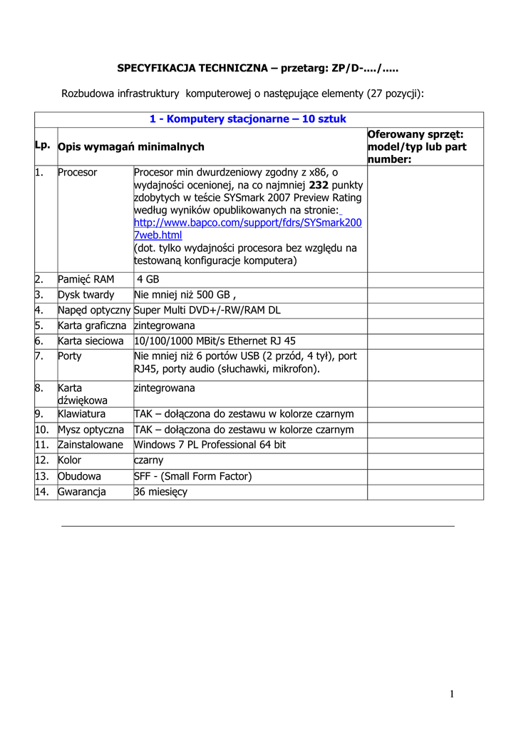 SPECYFIKACJA TECHNICZNA – przetarg: ZP/D-..../..... Rozbudowa infrastruktury komputerowej o następujące elementy (27 pozycji): 1 - Komputery stacjonarne – 10 sztuk Lp. Opis wymagań minimalnych 1. Procesor 2. 3. 4. 5. 6. 7. Pamięć RAM 4 GB Dysk twardy Nie mniej niż 500 GB , Napęd optyczny Super Multi DVD+/-RW/RAM DL Karta graficzna zintegrowana Karta sieciowa 10/100/1000 MBit/s Ethernet RJ 45 (zintegrowana), Porty Nie mniej niż 6 portów USB (2 przód, 4 tył), port RJ45, porty audio (słuchawki, mikrofon). 8. Oferowany sprzęt: model/typ lub part number: Procesor min dwurdzeniowy zgodny z x86, o wydajności ocenionej, na co najmniej 232 punkty zdobytych w teście SYSmark 2007 Preview Rating według wyników opublikowanych na stronie: http://www.bapco.com/support/fdrs/SYSmark200 7web.html (dot. tylko wydajności procesora bez względu na testowaną konfiguracje komputera) Karta dźwiękowa 9. Klawiatura 10. Mysz optyczna 11. Zainstalowane 12. Kolor zintegrowana 13. Obudowa 14. Gwarancja SFF - (Small Form Factor) 36 miesięcy TAK – dołączona do zestawu w kolorze czarnym TAK – dołączona do zestawu w kolorze czarnym Windows 7 PL Professional 64 bit czarny 1 2 – PAMIĘĆ RAM – 10 sztuk Lp. Opis wymagań minimalnych 1. 2. RAM DDR PC3200 - 1GB RAM DDR2 PC5300 - 2 GB Oferowany sprzęt: model/typ lub part number: 5 szt. (kompatybilne z Lenovo A55) 5 szt. (kompatybilne z Lenovo A57) 3 – Kable monitorowe D-SUB – 5 sztuk Lp. Opis wymagań minimalnych 1. 2. 3. Zakończenia Długość Informacje dodatkowe Oferowany sprzęt: model/typ lub part number: D-Sub męski - D-Sub męski 3m Dodatkowe filtry ferrytowe, dodatkowe ekranowanie kabla. 4 – Listwy zasilające – 20 sztuk Lp. Opis wymagań minimalnych 1. listwy zasilające Oferowany sprzęt: model/typ lub part number: 5 gniazd; dł. przewodu 5m 5 – Mysz optyczna– 15 sztuk Lp. Opis wymagań minimalnych 1. Typ myszy 2. Komunikacja z przewodowa komputerem 3. 4. 5. 6. Interfejs Rozdzielczość Dł. przewodu Liczba przycisków USB 800 dpi >=1,5m 2 szt 7. Liczba rolek 1 8. Kolor czarny Oferowany sprzęt: model/typ lub part number: optyczna 2 6 – Tester okablowania – 1 sztuka Oferowany sprzęt: model/typ lub part number: Lp. Opis wymagań minimalnych 1. Opis: przeznaczony dla kabli UTP i FTP - koncentrycznych, dwu, trzy lub cztero parowych skrętek oraz wszystkich standardów UTP identyfikuje: zwarcie, nieciągłość, pary odwrócone, pary skrzyżowane oraz pary rozdzielone wraz z miejscem uszkodzenia mierzy długość kabla oraz tworzy mapę połączeń współpracuje z identyfikatorami, wspomagającymi przyporządkowanie gniazdka w ścianie do gniazda w patchpanelu: na wyświetlaczu pojawia sie numer identyfikatora podłączonego z drugiej strony. zabezpieczenie na wyjściu chroni przez uszkodzeniem na skutek pojawienia się napięcia wywołanego sygnałem połączenia telefonicznego lub zwarciem przewodów wybór testu jednym przyciskiem złaczą RJ-45 i BNC długi czas pracy na jednej baterii - ok. 60 godzin wskaźnik stanu baterii 7 – Klawiatura– 10 sztuk Lp. Opis wymagań minimalnych 1. 2. 3. 4. 5. 6. Układ Klawiszy Komunikacja z komputerem Interfejs Klawiatura numeryczna Zasięg Kolor Oferowany sprzęt: model/typ lub part number: QWERTY przewodowa USB tak >=1,5m czarny 3 8 – patchcord – 70 sztuk Lp. Opis wymagań minimalnych 1. 2. 3. 4. Patchcord Patchcord Patchcord Patchcord – – – – kat. kat. kat. kat. 6 6 6 6 dł dł dł dł 1m 2m 3m 5m – kolor zielony 30 szt. – kolor żółty 20 szt. – kolor czarny 10 szt. – kolor niebieski 10 szt. 9 – Dysk Twardy– 3 sztuki Lp. Opis wymagań minimalnych 1 2 3 4 5 Interfejs Pojemność Prędkość obrotowa Pamięć cache Inne Oferowany sprzęt: model/typ lub part number: Oferowany sprzęt: model/typ lub part number: SATA III Min 500 GB 7200 RPM Min 16MB NCQ 10 – Półka do szafy Rack 19” – 1 sztuka Lp. Opis wymagań minimalnych 1. 2. 3. Typ Rozmiar Udźwig Oferowany sprzęt: model/typ lub part number: RACK szer. 800 x gł. 1000 mm 50kg 11 – Zestaw śrub montażowych do szafy Rack 19” – 100 sztuk Oferowany sprzęt: Lp. Opis wymagań minimalnych model/typ lub part number: 1. Typ RACK Mount M6 2. Opis dodatkowy Koszyk żółty ocynkowany, wpinanie koszyków bez użycia narzędzi 12 – Kabel USB – 15 sztuk Lp. Opis wymagań minimalnych 1. 2. 3. Typ USB Długość Oferowany sprzęt: model/typ lub part number: drukarkowy 2.0 >=1,8m 4 13 – kabel USB przedłużacz – 10 sztuk Oferowany sprzęt: model/typ lub part number: Lp. Opis wymagań minimalnych 1. 2. 3. 4. Zakończenia Standard Ekranowanie Długość A męski - A żeński USB 2.0 podwójne 3m 14 – dysk twardy SSD – 3 sztuk Oferowany sprzęt: model/typ lub part number: Lp. Opis wymagań minimalnych Opis kod producenta: SSDSC2CW180A310 Zapis 520MB/s Odczyt 550MB/s; Odczyt/zapis: 50000/60000 IOPS Gwarancja: 36 m-cy 15 – karty sieciowe – 6 sztuk Oferowany sprzęt: model/typ lub part number: Lp. Opis wymagań minimalnych 1 karta sieciowa 1GB low profile pci 3 szt. 2 karta sieciowa 1GB low profile pci-express 3 szt. 16 – urządzenie montażowe – 1 sztuka Lp. Opis wymagań minimalnych 1 Opis Oferowany sprzęt: model/typ lub part number: Narzędzie uderzeniowe złącza RJ-45 typ: Molex 5 17 – wtyk RJ-45 – 200 sztuk Oferowany sprzęt: model/typ lub part number: Lp. Opis wymagań minimalnych 1 Opis Wtyk RJ-45 kat. 6 ekranowane – 200 szt. 18 –zasilacz ATX – 3 sztuki Oferowany sprzęt: model/typ lub part number: Lp. Opis wymagań minimalnych 1 wentylator: 120 mm 2 głośność: <= 24 dB 3 4 aktywny PFC TAK Zabezpieczenia UVP - zabezpieczenie podnapięciowe (Undervoltage protection) OVP - zabezpieczenie przed przepięciem (Overvoltage protection) SCP - zabezpieczenie przeciwzwarciowe (Short-circuit protection) OPP - zabezpieczenie przed przeciążeniem (Overload protection) OCP - zabezpieczenie nadprądowe (Overcurrent protection) OTP - zabezpieczenie przed przegrzaniem (Ove