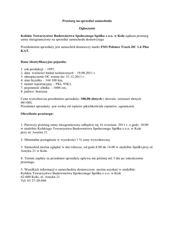 Przetarg na sprzedaż samochodu Ogłoszenie Kolskie Towarzystwo Budownictwa Społecznego Spółka z o.o. w Kole ogłasza przetarg ustny nieograniczony na sprzedaż samochodu dostawczego Przedmiotem sprzedaży jest samochód dostawczy marki FSO Polonez Truck DC 1.6 Plus KAT. Dane identyfikacyjne pojazdu: 1. rok produkcji - 1997, 2. data ważności badań technicznych – 19.08.2011 r. 3. ubezpieczenie OC ważne do: 31.12.2011 r. 4. stan licznika – 144 100 km, 5. numer rejestracyjny – PKL 95K3, 7. pojemność silnika - 1600 cm, 8. paliwo: benzyna Cena wywoławcza przedmiotu sprzedaży: 800,00 złotych ( słownie: osiemset złotych 00/100). Przedmiot sprzedaży jest wolny od wpisów jakichkolwiek ciężarów, ograniczeń. Określenie przetargu: 1. Pierwszy przetarg ustny nieograniczony odbędzie się 16 września 2011 r. o godz. 10:00 w siedzibie Kolskiego Towarzystwa Budownictwa Społecznego Spółka z o.o. w Kole przy ul. Asnyka 21. 2. Minimalne postąpienie w wysokości 1 % ceny wywoławczej. 3. Samochód można oglądać w dni robocze, od godz.8.00 do 14.00 w siedzibie Spółki przy ul. Asnyka 21 w Kole. 4. Termin zapłaty za przedmiot sprzedaży upływa nie później niż 3 dni po zakończeniu przetargu. 5. Wszelkich informacji o samochodzie dostawczym można uzyskać w siedzibie: Kolskie Towarzystwo Budownictwa Społecznego Spółka z o.o. w Kole 62-600 Koło, ul. Asnyka 21 Tel: 63 27-20-846
