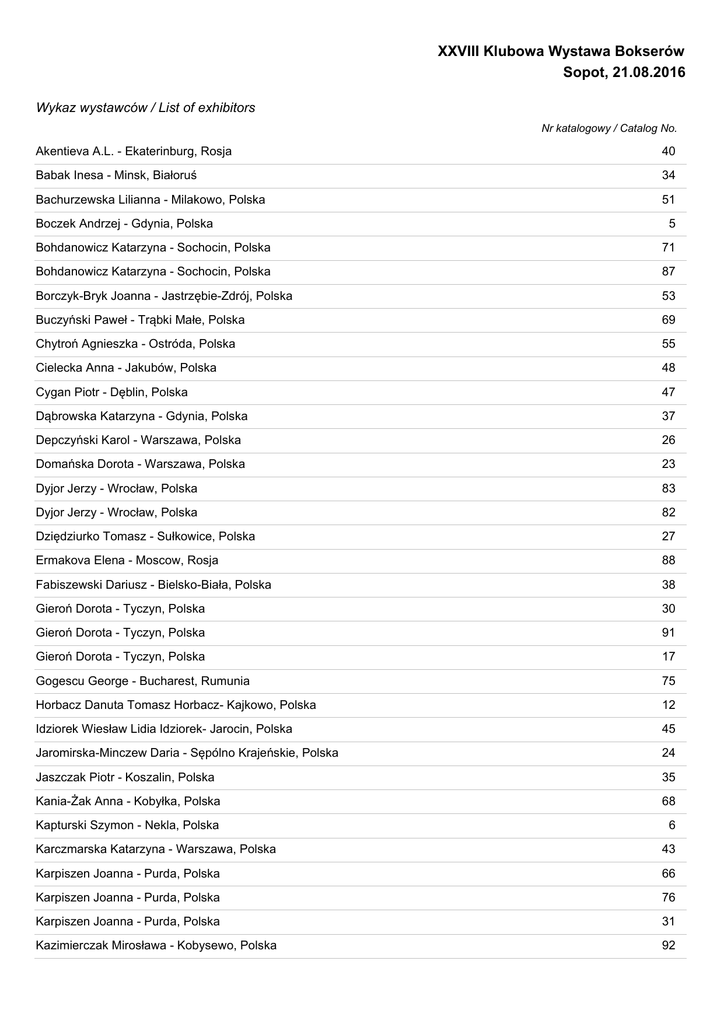 XXVIII Klubowa Wystawa Bokserów Sopot, 21.08.2016 Wykaz wystawców / List of exhibitors Nr katalogowy / Catalog No. Akentieva A.L. - Ekaterinburg, Rosja 40 Babak Inesa - Minsk, Białoruś 34 Bachurzewska Lilianna - Milakowo, Polska 51 Boczek Andrzej - Gdynia, Polska 5 Bohdanowicz Katarzyna - Sochocin, Polska 71 Bohdanowicz Katarzyna - Sochocin, Polska 87 Borczyk-Bryk Joanna - Jastrzębie-Zdrój, Polska 53 Buczyński Paweł - Trąbki Małe, Polska 69 Chytroń Agnieszka - Ostróda, Polska 55 Cielecka Anna - Jakubów, Polska 48 Cygan Piotr - Dęblin, Polska 47 Dąbrowska Katarzyna - Gdynia, Polska 37 Depczyński Karol - Warszawa, Polska 26 Domańska Dorota - Warszawa, Polska 23 Dyjor Jerzy - Wrocław, Polska 83 Dyjor Jerzy - Wrocław, Polska 82 Dziędziurko Tomasz - Sułkowice, Polska 27 Ermakova Elena - Moscow, Rosja 88 Fabiszewski Dariusz - Bielsko-Biała, Polska 38 Gieroń Dorota - Tyczyn, Polska 30 Gieroń Dorota - Tyczyn, Polska 91 Gieroń Dorota - Tyczyn, Polska 17 Gogescu George - Bucharest, Rumunia 75 Horbacz Danuta Tomasz Horbacz- Kajkowo, Polska 12 Idziorek Wiesław Lidia Idziorek- Jarocin, Polska 45 Jaromirska-Minczew Daria - Sępólno Krajeńskie, Polska 24 Jaszczak Piotr - Koszalin, Polska 35 Kania-Żak Anna - Kobyłka, Polska 68 Kapturski Szymon - Nekla, Polska 6 Karczmarska Katarzyna - Warszawa, Polska 43 Karpiszen Joanna - Purda, Polska 66 Karpiszen Joanna - Purda, Polska 76 Karpiszen Joanna - Purda, Polska 31 Kazimierczak Mirosława - Kobysewo, Polska 92 Kiełkiewicz Agnieszka - Wiązowna, Polska 65 Kivi-Paju Elen Merike Kivi- Tartu, Estonia 57 Kivi-Paju Elen Kristiina Ilja- Tartu, Estonia 98 Kivi-Paju Elen - Tartu, Estonia 74 Klimkiewicz Jakub - Gdańsk, Polska Kokna Frantisek Ivana Bukovanska- Brno, Czechy 9 101 Kolbasina Olga - St-Petersburg, Rosja 41 Kolbasina Olga - St-Petersburg, Rosja 79 Kolbasina Olga - St-Petersburg, Rosja 10 Kryszkiewicz Patrycja - Brzozów, Polska 102 Kuusma Katrin - Tartu, Estonia 13 Lewandowska Anna - Mielno, Polska 44 Macioszczyk Magdalena - Ostrów Wielkopolski, Polska 8 Marcandalli Roberto - Berlin, Niemcy 11 Markiewicz Jarosław - Mełno, Polska 50 Martyniuk Tomasz - Rakowiska, Polska Matura Mira Małgorzata Pawlak- Lichnowy, Polska 1 104 Misiarz Marlena - Sułów, Polska 96 Misiarz Marlena - Sułów, Polska 42 Misiarz Marlena - Sułów, Polska 100 Modzelewska Anna - Gdańsk, Polska 46 Modzelewska Małgorzata - Ciechanów, Polska 61 Modzelewska Małgorzata - Gdynia, Polska 2 Modzelewska Małgorzata - Ciechanów, Polska 25 Niedźwiecka Marta - Koszalin, Polska 32 Niedźwiedź Martyna - Katowice, Polska 36 Nommemaa Mari - Tartu, Estonia 52 Nommemaa Mari Taavi Tuvike- Tartu, Estonia 80 Olbratowski Piotr - Pomiechówek, Polska 18 Osipenko Igors - Riga, Łotwa 77 Osipenko Igors - Riga, Łotwa 19 Pasternak Patrycja - Mielno, Polska 93 Paszko Marcin - Otwock Mały, Polska 70 Pawlak Małgorzata - Luboń, Polska 89 Pawlak Małgorzata - Luboń, Polska 84 Pawlak Małgorzata Piotr Pawlak- Luboń, Polska 105 Pawlak Małgorzata - Luboń, Polska 106 Płachta Andrzej - Darłowo, Polska 78 Płachta Andrzej - Darłowo, Polska 56 Pryamilova Anna - Minsk, Białoruś 95 Pyżalska Paulina - Poznań, Polska 49 Riedel Ulrike - Waldenburgs, Niemcy 4 Rogowska Kinga - Ujazd, Polska 39 Roovet Kristin - Tallinn, Estonia 97 Roovet Kristin - Tallinn, Estonia 103 Sandecki Bartosz - Świnoujście, Polska 85 Siegmuller Agata Anna Cielecka- Warlubie, Polska 63 Skowrońska Maria - Toruń, Polska 14 Slepova Anna - Moscow, Rosja 73 Stahanova Maria - Dreilini, Łotwa 3 Stefaniak Justyna - Urad, Polska 86 Stefaniak Justyna - Urad, Polska 99 Stoboran Florin Mihai - Oradea, Rumunia 28 Stoboran Florin Mihai - Oradea, Rumunia 15 Szeglowski Adam - Czyżowice, Polska 29 Szymla Ewa - Mińsk Mazowiecki, Polska 60 Teisseyre Joanna - Gdańsk, Polska 72 Teisseyre Joanna - Gdańsk, Polska 21 Teisseyre Joanna - Gdańsk, Polska 64 Tkocz-Kamieniorz Teresa - Rybnik, Polska 22 Tkocz-Kamieniorz Teresa - Rybnik, Polska 7 Tomczyk Izabela - Warszawa, Polska 16 Tsurkanenko N. - Moscow, Rosja 62 Turzyńska-Schulz Urszula Maciej Schulz- Gdynia, Polska 54 Ulpe Undija - Ropazi, Łotwa 94 Wiśniewska Ewa - Marki, Polska 59 Yakimova Natalia - Kaliningrad, Rosja 58 Yakimova Natalia - Kaliningrad, Rosja 67 Yakimova Natalia - Kaliningrad, Rosja 90 Zawistowska Dorota - Szczecin, Polska 81 Zawistowski Adam Marina Sokolowa- Łapy, Polska 20 Żółkiewicz Katarzyna Kamil Każewski- Zblewo, Polska 33