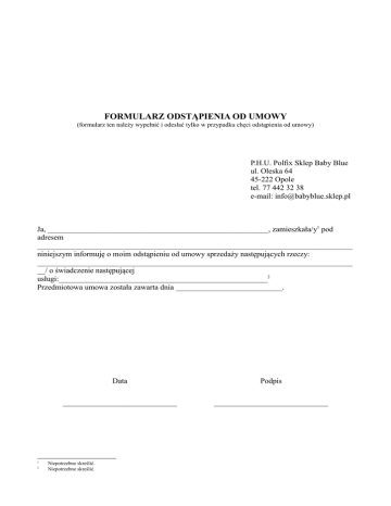 FORMULARZ ODSTĄPIENIA OD UMOWY (formularz ten należy wypełnić i odesłać tylko w przypadku chęci odstąpienia od umowy) P.H.U. Polfix Sklep Baby Blue ul. Oleska 64 45-222 Opole tel. 77 442 32 38 e-mail: [email protected] Ja, ________________________________________________________, zamieszkała/y1 pod adresem ________________________________________________________________________________ niniejszym informuję o moim odstąpieniu od umowy sprzedaży następujących rzeczy: ________________________________________________________________________________ __/ o świadczenie następującej usługi:_____________________________________________________2 Przedmiotowa umowa została zawarta dnia ___________________________. 1 2 Data Podpis _____________________________ _____________________________ Niepotrzebne skreślić. Niepotrzebne skreślić.